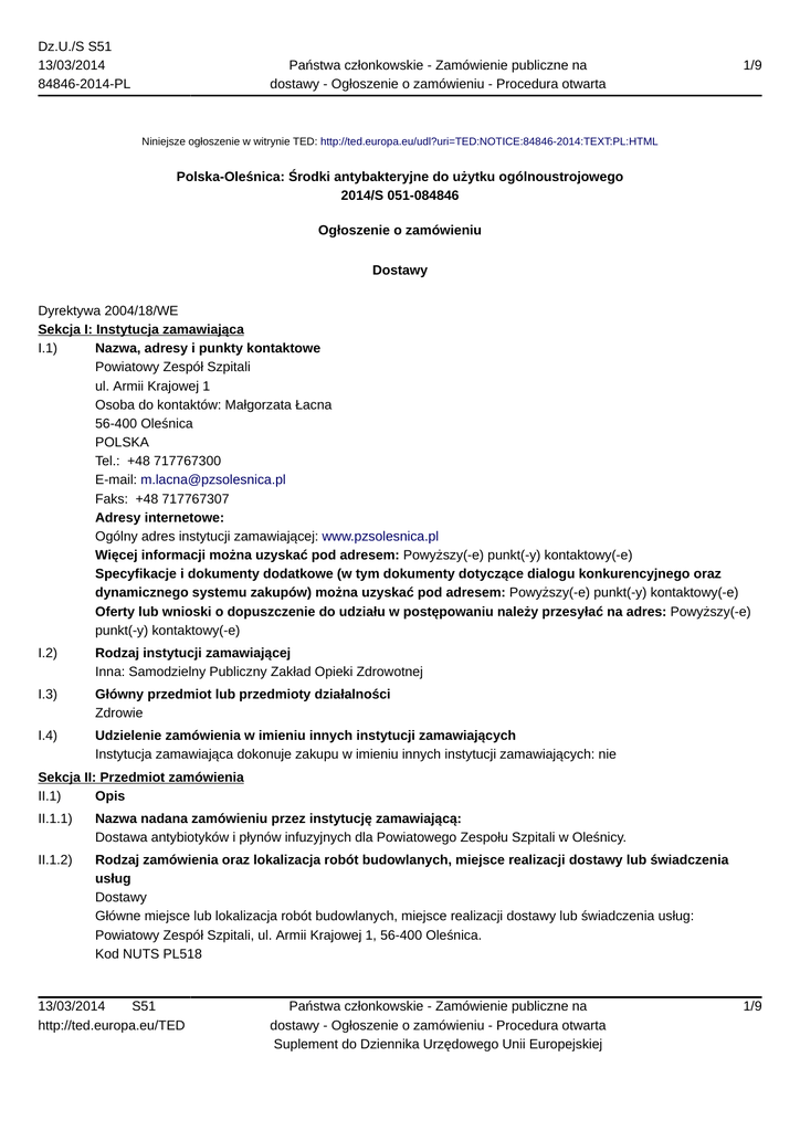 Dz.U./S S51 13/03/2014 84846-2014-PL Państwa członkowskie - Zamówienie publiczne na dostawy - Ogłoszenie o zamówieniu - Procedura otwarta 1/9 Niniejsze ogłoszenie w witrynie TED: http://ted.europa.eu/udl?uri=TED:NOTICE:84846-2014:TEXT:PL:HTML Polska-Oleśnica: Środki antybakteryjne do użytku ogólnoustrojowego 2014/S 051-084846 Ogłoszenie o zamówieniu Dostawy Dyrektywa 2004/18/WE Sekcja I: Instytucja zamawiająca I.1) Nazwa, adresy i punkty kontaktowe Powiatowy Zespół Szpitali ul. Armii Krajowej 1 Osoba do kontaktów: Małgorzata Łacna 56-400 Oleśnica POLSKA Tel.: +48 717767300 E-mail: [email protected] Faks: +48 717767307 Adresy internetowe: Ogólny adres instytucji zamawiającej: www.pzsolesnica.pl Więcej informacji można uzyskać pod adresem: Powyższy(-e) punkt(-y) kontaktowy(-e) Specyfikacje i dokumenty dodatkowe (w tym dokumenty dotyczące dialogu konkurencyjnego oraz dynamicznego systemu zakupów) można uzyskać pod adresem: Powyższy(-e) punkt(-y) kontaktowy(-e) Oferty lub wnioski o dopuszczenie do udziału w postępowaniu należy przesyłać na adres: Powyższy(-e) punkt(-y) kontaktowy(-e) I.2) Rodzaj instytucji zamawiającej Inna: Samodzielny Publiczny Zakład Opieki Zdrowotnej I.3) Główny przedmiot lub przedmioty działalności Zdrowie I.4) Udzielenie zamówienia w imieniu innych instytucji zamawiających Instytucja zamawiająca dokonuje zakupu w imieniu innych instytucji zamawiających: nie Sekcja II: Przedmiot zamówienia II.1) Opis II.1.1) Nazwa nadana zamówieniu przez instytucję zamawiającą: Dostawa antybiotyków i płynów infuzyjnych dla Powiatowego Zespołu Szpitali w Oleśnicy. II.1.2) Rodzaj zamówienia oraz lokalizacja robót budowlanych, miejsce realizacji dostawy lub świadczenia usług Dostawy Główne miejsce lub lokalizacja robót budowlanych, miejsce realizacji dostawy lub świadczenia usług: Powiatowy Zespół Szpitali, ul. Armii Krajowej 1, 56-400 Oleśnica. Kod NUTS PL518 13/03/2014 S51 http://ted.europa.eu/TED Państwa członkowskie - Zamówienie publiczne na dostawy - Ogłoszenie o zamówieniu - Procedura otwarta Suplement do Dziennika Urzędowego Unii Europejskiej 1/9 Dz.U./S S51 13/03/2014 84846-2014-PL Państwa członkowskie - Zamówienie publiczne na dostawy - Ogłoszenie o zamówieniu - Procedura otwarta 2/9 II.1.3) Informacje na temat zamówienia publicznego, umowy ramowej lub dynamicznego systemu zakupów (DSZ) Ogłoszenie dotyczy zamówienia publicznego II.1.4) Informacje na temat umowy ramowej II.1.5) Krótki opis zamówienia lub zakupu Przedmiotem zamówienia jest dostawa antybiotyków i płynów infuzyjnych dla Powiatowego Zespołu Szpitali w Oleśnicy. Zamawiający dopuszcza przeliczanie wielkości opakowań stosując zaokrąglenia wynikające z zasad matematycznych. W przypadku przeliczania ze sztuk na opakowania należy podawać pełne ilości opakowań zaokrąglone w górę. W przypadku leków doustnych takich jak tabletki, kapsułki, tabletki powlekane, drażetki, Zamawiający dopuszcza zamianę jednej postaci doustnej na inną w obrębie wymienionych, umieszczając w ofercie proponowaną postać. Jeżeli w trakcie wyceny okaże się, że lek umieszczony w wykazie asortymentowym jest niedostępny na rynku (np. brak produkcji, brak dostaw do kraju, brak rejestru, brak harmonizacji, tymczasowe wstrzymanie produkcji) i nie ma leku równoważnego, należy wycenić ten lek podając ostatnią cenę sprzedaży oraz uwagę z jakiego powodu lek jest niedostępny na rynku. 12 miesięcy od daty podpisania umowy. Realizacja zamówienia będzie się odbywać wg bieżących potrzeb Zamawiającego. Pożądany termin rozpoczęcia realizacji zamówienia dla asortymentu opisanego w pozycjach 62-77 - 22.07.2014 r., dla asortymentu opisanego w pozycjach 1-62 – jak najszybciej. Zamawiający dopuszcza składanie ofert na jedną lub kilka z niżej wymienionych pozycji: Szczegółowy opis przedmiotu zamówienia zawiera załącznik nr 2 do SIWZ. Ampicillin 0,5g x 1 fiol ampicillin 50 Ampicillin 1g x 1 fiol ampicillin 130 Biodacyna 250mg/ml-2ml x 1 fiol amicacin 1400 Biodacyna 125mg/ml-2ml x 1 fiol amicacin 170 Biodacyna 250mg/ml-4ml x 1 fiol amicacin 50 Biofuroksym 0,75g x 1 fiol cefuroxime 900 Biofuroksym 1,5g x 1 fiol cefuroxime 8000 Biotaksym 1g x 1 fiol cefotaxime 10700 Biseptol 480mg x 20 tabl sulfamethoxazolum+trimethoprimum 10 Biseptol 0,2g+0,04G/5ml 100ml zawiesina sulfamethoxazolum+trimethoprimum 5 Biseptol 80mg+16mg/ml-5ml x 10 amp sulfamethoxazolum+trimethoprimum 120 Biseptol 960mg x 10 tabl. sulfamethoxazolum+trimethoprimum 70 Cefazolin 1g x 1fiol cefazoline 1000 Ceftriaxon 1g x 1 fiol ceftriaxone 1300 Cipronex 200mg/100ml x 1 pojemnik 100ml ciprofloxacin 3800 Cipronex 0,25g x 10 tabl ciprofloxacin 10 Cipronex 0,5g x 10 tabl ciprofloxacin 380 Cipronex 100mg/50ml x 1 pojemnik 50ml ciprofloxacin 200 Clindamycin 0,15g/ml-4ml x 5 amp clindamycin 20 Clindamycin 0,15gml -2ml x 5 amp clindamycin 100 Clindamycin 0,3g x 16 tabl clindamycin 20 Colistyn 1mln j.m. x 1 fiol colistin 40 13/03/2014 S51 http://ted.europa.eu/TED Państwa członkowskie - Zamówienie publiczne na dostawy - Ogłoszenie o zamówieniu - Procedura otwarta Suplement do Dziennika Urzędowego Unii Europejskiej 2/9 Dz.U./S S51 13/03/2014 84846-2014-PL Państwa członkowskie - Zamówienie publiczne na dostawy - Ogłoszenie o zamówieniu - Procedura otwarta 3/9 Doxycyclinum 0,1g x 10 kaps. doxycycline 20 Doxycyclinum 0,1g/5ml x 5 amp i.m/i.v. doxycycline 20 Edicin 1g x 1 fiol vancomycin 600 Edicin 0,5g x 1 fiol vancomycin 60 Erythromycinum 0,2g x 16 tabl erythromycine 10 Erythromycinum 0,3g x 1 fiol erythromycine 130 Fortum 1g x 1 fiol ceftazidime 600 Furaginum 0,05g x 30 tabl. furazidin 230 Gentamycin 0,04g/ml-1ml x 10 amp i.m/i.v gentamicin 10 Gentamycin 0,04g/ml-2ml x 10 amp i.m/i.v gentamicin 65 Imecitin 0,5g + 0,5g x 1 fiol imipenem/cilastatin 700 Klabax 0,5g x 14 tabl clarithromycin 20 Klabax 0,250g/5ml 100ml zawiesina clarithromycin 20 Lincocin 0,3g/ml-2ml x 1 fiol 