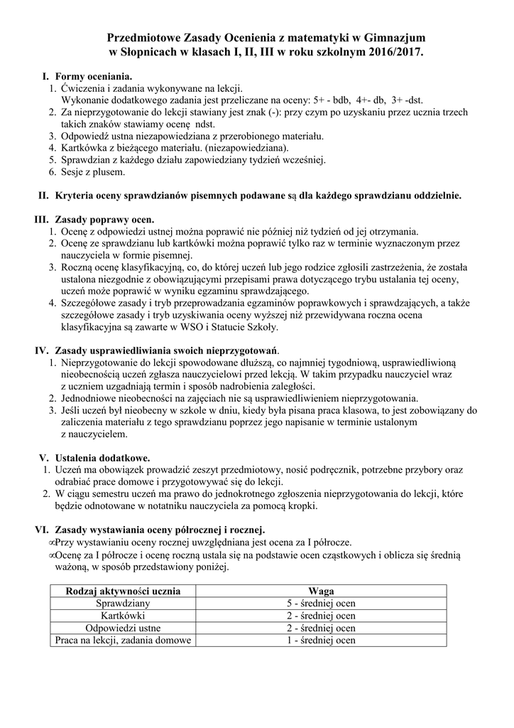 Przedmiotowe Zasady Ocenienia z matematyki w Gimnazjum w Słopnicach w klasach I, II, III w roku szkolnym 2016/2017. I. Formy oceniania. 1. Ćwiczenia i zadania wykonywane na lekcji. Wykonanie dodatkowego zadania jest przeliczane na oceny: 5+ - bdb, 4+- db, 3+ -dst. 2. Za nieprzygotowanie do lekcji stawiany jest znak (-): przy czym po uzyskaniu przez ucznia trzech takich znaków stawiamy ocenę ndst. 3. Odpowiedź ustna niezapowiedziana z przerobionego materiału. 4. Kartkówka z bieżącego materiału. (niezapowiedziana). 5. Sprawdzian z każdego działu zapowiedziany tydzień wcześniej. 6. Sesje z plusem. II. Kryteria oceny sprawdzianów pisemnych podawane są dla każdego sprawdzianu oddzielnie. III. Zasady poprawy ocen. 1. Ocenę z odpowiedzi ustnej można poprawić nie później niż tydzień od jej otrzymania. 2. Ocenę ze sprawdzianu lub kartkówki można poprawić tylko raz w terminie wyznaczonym przez nauczyciela w formie pisemnej. 3. Roczną ocenę klasyfikacyjną, co, do której uczeń lub jego rodzice zgłosili zastrzeżenia, że została ustalona niezgodnie z obowiązującymi przepisami prawa dotyczącego trybu ustalania tej oceny, uczeń może poprawić w wyniku egzaminu sprawdzającego. 4. Szczegółowe zasady i tryb przeprowadzania egzaminów poprawkowych i sprawdzających, a także szczegółowe zasady i tryb uzyskiwania oceny wyższej niż przewidywana roczna ocena klasyfikacyjna są zawarte w WSO i Statucie Szkoły. IV. Zasady usprawiedliwiania swoich nieprzygotowań. 1. Nieprzygotowanie do lekcji spowodowane dłuższą, co najmniej tygodniową, usprawiedliwioną nieobecnością uczeń zgłasza nauczycielowi przed lekcją. W takim przypadku nauczyciel wraz z uczniem uzgadniają termin i sposób nadrobienia zaległości. 2. Jednodniowe nieobecności na zajęciach nie są usprawiedliwieniem nieprzygotowania. 3. Jeśli uczeń był nieobecny w szkole w dniu, kiedy była pisana praca klasowa, to jest zobowiązany do zaliczenia materiału z tego sprawdzianu poprzez jego napisanie w terminie ustalonym z nauczycielem. V. Ustalenia dodatkowe. 1. Uczeń ma obowiązek prowadzić zeszyt przedmiotowy, nosić podręcznik, potrzebne przybory oraz odrabiać prace domowe i przygotowywać się do lekcji. 2. W ciągu semestru uczeń ma prawo do jednokrotnego zgłoszenia nieprzygotowania do lekcji, które będzie odnotowane w notatniku nauczyciela za pomocą kropki. VI. Zasady wystawiania oceny półrocznej i rocznej. • Przy wystawianiu oceny rocznej uwzględniana jest ocena za I półrocze. • Ocenę za I półrocze i ocenę roczną ustala się na podstawie ocen cząstkowych i oblicza się średnią ważoną, w sposób przedstawiony poniżej. Rodzaj aktywności ucznia Sprawdziany Kartkówki Odpowiedzi ustne Praca na lekcji, zadania domowe Waga 5 - średniej ocen 2 - średniej ocen 2 - średniej ocen 1 - średniej ocen Ocenę wyraża się stopniem według następującej skali: Celujący: cel ≥ 5,6 Bardzo dobry: 4,7≤bdb<5,6 Dobry: 3,7≤db<4,7 Dostateczny: 2,7≤dst<3,7 Dopuszczający: 1,6≤dop<2,7 Niedostateczny: 1≤ndst.<1,6 Średnia ważona nie jest decydującym narzędziem podczas wystawiania ocen. Brane są pod uwagę zaangażowanie i zdolności indywidualne każdego ucznia. Kryteria oceniania z matematyki 1. Ocenę dopuszczającą otrzymuje uczeń, który: - intuicyjnie rozumie pojęcia matematyczne, - zna nazwy matematyczne, - potrafi podać przykłady do tych pojęć, - intuicyjnie rozumie poznane twierdzenia i zasady matematyczne, - zna symbole matematyczne, - potrafi wskazać dane i niewiadome, - wykonuje rysunki do zadań, - tworzy z pomocą nauczyciela proste teksty w stylu matematycznym, - odczytuje z pomocą nauczyciela dane z prostych tekstów, diagramów, rysunków i tabel, - zna zasady stosowania podstawowych algorytmów do rozwiązywania zadań i stosuje je z pomocą nauczyciela, - stosuje umiejętności matematyczne do rozwiązywania problemów praktycznych z pomocą nauczyciela. 2. Ocenę dostateczną otrzymuje uczeń, który: - potrafi stosować twierdzenia w typowych zadaniach, - potrafi podać przykład potwierdzający prawdziwość twierdzenia, - potrafi naśladować podane rozwiązania w analogicznych sytuacjach, - tworzy proste teksty w stylu matematycznym, - odczytuje dane z prostych tekstów, diagramów, rysunków i tabel, - stosuje podstawowe algorytmy w typowych zadaniach, - stosuje matematyczne umiejętności do rozwiązywania typowych problemów praktycznych, - prezentuje wyniki swojej pracy w sposób jednolity, wybrany przez nauczyciela, - stara się rozumieć zadany problem. 3. Ocenę dobrą otrzymuje uczeń, który. - potrafi formułować definicję i zapisać ją - operuje pojęciami matematycznymi i stosuje je, - potrafi sformułować proste twierdzenie, - potrafi przeprowadzić proste wnioskowanie, - analizuje treść zadań oraz układa plan ich zadania, - tworzy teksty o stylu matematycznym, - odczytuje dane z tekstów, diagramów, rysunków i tabel, - stosuje algorytmy w sposób efektywny, - potrafi sprawdzić wynik po ich zastosowaniu, - stosuje umiejętności matematyczne do rozwiązywania różnych problemów praktycznych, - prezentuje wynik swojej pracy na różne sposoby, nie zawsze dobrze dobrane do problemu, - zadaje pytania związane z problemem. 4. Ocenę bardzo dobrą otrzymuje uczeń, który: - umie klasyfikować pojęcia, - podaje szczególne przypadki, - uzasadnia twierdzenia w nieskomplikowanych przypadkach, - stosuje uogólnienia i analogie do formułowania hipotez, - umie analizować i doskonalić swoje rozwiązania, - samodzielnie potrafi formułować twierdzenia i definicje, - odczytuje i porównuje dane z tekstów, diagramów, rysunków, tabel i wykresów, - stosuje algorytmy uwzględniając nietypowe rozwiązania, - stosuje umiejętności matematyczne do rozwiązywania nietypowych problemów z innych dziedzin, - prezentuje wyniki swojej pracy we właściwy wybrany przez siebie sposób, - wskazuje pomysły na rozwiązani