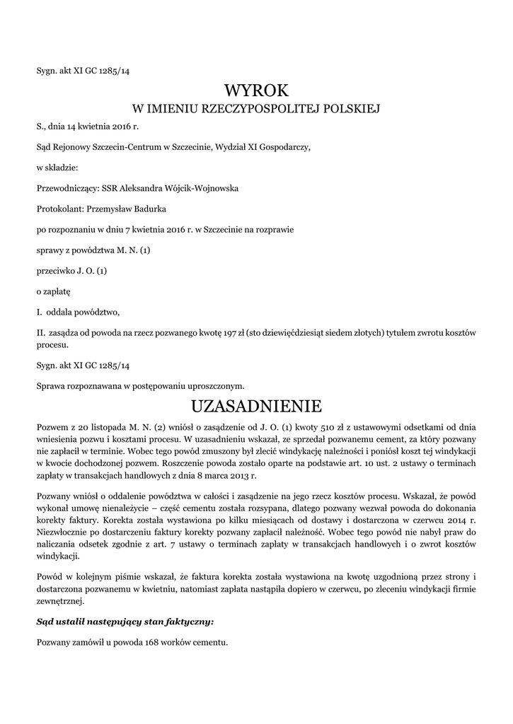 Sygn. akt XI GC 1285/14 WYROK W IMIENIU RZECZYPOSPOLITEJ POLSKIEJ S., dnia 14 kwietnia 2016 r. Sąd Rejonowy Szczecin-Centrum w Szczecinie, Wydział XI Gospodarczy, w składzie: Przewodniczący: SSR Aleksandra Wójcik-Wojnowska Protokolant: Przemysław Badurka po rozpoznaniu w dniu 7 kwietnia 2016 r. w Szczecinie na rozprawie sprawy z powództwa M. N. (1) przeciwko J. O. (1) o zapłatę I. oddala powództwo, II. zasądza od powoda na rzecz pozwanego kwotę 197 zł (sto dziewięćdziesiąt siedem złotych) tytułem zwrotu kosztów procesu. Sygn. akt XI GC 1285/14 Sprawa rozpoznawana w postępowaniu uproszczonym. UZASADNIENIE Pozwem z 20 listopada M. N. (2) wniósł o zasądzenie od J. O. (1) kwoty 510 zł z ustawowymi odsetkami od dnia wniesienia pozwu i kosztami procesu. W uzasadnieniu wskazał, ze sprzedał pozwanemu cement, za który pozwany nie zapłacił w terminie. Wobec tego powód zmuszony był zlecić windykację należności i poniósł koszt tej windykacji w kwocie dochodzonej pozwem. Roszczenie powoda zostało oparte na podstawie art. 10 ust. 2 ustawy o terminach zapłaty w transakcjach handlowych z dnia 8 marca 2013 r. Pozwany wniósł o oddalenie powództwa w całości i zasądzenie na jego rzecz kosztów procesu. Wskazał, że powód wykonał umowę nienależycie – część cementu została rozsypana, dlatego pozwany wezwał powoda do dokonania korekty faktury. Korekta została wystawiona po kilku miesiącach od dostawy i dostarczona w czerwcu 2014 r. Niezwłocznie po dostarczeniu faktury korekty pozwany zapłacił należność. Wobec tego powód nie nabył praw do naliczania odsetek zgodnie z art. 7 ustawy o terminach zapłaty w transakcjach handlowych i o zwrot kosztów windykacji. Powód w kolejnym piśmie wskazał, że faktura korekta została wystawiona na kwotę uzgodnioną przez strony i dostarczona pozwanemu w kwietniu, natomiast zapłata nastąpiła dopiero w czerwcu, po zleceniu windykacji firmie zewnętrznej. Sąd ustalił następujący stan faktyczny: Pozwany zamówił u powoda 168 worków cementu. Niesporne Powód dostarczył pozwanemu cement własnym transportem, przy rozładunku wykonywanym przez pracownika powoda (kierowcę) jedna z palet pękła i worki z cementem się rozsypały. Na palecie znajduje się 56 worków. Około 1/3 worków z tej palety uległa uszkodzeniu, cement wysypał się. Kierowca uzgodnił z pozwanym, że cena za ten cement będzie obniżona. Rozsypany cement został zabrany przez pracowników powoda. Dowód: zeznania S. M. w części k. 120-121 Zeznania K. (...) k. 84-85 Zeznania pozwanego J. O. k. 85-86 W dniu 28 lutego 2014 r. powód wystawił pozwanemu fakturę za 168 worków z cementem wraz z usługą transportową i rozładunkiem na kwotę 1741,50 zł, z terminem płatności 14.03.2014 r. Pozwany po otrzymaniu tej faktury oczekiwał, że należność zostanie obniżona o cały zniszczony cement, żona pozwanego dzwoniła w tej sprawie do powoda. Dowód: faktura k. 21 Zeznania K. (...) k. 84-85 Zeznania pozwanego J. O. k. 86-87 W dniu 15 kwietnia 2014 r. powód wystawił korektę do powyższej faktury, obniżając całość należności o 57,12 zł. Dowód: faktura korekta k. 22 Faktura korekta została dostarczona do pozwanego kilka dni po jej wystawieniu. Dowód: zeznania S. M. k. 120-121 Zeznania K. (...) k. 84-85 W czerwcu powód zlecił windykację należności firmie (...). Pismem z 23.06.2014 r. firma ta wezwała pozwanego do zapłaty kwoty 1741,50 zł. Dowód: wezwanie z potwierdzeniem nadania k. 12-15 Pozwany zapłacił powodowi kwotę 1684,38 zł w dniu 27.06.2014 r. Dowód: potwierdzenie przelewu k. 16 Powód został obciążony przez firmę (...) fakturą za windykację należności w kwocie 510 zł netto, zapłacił wskazaną należności i wystawił pozwanemu notę na tę sama kwotę z terminem płatności 7 dni. Dowód: faktura k. 17, potwierdzenie przelewu k. 18, nota k. 19-20 Pismem z 15.10.2014 r. powód wezwał pozwanego do zapłaty kwoty 510 zł. Dowód: wezwanie k. 23-25 Sąd zważył, co następuje: Powództwo jest nieuzasadnione. Roszczenie powoda zostało oparte na podstawie art. 10 ust. 2 ustawy o terminach zapłaty w transakcjach handlowych z dnia 8 marca 2013 r. w brzmieniu sprzed zmiany dokonanej z dniem 1 styczni 2016 r. Zgodnie z art. 10 ust. 1 i 2 wierzycielowi, od dnia nabycia uprawnienia do odsetek, o którym mowa w art. 7 ust. 1 lub art. 8 ust. 1, bez wezwania, przysługuje od dłużnika z tytułu rekompensaty za koszty odzyskiwania należności równowartość kwoty 40 euro przeliczonych na złote według średniego kursu euro ogłoszonego przez Narodowy Bank Polski ostatniego dnia roboczego miesiąca poprzedzającego miesiąc, w którym świadczenie pieniężne stało się wymagalne. W przypadku gdy koszty odzyskiwania należności poniesione z tytułu opóźnień w zapłacie w transakcji handlowej przekroczą kwotę, o której mowa w ust. 1, wierzycielowi przysługuje zwrot tych kosztów, w tym kosztów postępowania sądowego, pomniejszonych o tę kwotę. Do przesłanek koniecznych uprawniających do uzyskania uprawnienia dochodzenia odsetek na podstawie art. 10 ust. 1 i 2 ww. ustawy należą, zgodnie z art. 7 ust. 1: • spełnienie swojego świadczenia przez wierzyciela • nieuzyskanie zapłaty przez wierzyciela w terminie określonym w umowie albo w wezwaniu. W niniejszej sprawie podkreślenia wymaga, że powód nie wykonał swojego zobowiązania należycie i w całości w trakcie dostawy pozwanemu zamówionego cementu pracownik powoda wysypał całą paletę worków, z których uszkodzeniu uległo ok. 20 worków (żona pozwanego podała ilość 20-30 sztuk, pracownik powoda podał 1/3 z palety, na której mieści się 58 worków, wobec tego ilość uszkodzoną należało ustalić na 20 worków), które po wysypaniu nie nadawały się do wykorzystania zgodnie z ich przeznaczeniem. Pracownik powoda zeznał wprawdzie, że cement mógł być pozbierany przez pozwanego i że doszło do takiego