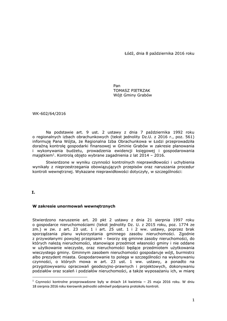 Łódź, dnia 8 października 2016 roku Pan TOMASZ PIETRZAK Wójt Gminy Grabów WK-602/64/2016 Na podstawie art. 9 ust. 2 ustawy z dnia 7 października 1992 roku o regionalnych izbach obrachunkowych (tekst jednolity Dz.U. z 2016 r., poz. 561) informuję Pana Wójta, że Regionalna Izba Obrachunkowa w Łodzi przeprowadziła doraźną kontrolę gospodarki finansowej w Gminie Grabów w zakresie planowania i wykonywania budżetu, prowadzenia ewidencji księgowej i gospodarowania majątkiem1. Kontrolą objęto wybrane zagadnienia z lat 2014 – 2016. Stwierdzone w wyniku czynności kontrolnych nieprawidłowości i uchybienia wynikały z nieprzestrzegania obowiązujących przepisów oraz naruszania procedur kontroli wewnętrznej. Wykazane nieprawidłowości dotyczyły, w szczególności: I. W zakresie unormowań wewnętrznych Stwierdzono naruszenie art. 20 pkt 2 ustawy z dnia 21 sierpnia 1997 roku o gospodarce nieruchomościami (tekst jednolity Dz. U. z 2015 roku, poz. 1774 ze zm.) w zw. z art. 23 ust. 1 i art. 25 ust. 1 i 2 ww. ustawy, poprzez brak sporządzania planu wykorzystania gminnego zasobu nieruchomości. Zgodnie z przywołanymi powyżej przepisami - tworzy się gminne zasoby nieruchomości, do których należą nieruchomości, stanowiące przedmiot własności gminy i nie oddane w użytkowanie wieczyste, oraz nieruchomości będące przedmiotem użytkowania wieczystego gminy. Gminnym zasobem nieruchomości gospodaruje wójt, burmistrz albo prezydent miasta. Gospodarowanie to polega w szczególności na wykonywaniu czynności, o których mowa w art. 23 ust. 1 ww. ustawy, a ponadto na przygotowywaniu opracowań geodezyjno-prawnych i projektowych, dokonywaniu podziałów oraz scaleń i podziałów nieruchomości, a także wyposażaniu ich, w miarę 1 Czynności kontrolne przeprowadzone były w dniach 14 kwietnia – 25 maja 2016 roku. W dniu 18 sierpnia 2016 roku kierownik jednostki odmówił podpisania protokołu kontroli. 1 możliwości w niezbędne urządzenia infrastruktury technicznej, stosownie do art. 25 ust. 1 i 2 ww. ustawy. Z kolei do czynności, o których mowa w art. 23 ust. 1 ustawy o gospodarce nieruchomościami należy m.in. sporządzanie planu wykorzystania zasobu, który opracowywany jest na okres 3 lat i zawiera w szczególności: [1] zestawienie powierzchni nieruchomości zasobu oraz nieruchomości Skarbu Państwa oddanych w użytkowanie wieczyste, [2] prognozę dotyczącą: 1) udostępniania nieruchomości zasobu oraz nabywania nieruchomości do zasobu, 2) poziomu wydatków związanych z udostępnieniem nieruchomości z zasobu oraz nabywaniem nieruchomości do zasobu, 3) wpływów osiąganych z opłat z tytułu użytkowania wieczystego nieruchomości Skarbu Państwa oddanych w użytkowanie wieczyste oraz opłat z tytułu trwałego zarządu nieruchomości Skarbu Państwa, 4) aktualizacji opłat z tytułu użytkowania wieczystego nieruchomości Skarbu Państwa oddanych w użytkowanie wieczyste oraz opłat z tytułu trwałego zarządu nieruchomości Skarbu Państwa; [3] program zagospodarowania nieruchomości zasobu. W zakresie kredytów i pożyczek Stwierdzono przypadki nieterminowego bądź nienależytego (zaniżona kwota) regulowania zobowiązań z tytułu odsetek od zaciągniętych pożyczek: [1] zgodnie z aktualnym harmonogramem spłaty pożyczki nr 432/OA/PD/2012 rata odsetek za listopad 2014 roku wynosiła 125,27 zł – płatne w terminie do 10 listopada 2014 roku. Gmina Grabów w dniu 6 listopada dokonała spłaty 120,71 zł. W harmonogramie przedłożonym przez pracownika Referatu Finansowego odręcznie zanotowano zmianę wysokości odsetek z kwoty 125,27 zł na 120,71 zł, nie przedstawiając innych dokumentów uzasadniających przedmiotową zmianę, informując jednocześnie, że pracownik dokonujący korekty nie pracuje już w Urzędzie Gminy Grabów. [2] odsetki dla pożyczek nr 683/GW/PD/2014, 199/GW/P/2012, 432/OA/PD/2012 oraz nr 174/GW/PD/2012 zapłacone zostały z miesięcznym opóźnieniem: umowny termin zapłaty odsetek ustalono do 10 maja 2015 roku, natomiast płatności dokonano w dniu 10 czerwca 2015 roku, wraz z kosztami wezwania 20,00 zł oraz odsetkami. W zakresie ewidencji księgowej 1. Stwierdzono naruszenie § 18 rozporządzenia Ministra Finansów z dnia 5 lipca 2010 roku w sprawie szczególnych zasad rachunkowości oraz planów kont dla budżetu państwa, budżetów jednostek samorządu terytorialnego, jednostek budżetowych, samorządowych zakładów budżetowych, państwowych funduszy celowych oraz państwowych jednostek budżetowych mających siedzibę poza granicami Rzeczypospolitej Polskiej (tekst jednolity Dz.U. z 2013 r., poz. 289), poprzez niezamknięcie w wymaganym terminie ksiąg rachunkowych. Jak ustalono na dzień 15 kwietnia 2016 roku nie były zamknięte księgi za 2014 rok. Księgi zamknięte zostały w trakcie kontroli, w dniu 15 kwietnia 2016 roku. Jednocześnie stosownie do ww. regulacji - rokiem obrotowym jest rok budżetowy, okresem sprawozdawczym jest miesiąc, a ostateczne zamknięcie i otwarcie ksiąg rachunkowych jednostki i placówki kontynuującej działalności powinno nastąpić do dnia 30 kwietnia roku następnego, a w jednostkach, których sprawozdanie finansowe podlega zatwierdzeniu, w ciągu 15 dni od dnia zatwierdzenia sprawozdania finansowego za rok obrotowy. Zamknięcie ksiąg rachunkowych, zgodnie z art. 12 ust. 5 ustawy z dnia 29 września 1994 roku o rachunkowości (tekst jednolity Dz. U. z 2016 r., poz. 1047 ze zm.), polega na nieodwracalnym wyłączeniu możliwości dokonywania zapisów księgowych w zbiorach tworzących zamknięte księgi rachunkowe, z uwzględnieniem art. 13 ust. 2 i 3 ww. ustawy. 2 2. Zagadnienia dotyczące rachunkowości w Gminie Grabów regulowało zarządzenie nr 95 Wójta Gminy Grabów z dnia 23 maja 2013 roku w sprawie wprowadzenia zasad polityki rachunkowości w Urzędzie Gminy Grabów. Podczas czynności kontrolnych kontrolującym okazano łącznie 8 dokumentów w tym trzy a