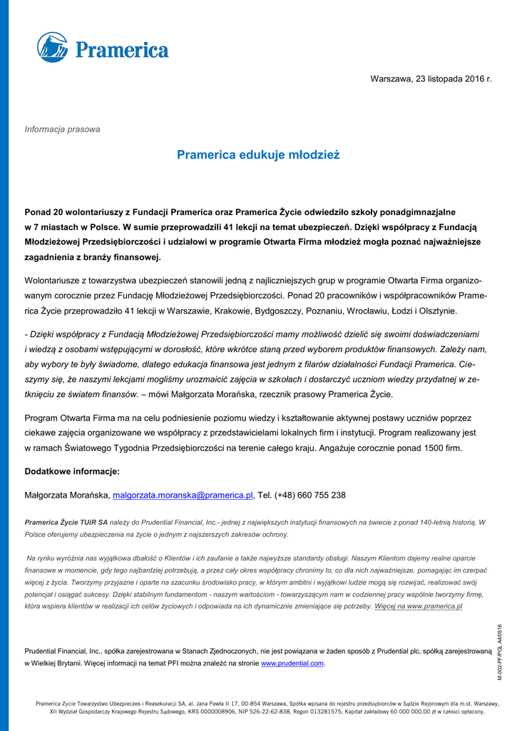 Warszawa, 23 listopada 2016 r. Informacja prasowa Pramerica edukuje młodzież Ponad 20 wolontariuszy z Fundacji Pramerica oraz Pramerica Życie odwiedziło szkoły ponadgimnazjalne w 7 miastach w Polsce. W sumie przeprowadzili 41 lekcji na temat ubezpieczeń. Dzięki współpracy z Fundacją Młodzieżowej Przedsiębiorczości i udziałowi w programie Otwarta Firma młodzież mogła poznać najważniejsze zagadnienia z branży finansowej. Wolontariusze z towarzystwa ubezpieczeń stanowili jedną z najliczniejszych grup w programie Otwarta Firma organizowanym corocznie przez Fundację Młodzieżowej Przedsiębiorczości. Ponad 20 pracowników i współpracowników Pramerica Życie przeprowadziło 41 lekcji w Warszawie, Krakowie, Bydgoszczy, Poznaniu, Wrocławiu, Łodzi i Olsztynie. - Dzięki współpracy z Fundacją Młodzieżowej Przedsiębiorczości mamy możliwość dzielić się swoimi doświadczeniami i wiedzą z osobami wstępującymi w dorosłość, które wkrótce staną przed wyborem produktów finansowych. Zależy nam, aby wybory te były świadome, dlatego edukacja finansowa jest jednym z filarów działalności Fundacji Pramerica. Cieszymy się, że naszymi lekcjami mogliśmy urozmaicić zajęcia w szkołach i dostarczyć uczniom wiedzy przydatnej w zetknięciu ze światem finansów. – mówi Małgorzata Morańska, rzecznik prasowy Pramerica Życie. Program Otwarta Firma ma na celu podniesienie poziomu wiedzy i kształtowanie aktywnej postawy uczniów poprzez ciekawe zajęcia organizowane we współpracy z przedstawicielami lokalnych firm i instytucji. Program realizowany jest w ramach Światowego Tygodnia Przedsiębiorczości na terenie całego kraju. Angażuje corocznie ponad 1500 firm. Dodatkowe informacje: Małgorzata Morańska, [email protected], Tel. (+48) 660 755 238 Pramerica Życie TUiR SA należy do Prudential Financial, Inc.- jednej z największych instytucji finansowych na świecie z ponad 140-letnią historią. W Polsce oferujemy ubezpieczenia na życie o jednym z najszerszych zakresów ochrony. Na rynku wyróżnia nas wyjątkowa dbałość o Klientów i ich zaufanie a także najwyższe standardy obsługi. Naszym Klientom dajemy realne oparcie finansowe w momencie, gdy tego najbardziej potrzebują, a przez cały okres współpracy chronimy to, co dla nich najważniejsze, pomagając im czerpać więcej z życia. Tworzymy przyjazne i oparte na szacunku środowisko pracy, w którym ambitni i wyjątkowi ludzie mogą się rozwijać, realizować swój potencjał i osiągać sukcesy. Dzięki stabilnym fundamentom - naszym wartościom - towarzyszącym nam w codziennej pracy wspólnie tworzymy firmę, Prudential Financial, Inc., spółka zarejestrowana w Stanach Zjednoczonych, nie jest powiązana w żaden sposób z Prudential plc, spółką zarejestrowaną w Wielkiej Brytanii. Więcej informacji na temat PFI można znaleźć na stronie www.prudential.com. M-002-PF/POL A4/0516 która wspiera klientów w realizacji ich celów życiowych i odpowiada na ich dynamicznie zmieniające się potrzeby. Więcej na www.pramerica.pl Pramerica Życie Towarzystwo Ubezpieczeń i Reasekuracji SA, al. Jana Pawła II 17, 00-854 Warszawa, Spółka wpisana do rejestru przedsiębiorców w Sądzie Rejonowym dla m.st. Warszawy, XII Wydział Gospodarczy Krajowego Rejestru Sądowego, KRS 0000008906, NIP 526-22-62-838, Regon 013281575, Kapitał zakładowy 60 000 000,00 zł w całości opłacony. Fundacja Młodzieżowej Przedsiębiorczości jest pozarządową organizacją pożytku publicznego, której celem jest przygotowanie dzieci i młodzieży do życia w warunkach gospodarki rynkowej oraz umożliwienie młodym ludziom zdobycia wiedzy i praktycznych umiejętności ułatwiających realizację planów zawodowych. Fundacja działa w ramach Junior Achievement Worldwide, najstarsze i najszybciej rozwijającej się na świecie organizacji zajmującej się edukacją ekonomiczną młodzieży, działającej w ponad stu dwudziestu krajach. Dotychczas w programach Fundacji wzięło udział ponad 6,4 miliona uczniów z całej Polski. Więcej informacji na stronie: www.junior.org.pl. 2
