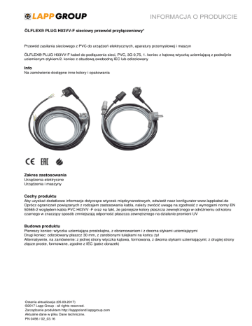 INFORMACJA O PRODUKCIE ÖLFLEX® PLUG H03VV-F sieciowy przewód przyłączeniowy* Przewód zasilania sieciowego z PVC do urządzeń elektrycznych, aparatury przemysłowej i maszyn ÖLFLEX® PLUG H03VV-F kabel do podłączenia sieci, PVC, 3G 0,75, 1. koniec z kątową wtyczką uziemiającą z podwójnie uziemionym stykiem/2. koniec z obudową swobodną IEC lub odizolowany Info Na zamówienie dostępne inne kolory i opakowania Zakres zastosowania Urządzenia elektryczne Urządzenia i maszyny Cechy produktu Aby uzyskać dodatkowe informacje dotyczące wtyczek międzynarodowych, odwiedź nasz konfigurator www.lappkabel.de Oprócz ograniczeń powiązanych z rodzajem zastosowania kabla, należy zwrócić uwagę na zgodność z wymogami normy EN 50565-2 względem kabla PVC H03VV -F oraz na fakt, że jaśniejsze kolory płaszcza zewnętrznego w odróżnieniu od koloru czarnego w znaczący sposób zmniejszają odporność płaszcza zewnętrznego na działanie promieni UV Budowa produktu Pierwszy koniec: wtyczka uziemiająca prostokątna, z obramowaniem i z dwoma stykami uziemiającymi Drugi koniec: odizolowany płaszcz 30 mm, z zarobionymi tulejkami na końcu żył Alternatywnie, na zamówienie: z jednej strony wtyczka kątowa, formowana, z dwoma stykami uziemiającymi; z drugiej strony złącze proste, formowane, zgodne z IEC (patrz obrazek) Ostania aktualizacja (05.03.2017) ©2017 Lapp Group - all rights reserved. Zarządzanie produktem http://lapppoland.lappgroup.com Aktualne dane w pliku Dane techniczne. PN 0456 / 02_03.16 INFORMACJA O PRODUKCIE ÖLFLEX® PLUG H03VV-F sieciowy przewód przyłączeniowy* Dane techniczne Klasyfikacja: Opis klasy ETIM 5.0: EC001576 Opis klasy ETIM 5.0: Kabel zasilający Oznaczenie żył: HD 308/VDE 0293-308: 3-żyłowy z przewodem ochronnym Budowa żyły: Z cienkich drucików zgodnie z VDE 0295 klasa 5/IEC 60228 klasa 5 Napięcie nominalne: U 0 : 250 V AC Napięcie próbne: 2000 V Żyła ochronna: G = z żyłą ochronną żółto - zieloną Zakres temperatury: Połączenia ruchome: od -5°C do +70°C Wskazówka Wszystkie podane wartości dotyczące produktów są wartościami nominalnymi (o ile nie wskazano inaczej). Inne wartości, takie jak np. tolerancje mogą być przedstawione na zamówienie (jeżeli są dostępne i przeznaczone do publikacji). *Produkt handlowy, niewytwarzany przez Lapp Fotografie nie mogą być używane do wymiarowania oraz nie stanowią szczegółowego odwzorowania przedstawionych produktów. * Podane ceny to ceny netto bez podatku VAT i dodatkowych opłat. Sprzedaż klientom biznesowym. Należy przestrzegać informacji bezpieczeństwa zgodnie z DIN VDE 0620-1, Wtyki i gniazdka w gospodarstwach domowych i podobnych – Część 1: Wymogi ogólne, załącznik E: "Montaż może być wykonywany tylko przez osoby posiadające stosowną wiedzę i doświadczenie elektrotechniczne!” Ostania aktualizacja (05.03.2017) ©2017 Lapp Group - all rights reserved. Zarządzanie produktem http://lapppoland.lappgroup.com Aktualne dane w pliku Dane techniczne. PN 0456 / 02_03.16 Powered by TCPDF (www.tcpdf.org) Liczba żył i przekrój [mm²] Kolor Średnica zewnętrzna [mm] Długość [m] Indeks miedzi [kg/1000 sztuk] Pierwszy koniec: wtyczka uziemiająca, kątowa, formowana, z dwoma stykami uziemiającymi Drugi koniec: 30 mm bez izolacji, z tulejkami na końcach żył 70261130 3 G 0,75 czarny 5,4 - 6,8 1,5 32,4 70261131 3 G 0,75 czarny 5,4 - 6,8 2 43,2 70261132 3 G 0,75 czarny 5,4 - 6,8 3 64,8 70261136 3 G 0,75 szary 5,4 - 6,8 1,5 32,4 70261137 3 G 0,75 szary 5,4 - 6,8 2 43,2 70261138 3 G 0,75 szary 5,4 - 6,8 3 64,8 70261133 3 G 0,75 biały 5,4 - 6,8 1,5 32,4 70261134 3 G 0,75 biały 5,4 - 6,8 2 43,2 70261135 3 G 0,75 biały 5,4 - 6,8 3 64,8 ÖLFLEX® PLUG H03VV-F sieciowy przewód przyłączeniowy* Ostania aktualizacja (05.03.2017) ©2017 Lapp Group - all rights reserved. Zarządzanie produktem http://lapppoland.lappgroup.com Aktualne dane w pliku Dane techniczne. PN 0456 / 02_03.16 INFORMACJA O PRODUKCIE Powered by TCPDF (www.tcpdf.org) Numer katalogowy