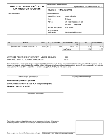 Miejscowość i data sprzedaży ZWROT VAT DLA PODRÓŻNYCH TAX FREE FOR TOURISTS Dane sprzedawcy: Częstochowa 09-październik-2013 Numer: 11/MAG/2013 Dane podróżnego: Nazwisko i imię: Jozin z Bazin Kraj: Polska Adres: ul. Nad Moczarami 69 00-111 Lp 1 Nazwa AKOLEKTOR - TOWAR TESTOWY 1 Ilość Morawa Numer paszportu: AN 3000011 Kraj wydania paszportu: Wojewoda Morawski j.m. Cena netto 10,000 szt. Wartość netto 1,00 10,00 OGÓŁEM: WARTOŚĆ PODATKU OD TOWARÓW I USŁUG OGÓŁEM: WARTOŚĆ BRUTTO TOWARÓW OGÓŁEM: VAT [%] 23 VAT Wartość brutto 2,30 12,30 2,30 12,30 2,30 12,30 Dokument stanowi podstawę do ubiegania się przez podróżnych niemających stałego miejsca zamieszkania na terytorium Unii Europejskiej o zwrot podatku od towarów i usług od nabytych towarów, które w stanie nienaruszonym zostały wywiezione poza terytorium Unii Europejskiej - art. 126-130 ustawy z dnia 11 marca 2004 r. o podatku od towarów i usług (Dz. U. Nr 54, poz. 535, z późn. zm.). Czytelny podpis podróżnego Czytelny podpis sprzedającego Forma zwrotu podatku: gotówka Zwrot podatku w kwocie 2,30 PLN otrzymałem (-łam) Słownie: dwa PLN 30/100 Data i podpis podróżnego Potwierdzam tożsamość podróżnego oraz że towary wymienione w dokumencie zostały wywiezione w stanie nienaruszonym poza terytorium Unii Europejskiej. Data, podpis oraz stempel funkcjonariusza celnego Miejscowość i data dokonania wywozu towarów