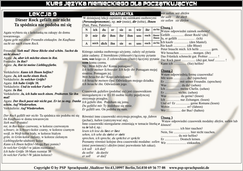 KURS JĘZYKA NIEMIECKIEGO DLA POCZĄTKUJĄCYCH LEKCJA 9 Dieser Rock gefällt mir nicht Ta spódnica nie podoba mi się Gramatyka W dzisiejszej lekcji zajmiemy się zaimkami osobowymi (Personalpronomen), np. mir (mnie), dir (tobie), Ihnen (Pani, Panu, Państwu) N ich du er sie es wir ihr sie/Sie wir sollen wir dürfen ihr sollt ihr dürft sie sollen sie dürfen Übung 1 Wstaw odpowiedni zaimek osobowy! D mir dir ihm ihr ihm uns euch ihnen/ Gefällt ................ dieser Rock? (du) Ihnen Ja, er gefällt .................... . (ich) Ich kaufe .................. (den Mantel). sie/Sie A mich dich ihn sie es uns euch Sie kauft ................ (die Bluse) Peter braucht mich. Ich helfe .............. gern. Freundin: Sieh mal! Diese Röcke sind schön. Suchst du Którego zaimka osobowego użyjemy, zależy od pytania Wir besuchen ................ morgen. (ihr) nicht einen? jakie zadamy. Z biernikiem (Akkusativ) łączymy pytanie Das Früstück schmeckt gut. Probier ........... ! Agata: Ja, aber ich möchte einen in Rot. wen, was kogo co. Z celownikiem (Dativ) łączymy pytanie Der Rock passt ................. (du) gut, kauf ............ ! Freundin: In Rot? wem komu czemu. Kann ich ................ (Sie) helfen? Agata: Ja, Rot ist meine Lieblingsfarbe. Np.: Wem hilfst du? Komu pomagasz? Ich helfe meiner Schwester. Ich helfe ihr. Pomagam mojej Übung 2 Verkäuferin: Kann ich Ihnen helfen? siostrze. Pomagam jej. Wstaw odpowiednią formę czasownika! Agata: Ja, ich suche einen Rock. Wen besuchst du? Kogo odwiedzasz? Mit wem ................ du? (sprechen) Verkäuferin: In welcher Größe? Ich besuche meinen Opa. Odwiedzam mojego dziadka. Er .................. mit seiner Freundin. (sprechen) Agata: Ich habe Größe 38. Ich besuche ihn. Odwiedzam jego. Was ................. du da? (sehen) Verkäuferin: Und in welcher Farbe? Ich ................. meine Chefin. (sehen) Agata: In Rot. Czasownik gefallen (podobać się) jest czasownikiem Er ................ nichts. (sehen) Verkäuferin: Ja, ich habe noch einen. Probieren Sie ihn nieregularnym i w II i III osobie liczby pojedynczej Was ................ du gerne? (lesen) mal! otrzymuje przegłos. Ich ................. nur Zeitungen. (lesen) Agata: Der Rock passt mir nicht gut. Er ist zu eng. Danke Ich gefalle ihm. Podobam się jemu. Und er? Er ................. gerne Romane.(lesen) schön. Auf Wiedersehen. Du gefällst mir. Ty podobasz się mnie. Wohin .................... er? (fahren) Verkäuferin: Auf Wiedersehen. Er gefällt uns. On podoba się nam. Wo .................. der Bus? (halten) Agata wybiera się z koleżanką na zakupy do domu towarowego. Agata geht mit einer Freundin einkaufen. Im Kaufhaus sucht sie nach einem Rock. Der Rock gefällt mir nicht- Ta spódnica nie podoba mi się Im Kaufhaus-w domu towarowym Sieh mal!-Popatrz! rot, in Rot-kolor czerwony, w kolorze czerwonym schwarz, in Schwarz-kolor czarny, w kolorze czarnym weiß, in Weiß-kolor biały, w kolorze białym grün, in Grün-kolor zielony, w kolorze zielonym Lieblingsfarbe-ulubiony kolor Kann ich Ihnen helfen?-Mogę Pani pomóc? In welcher Größe?-w jakim rozmiarze? Ich habe Größe 38-Mam rozmiar 38 In welcher Farbe?-W jakim kolorze? Również inne czasowniki otrzymuja przegłos, np. fahren (jechać), halten (zatrzymywać się), Inne czasowniki nieregularne zmieniają w temacie literkę e na ie lub i, np.: lesen ich lese du liest er liest sehen, ich sehe du siehst er sieht sprechen, ich spreche, du sprichst er spricht Poznamy również kolejne dwa czasowniki modalne: sollen (mieć powinność) i dürfen (mieć pozwolenie lub zakaz). ich soll ich darf du sollst du darfst er soll er darf Übung 3 Wstaw odpowiedni czasownik modalny dürfen, sollen lub können! ....................... ich hier rauchen? Nein, Sie .................... hier nicht rauchen. ..................... du mir helfen? Er .................. Deutsch lernen. Wir ........................ einkaufen. Copyright © by PSP Sprachpunkt ,Skalitzer Str.43,10997 Berlin,Tel.030 69 56 77 08 www.psp-sprachpunkt.de