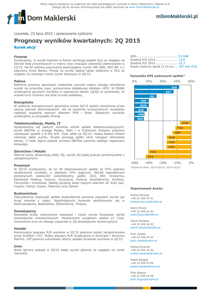 Pełne raporty dostępne są wyłącznie dla osób posiadających rachunki w Domu Maklerskim mBanku S.A. Zaloguj się do serwisu informacyjnego lub załóż rachunek na www.mDomMaklerski.pl czwartek, 23 lipca 2015 | opracowanie cykliczne Prognozy wyników kwartalnych: 2Q 2015 Rynek akcji Finanse Oczekujemy, iż wyniki banków w Polsce zanotują spadek Q/Q ze względu na obniżki stóp procentowych w marcu oraz znaczące zdarzenia jednorazowe w 1Q’15. Na tle sektora pozytywnie postrzegamy wyniki ING BSK, PKO BP, a z zagranicy Erste Banku. Presja na wyniki będzie także widoczna w PZU ze względu na znacząco niższy wynik lokacyjny w 2Q’15. Paliwa WIG........................................ Średnie P/E 2015 ..................... Średnie P/E 2016 ..................... Średni dzienny obrót (3 m-ce) ... Dynamika EPS wybranych spółek* 0% 15% Rafinerie powinny spieniężyć znakomite warunki makro notując rekordowe wyniki na przerobie ropy, wzmocnione dodatkowo efektem LIFO. W PGNiG oczekujemy gorszych wyników w segmencie obrotu (Q/Q) co potwierdzi, że wysoki kurs rynkowy ma dość kruche podstawy. 30% 45% 60% TA R EA T CIE EMT Energetyka W sektorze energetycznym generalna ocena 2Q’15 będzie utrudniona przez szereg zdarzeń jednorazowych, ale na poziomie oczyszczonych rezultatów najlepiej wypadną naszym zdaniem PGE i Enea. Słabszych wyników oczekujemy w przypadku Energi. 51 698 13,9 12,3 787 mln PLN DOM ELB PGN BDX Telekomunikacja, Media, IT BHW Spodziewamy się słabych wyników wśród spółek telekomunikacyjnych: wynik EBITDA w Orange Polska, Netii i w Cyfrowym Polsacie powinien zanotować spadek o 8-9% R/R. Zysk netto za 2Q’15: matka Asseco Poland zanotuje słabe wyniki, Grupie pomogą spółki córki notujące rekordowe obroty. Z kolei Agora pokaże wzrosty EBITDA pomimo słabego repertuaru kinowego. PZU GNB ROB TVN PCM Górnictwo i Metale FA M Obecne kursy dyskontują słaby 3Q, wyniki 2Q będą jeszcze porównywalne z ubiegłorocznymi. Przemysł W 2Q’15 oczekujemy, że na 49 obserwowanych spółek aż 53% poprawi zeszłoroczne rezultaty, a zaledwie 14% pogorszy. Wśród największych pozytywnych zaskoczeń widzielibyśmy spółki: ACE, BSC Drukarnia, Elemental Holding, Feerum, Kruszwica, Pozbud, SecoWarwick, Synthos, Tarczyński i Uniwheels. Słabiej poradzą sobie naszym zdaniem AC Auto Gaz, Cognor, Famur, Kopex, Patentus oraz Zamet. Budownictwo Zdecydowana większość spółek budowlanych powinna poprawić wyniki już drugi kwartał z rzędu. Najsilniejszych dynamik spodziewamy się w Elektrobudowie, Budimeksie, Elektrotimie, Torpolu. Deweloperzy Niewielka liczba rozliczonych mieszkań i niskie wyniki finansowe wśród deweloperów mieszkaniowych. Pozytywnym wyjątkiem będzie LC Corp. Umocnienie euro do złotego wspierało w 2Q deweloperów komercyjnych. Handel Kontynuacja poprawy R/R wyników w 2Q’15 powinna zostać zaraportowana przez AmRest i CCC. Braku poprawy R/R oczekujemy w Eurocash i Jeronimo Martins. LPP powinno odnotować istotny spadek dynamiki wyników w 2Q’15. Inne Work Service pokaże w 2Q’15 słabe wyniki głównie ze względu na rynek niemiecki. KPX -60% -45% -30% -15% *liczone za okres: 3Q’14-2Q’15 / 2Q’14-1Q’15 Departament Analiz: Michał Marczak +48 22 438 24 01 [email protected] Kamil Kliszcz +48 22 438 24 02 [email protected] Jakub Szkopek +48 22 438 24 03 [email protected] Piotr Zybała +48 22 438 24 04 [email protected] Michał Konarski +48 22 438 24 05 [email protected] Paweł Szpigiel +48 22 438 24 06 [email protected] Piotr Bogusz +48 22 438 24 08 [email protected] 0% Spis treści 1. 2. 3. 4. 5. 6. 7. 8. 9. 10. 11. 12. 13. 14. 15. 16. 17. 2 Banki ........................................................................................................................................................................ 3 1.1. BZ WBK ......................................................................................................................................................... 3 1.2. Getin Noble Bank ............................................................................................................................................ 3 1.3. Handlowy ....................................................................................................................................................... 4 1.4. ING BSK ........................................................................................................................................................ 4 1.5. Millennium .................................................................................................................................................... 5 1.6. Pekao ............................................................................................................................................................ 5 1.7. PKO BP .......................................................................................................................................................... 6 1.8. Komercni Bank ............................................................................................................................................... 6 1.9. Erste Bank ..................................................................................................................................................... 7 1.10. OTP Bank ....................................................................................................................................................... 7 Ubezpieczyciele .......................................................................................................................................................... 8 2.1. PZU............................................................................................................................................................... 8 Sektor finansowy ............................................................................................................