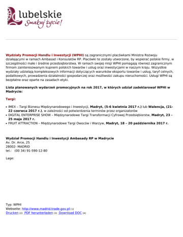 Wydziały Promocji Handlu i Inwestycji (WPHI) są zagranicznymi placówkami Ministra Rozwoju działającymi w ramach Ambasad i Konsulatów RP. Placówki te zostały utworzone, by wspierać polskie firmy, w szczególności małe i średnie przedsiębiorstwa. W ramach swojej misji WPHI pomagają również zagranicznym firmom zainteresowanym kupnem polskich towarów i usług oraz inwestycjami w naszym kraju. Wszystkie wydziały udzielają kompleksowych informacji dotyczących warunków eksportu towarów i usług, taryf celnych, podatkowych, prowadzenia działalności gospodarczej oraz możliwości zakupu nieruchomości. Usługi WPHI są bezpłatne oraz oparte na zasadach etyki. Lista planowanych wydarzeń promocyjnych na rok 2017, w których udział zadeklarował WPHI w Madrycie: Targi: ● ● ● IMEX – Targi Biznesu Międzynarodowego i Inwestycji, Madryt, (5-6 kwietnia 2017 r.) lub Walencja, (2122 czerwca 2017 r.), w zależności od potwierdzenia terminów przez organizatorów DIGITAL ENTERPRISE SHOW – Międzynarodowe Targi Transformacji Cyfrowej Przedsiębiorstw, Madryt, 23 25 maja 2017 r. FRUIT ATTRACTION – Międzynarodowe Targi Owoców i Warzyw, Madryt, 18 – 20 października 2017 r. Wydział Promocji Handlu i Inwestycji Ambasady RP w Madrycie Av. Dr. Arce, 25 28002- MADRID tel.: (00 34) 91-590-12-80 Lage: Typ: WPHI Webseite: http://www.madrid.trade.gov.pl [1] Drucken [2] PDF herunterladen [3] Download DOC [4] Source URL: http://invest.lubelskie.pl/de/wydzial-promocji-handlu-i-inwestycji-ambasady-rp-w-madrycie Links [1] http://www.madrid.trade.gov.pl [2] http://invest.lubelskie.pl/de/print/918 [3] http://invest.lubelskie.pl/de/printpdf/918 [4] http://invest.lubelskie.pl/de/print/918?type=doc