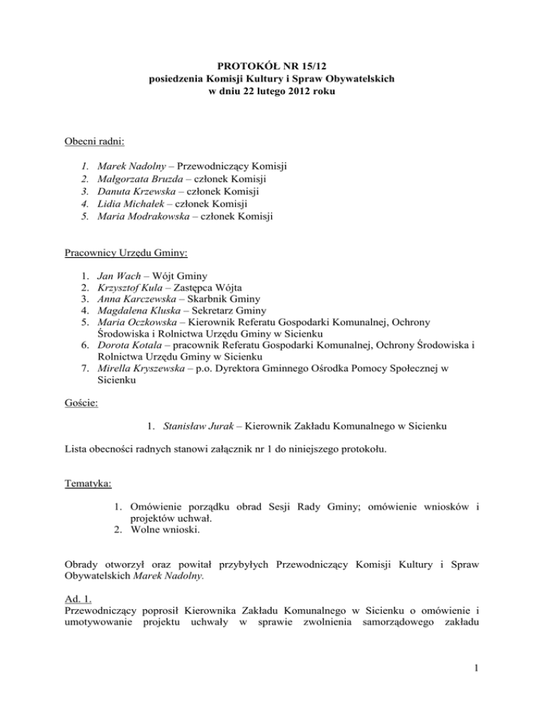 PROTOKÓŁ NR 15/12 posiedzenia Komisji Kultury i Spraw Obywatelskich w dniu 22 lutego 2012 roku Obecni radni: 1. 2. 3. 4. 5. Marek Nadolny – Przewodniczący Komisji Małgorzata Bruzda – członek Komisji Danuta Krzewska – członek Komisji Lidia Michałek – członek Komisji Maria Modrakowska – członek Komisji Pracownicy Urzędu Gminy: 1. 2. 3. 4. 5. Jan Wach – Wójt Gminy Krzysztof Kula – Zastępca Wójta Anna Karczewska – Skarbnik Gminy Magdalena Kluska – Sekretarz Gminy Maria Oczkowska – Kierownik Referatu Gospodarki Komunalnej, Ochrony Środowiska i Rolnictwa Urzędu Gminy w Sicienku 6. Dorota Kotala – pracownik Referatu Gospodarki Komunalnej, Ochrony Środowiska i Rolnictwa Urzędu Gminy w Sicienku 7. Mirella Kryszewska – p.o. Dyrektora Gminnego Ośrodka Pomocy Społecznej w Sicienku Goście: 1. Stanisław Jurak – Kierownik Zakładu Komunalnego w Sicienku Lista obecności radnych stanowi załącznik nr 1 do niniejszego protokołu. Tematyka: 1. Omówienie porządku obrad Sesji Rady Gminy; omówienie wniosków i projektów uchwał. 2. Wolne wnioski. Obrady otworzył oraz powitał przybyłych Przewodniczący Komisji Kultury i Spraw Obywatelskich Marek Nadolny. Ad. 1. Przewodniczący poprosił Kierownika Zakładu Komunalnego w Sicienku o omówienie i umotywowanie projektu uchwały w sprawie zwolnienia samorządowego zakładu 1 budżetowego – Zakładu Komunalnego z obowiązku wpłaty nadwyżki środków obrotowych do budżetu gminy. Kierownik Stanisław Jurak powiedział, że zgodnie z rozporządzeniem Zakład Komunalny powinien oddać nadwyżkę środków obrotowych do budżetu gminy. W związku z tym Zakład Komunalny zwraca się do Rady Gminy o wyrażenie zgody i podjęcie uchwały zwalniającej ze zwrotu tej nadwyżki oraz możliwość przeznaczenia jej na inwestycje. Wójt Gminy zwrócił się z pytaniem, na jakie konkretnie inwestycje Zakład Komunalny chce przeznaczyć nadwyżkę środków budżetowych. Kierownik Stanisław Jurak wymienił najpilniejsze inwestycje, na które można przeznaczyć nadwyżkę środków. Modernizacji wymaga przepompownia ścieków w Kamieńcu. Przewidywany koszt to 50 – 70 tys. zł. Nie ma dokładnego kosztorysu. Aby poznać szczegóły, należy ogłosić przetarg. Potrzebne są 2 pompy, modernizacja rurociągu, uzbrojenie przepompowni. Druga inwestycja to monitoring w przepompowni. Koszt takiej inwestycji, to około 5 tys. zł. Kolejny konieczny wydatek, to zakup autobusu szkolnego. Przewodniczący Marek Nadolny poinformował radnych, że nadwyżka omawianych środków wynosi 28.129,14 zł. Kierownik Stanisław Jurak powiedział, że w związku ze stratami Zakład Komunalny miałby problem z oddaniem tak dużej kwoty do budżetu gminy. Skarbnik Gminy poinformowała, że w budżecie gminy zaplanowano 100 tys. zł na zakup autobusu. Fizycznie Zakład Komunalny nie posiada środków finansowych. Komisja Rozwoju Gospodarczego i Komisja Rewizyjna, które obradowały wczoraj, oczekują od Zakładu Komunalnego wskazania zadań priorytetowych oraz podania w uzasadnieniu projektu uchwały konkretnych planowanych inwestycji. Przewodniczący Marek Nadolny zapytał, czy omawiana nadwyżka wystarczy na modernizację przepompowni w Kamieńcu. Skarbnik Gminy odpowiedziała, że nie jest to kwota wystarczająca. Przewodniczący Marek Nadolny zapytał, czy są jakieś inne rozwiązania problemu ścieków, choćby poprzez przełączenie ścieków ze Strzelewa. Kierownik Stanisław Jurak odpowiedział, że nie miałoby to uzasadnienia, a przepompownia w Kamieńcu po modernizacji da sobie radę z taką ilością ścieków. Przewodniczący zapytał, czy nie można by przekierować ścieków ze Strzelewa do Nakła. Kierownik Stanisław Jurak odpowiedział, że przekierowanie przepompowni w Strzelewie na kierunek nakielski, to byłby olbrzymi koszt. Wójt Gminy przypomniał, że Kierownik Stanisław Jurak uczestniczył we wszystkich spotkaniach, rozmowach z przedstawicielami Nakła, dotyczącymi planów rozwoju kanalizacji. 2 Przewodniczący Marek Nadolny poparł propozycję, by Zakład Komunalny podał w uzasadnieniu uchwały szczegóły dotyczące celów, na które zostanie przeznaczona nadwyżka finansowa. Wójt Gminy poinformował, że wpłynęło 25 ofert na przetarg dotyczący budowy kanalizacji w Osówcu. Najniższa oferta opiewa na 2,3 mln zł. Przewodniczący Marek Nadolny zauważył, że może niepotrzebnie istnieje zapis w budżecie o przeznaczeniu na to zadanie 5 mln zł, co stanowi pożywkę do negatywnych komentarzy. Skarbnik Gminy odpowiedziała, że taką kwotę zawiera kosztorys inwestorski, którym należy się posługiwać, natomiast realne koszty inwestycji będą znacznie niższe. Kierownik Stanisław Jurak poinformował, że jeśli nie będzie decyzji o zmianie kierunku odprowadzania ścieków do Nakła, to ze względu na zły stan techniczny i częste awarie, najważniejszym zadaniem jest modernizacja przepompowni w Kamieńcu. Skarbnik Gminy powiedziała, że także uważa to zadanie za najważniejsze. Gdyby zabrakło środków na ten cel, będzie trzeba dokonać przesunięć w ramach budżetu. Może planowany zakup autobusu będzie mniej kosztowny, niż założono. Wtedy zaoszczędzone pieniądze przeznaczone zostaną na inwestycję w Kamieńcu. Przewodniczący Marek Nadolny zapytał, czy mimo zamontowania piaskowników, dalej są problemy z niewydolnością urządzeń. Kierownik Stanisław Jurak odpowiedział, że wynika to ze zwiększonej ilości zrzucanych ścieków. Wśród ścieków zdarzają się też przemysłowe, jednak wszystkie traktowane są jako ścieki komunalne. Skarbnik Gminy poinformowała, że projekt uchwały określającej stawkę dotacji przedmiotowej dla Zakładu Komunalnego za przyjęcie do oczyszczalni 1m³ nieczystości ciekłych ze zbiorników bezodpływowych zakłada stawkę 5 zł. Po przyjęciu uchwały dotacje obowiązywać będą od 1.04.2012 r. Kierownik Stanisław Jurak zauważył, że probl