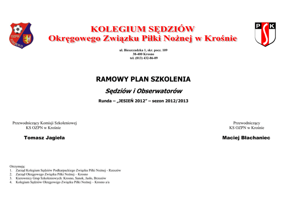 ul. Bieszczadzka 1, skr. pocz. 109 38-400 Krosno tel. (013) 432-86-09 RAMOWY PLAN SZKOLENIA Sędziów i Obserwatorów Runda – „JESIEŃ 2012” – sezon 2012/2013 Przewodniczący Komisji Szkoleniowej KS OZPN w Krośnie Przewodniczący KS OZPN w Krośnie Tomasz Jagieła Maciej Błachaniec Otrzymują: 1. Zarząd Kolegium Sędziów Podkarpackiego Związku Piłki Nożnej - Rzeszów 2. Zarząd Okręgowego Związku Piłki Nożnej – Krosno 3. Kierownicy Grup Szkoleniowych: Krosno, Sanok, Jasło, Brzozów 4. Kolegium Sędziów Okręgowego Związku Piłki Nożnej – Krosno a/a Tematy Ramowego Planu Szkolenia Sędziów i Obserwatorów– runda jesienna sezonu 2012/2013 Termin spotkań częstotliwość Trening Lipiec minimum 2 razy w tygodniu Tematyka Rodzaj zajęć • Indywidualne przygotowanie sprawnościowo – kondycyjne do rundy kondycyjny, jesiennej sezonu 2012/2013. ćwiczenia • minimum 2 szkolenia w miesiącu w Grupach Szkoleniowych + 1 szkolenie Grupy Perspektywicznej Indywidualnie rozgrywkowych Krosno Kierownik Sanok Grupy Omówienie najnowszych zmian 2012/2013 w Przepisach Gry Jasło Szkoleniowej (Okólnik nr 1302). Brzozów - TEMAT GŁÓWNY SZKOLENIA: • Przypomnienie istotnych zapisów w Regulaminie Rozgrywek. • Wypełnianie sprawozdania i załącznika zawodów (szczególny Uwagi sędziowie praktycznych. teoretyczne Sierpień Teren działalności KS Krosno wszystkich klas -Sprawy bieżące • Odpowiedzialni za realizację Prowadzenie zawodów tj.: sparingi, turnieje w ramach ćwiczeń praktyczne Szkolenie Miejsce spotkania nacisk: opis przewinień / termin wysyłania). Szkolenie -Sprawy bieżące Krosno Kierownik PROWADZĄCY: Sanok Grupy Koordynator Ustawianie się sędziego głównego i asystentów w trakcie gry i przy Jasło Szkoleniowej, WOSIEWICZ B. stałych fragmentach. Brzozów Komisja teoretyczne i filmowe - TEMAT GŁÓWNY SZKOLENIA: • -Analiza pytań testowych z najnowszego numeru Czasopisma „Sędzia” Szkolenie teoretyczne i filmowe - SZKOLENIE GRUPY PERSPEKTYWICZNEJ • Według odrębnego planu szkolenia Szkoleniowa Sala 308 Przewodniczący Starostwo Komisji Powiatowe Szkoleniowej w Krośnie Członek Komisji Szkoleniowej DOBOSZ S. Termin spotkania Miejsce spotkania Odpowiedzialni za realizację Uwagi Krosno Kierownik PROWADZĄCY: Sanok Grupy Koordynator Współpraca zespołu sędziowskiego w kontekście mobbingu, Jasło Szkoleniowej, KRĘŻAŁEK R. zapobieganie masowym konfrontacjom i innych zagrożeń Brzozów Komisja Tematyka Rodzaj zajęć Szkolenie -Sprawy bieżące teoretyczne - TEMAT GŁÓWNY SZKOLENIA: • i filmowe występujących w trakcie prowadzenia zawodów. Wrzesień minimum 2 szkolenia w miesiącu w Grupach Szkoleniowych + Szkoleniowa -Sprawdzenie wiedzy teoretycznej-test 30 pyt. Szkolenie -Sprawy bieżące Krosno Kierownik PROWADZĄCY: Sanok Grupy Szef Szkolenia Koncentracja sędziego: czynniki zakłócające podczas prowadzonych Jasło Szkoleniowej, Kolegium Sędziów zawodów, metody treningu doskonalące podzielność uwagi i Brzozów Komisja teoretyczne i filmowe - TEMAT GŁÓWNY SZKOLENIA: • Egzaminy utrzymanie koniecznego poziomu koncentracji. Egzaminy - EGZAMINY KONKURSOWE • Dla sędziów klasy okręgowej, klasy A oraz grupy perspektywicznej • Dla sędziów klasy B, C oraz sędziów próbnych Szkoleniowa Krosno Zarząd KS, Stadion Komisja MOSiR Szkoleniowa JAGIEŁA T. Szkolenie -Sprawy bieżące Krosno Kierownik PROWADZĄCY: Sanok Grupy Wiceprezes Współpraca na linii Sędzia – Obserwator. Jasło Szkoleniowej, Kolegium Sędziów Zadania i obowiązki przed, w trakcie i po zawodach. Brzozów Komisja teoretyczne - TEMAT GŁÓWNY SZKOLENIA: • i filmowe Październik minimum 2 szkolenia w miesiącu w Grupach Szkoleniowych Zasady omawiania zawodów. Szkolenie teoretyczne - TEMAT GŁÓWNY SZKOLENIA: • i filmowe Okazywanie niezadowolenia z decyzji sędziowskich -Analiza pytań testowych z najnowszego numeru Czasopisma „Sędzia” + 1 szkolenie Grupy Perspektywicznej -Sprawy bieżące minimum 2 szkolenia w miesiącu w Grupach Szkoleniowych + Szkolenie 1 szkolenie w miesiącu w Grupach Szkoleniowych Krosno Kierownik PROWADZĄCY: Sanok Grupy Koordynator Jasło Szkoleniowej, PELCZARSKI A. Brzozów Komisja Stadion - SZKOLENIE GRUPY PERSPEKTYWICZNEJ praktyczne Szkolenie Według odrębnego planu szkolenia -Sprawy bieżące - SPOTKANIA SZKOLENIOWE • Temat do realizacji wg własnych potrzeb grup szkoleniowych Szkolenie Szkolenie - SPOTKANIA SZKOLENIOWE • Temat do realizacji wg własnych potrzeb grup szkoleniowych • Udział sędziów w turniejach halowych Komisji zostanie podane w Szkoleniowej późniejszym terminie Sanok Grupy Jasło Szkoleniowej Brzozów Według odrębnego planu szkolenia -Sprawy bieżące Dokładne miejsce Kierownik - SZKOLENIE GRUPY PERSPEKTYWICZNEJ • Przewodniczący Krosno Stadion praktyczne 1 szkolenie Grupy Perspektywicznej Grudzień Szkoleniowa Szkoleniowa • Listopad DENEGA R. Przewodniczący Dokładne miejsce Komisji zostanie podane w Szkoleniowej późniejszym terminie Krosno Kierownik Sanok Grupy Jasło Szkoleniowej Brzozów UWAGA: 1. Szczegółowe plany pracy Grup Szkoleniowych z Krosna, Sanoka, Jasła oraz Brzozowa są integralną częścią niniejszego planu. 2. Częstotliwość zebrań szkoleniowych może być większa, lecz obowiązkowo – z pełnym stanem szkolących się sędziów - 2 razy w miesiącu (wyjątek m-c grudzień 1 raz). 3. Tematyka szkoleń może jednostkowo różnić się od zaproponowanej, pod warunkiem większego zapotrzebowania na inny-zdaniem grupy-istotny do omówienia temat. Opracował Przewodniczący Komisji Szkoleniowej KS OZPN w Krośnie Przewodniczący KS OZPN w Krośnie Tomasz Jagieła Maciej Błachaniec ZATWIERDZONO: W dniu 14.08.2012 r. na posiedzeniu Zarządu KS OZPN Krosno.