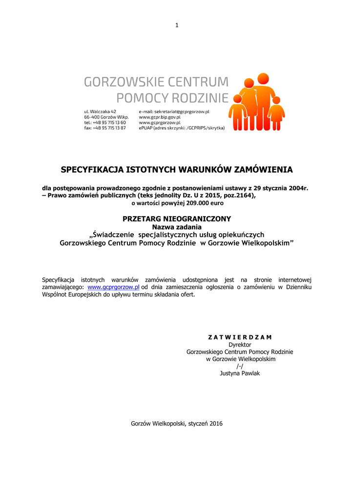 1 SPECYFIKACJA ISTOTNYCH WARUNKÓW ZAMÓWIENIA dla postępowania prowadzonego zgodnie z postanowieniami ustawy z 29 stycznia 2004r. – Prawo zamówień publicznych (teks jednolity Dz. U z 2015, poz.2164), o wartości powyżej 209.000 euro PRZETARG NIEOGRANICZONY Nazwa zadania „Świadczenie specjalistycznych usług opiekuńczych Gorzowskiego Centrum Pomocy Rodzinie w Gorzowie Wielkopolskim” Specyfikacja istotnych warunków zamówienia udostępniona jest na stronie internetowej zamawiającego: www.gcprgorzow.pl od dnia zamieszczenia ogłoszenia o zamówieniu w Dzienniku Wspólnot Europejskich do upływu terminu składania ofert. ZATWIERDZAM Dyrektor Gorzowskiego Centrum Pomocy Rodzinie w Gorzowie Wielkopolskim /-/ Justyna Pawlak Gorzów Wielkopolski, styczeń 2016 2 I. NAZWA ORAZ ADRES ZAMAWIAJĄCEGO Zamawiający: Gorzowskie Centrum Pomocy Rodzinie w Gorzowie Wielkopolskim ul. Walczaka 42, blok nr 2 66-400 Gorzów Wielkopolski NIP 599-11-13-362 REGON 3131062 www.gcprgorzow.pl [email protected] tel.: 95 715 13 60 fax.: 95 7715 13 87 Godziny urzędowania : - poniedziałek; środka; czwartek i piątek od godziny - 7:30 - 15:15 - wtorek; od godziny 7:30 do 16:30 II. TRYB UDZIELENIA ZAMÓWIENIA 1. Postępowanie prowadzone jest w trybie przetargu nieograniczonego zgodnie z art. 10, przepisami ustawy z dnia 29 stycznia 2004 r. Prawo zamówień publicznych (teks jednolity Dz. U. z 2015 r. poz. 2164.) zwanej w dalszej części Specyfikacji Istotnych Warunków Zamówienia (SIWZ) ustawą Pzp oraz rozporządzeń wykonawczych do tej ustawy. 2. Postępowanie prowadzone jest przez komisję przetargową powołaną do przeprowadzenia niniejszego postępowania o udzielenie zamówienia publicznego. 3. Do czynności podejmowanych przez Zamawiającego i Wykonawców w postępowaniu o udzielenie zamówienia stosuje się przepisy powołanej ustawy Pzp oraz aktów wykonawczych wydanych na jej podstawie, a w sprawach nieuregulowanych przepisy ustawy z dnia 23 kwietnia 1964 r. – Kodeks Cywilny (tekst jednolity Dz. U. z 2014, poz. 121 z późn. zm.). III. OPIS PRZEDMIOTU ZAMÓWIENIA 1. Przedmiotem zamówienia jest świadczenie specjalistycznych usług opiekuńczych (kod CPV 85.00.00.00-9), określonych w ustawie z dnia 12 marca 2004r. o pomocy społecznej oraz rozporządzeniu Ministra Polityki Społecznej z dnia z dnia 22 września 2005r. w sprawie specjalistycznych usług opiekuńczych (Dz. U. 2005r. Nr 189 poz. 1598 ze zm.), na obszarze działania miasta Gorzowa Wielkopolskiego, w miejscu zamieszkania świadczeniobiorcy. 2. Zamawiający dopuszcza złożenia ofert częściowych w związku z powyższym , zakres zamówienia obejmuje następujące części: 1) Część I zamówienia - Świadczenie specjalistycznych usług opiekuńczych dla osób z zaburzeniami psychicznymi z terenu miasta Gorzowa Wielkopolskiego w miejscu zamieszkania świadczeniobiorcy. a) Usługa świadczona będzie, na rzecz (30) trzydziestu osób wskazanych przez Zamawiającego, przez 7 dni w tygodniu w godzinach od 7:00 do 19:00. Ww. ilość jest wielkością szacunkową i może ulec zmianie (+/- 5 osób). b) Szczegółowy zakres czynności, które mają składać się na usługę dotyczącą Części I, został ustalony na podstawie rozporządzenia Ministra Polityki Społecznej z dnia 22 września 2005 r. w sprawie specjalistycznych usług opiekuńczych (t.j Dz.U. z 2006r, Nr 134, poz.943 z późn. zm.) i obejmuje zakres dotyczący Części I zamówienia. c) Prawo do korzystania z usługi będzie ustalane dla osób samotnych, które z powodu wieku, choroby lub innych przyczyn wymagają pomocy innych osób, a są jej pozbawione. Prawo to może zostać również ustalone dla osoby, która wymaga pomocy innych osób, a rodzina, a także wspólnie niezamieszkujący małżonek, wstępni, zstępni nie mogą takiej pomocy zapewnić. 3 d) Wykonawca zobowiązany będzie do świadczenia usługi dostosowanej do szczególnych potrzeb podopiecznych (klienta) wynikających z rodzaju schorzenia lub niepełnosprawności zgodnie z obowiązującymi przepisami prawa. e) Wykonawca będzie zobowiązany zapewnić, by usługi były wykonywane wyłącznie przez osoby posiadające kwalifikacje do wykonywania zawodu: pracownika socjalnego, pielęgniarki, asystenta osoby niepełnosprawnej, opiekunki środowiskowej, specjalisty w zakresie rehabilitacji medycznej, fizjoterapeuty lub innego zawodu dającego wiedzę i umiejętności pozwalające świadczyć określone specjalistyczne usługi. f) Osoby, o których mowa powyżej, muszą posiadać co najmniej półroczny staż w jednej z następujących jednostek: szpitalu psychiatrycznym, jednostce organizacyjnej pomocy społecznej dla osób z zaburzeniami psychicznymi, placówce terapii lub placówce oświatowej, do której uczęszczają dzieci z zaburzeniami rozwoju lub upośledzeniem umysłowym, ośrodku terapeutyczno-edukacyjno-wychowawczym, zakładzie rehabilitacji, innej jednostce niż wymienione w literze f), świadczącej specjalistyczne usługi opiekuńcze dla osób z zaburzeniami psychicznymi. g) Osoby świadczące specjalistyczne usługi opiekuńcze z zaburzeniami psychicznymi, muszą posiadać przeszkolenie i doświadczenie w zakresie: umiejętności kształtowania motywacji do akceptowanych przez otoczenie zachowań; kształtowania nawyków celowej aktywności; prowadzenia treningu zachowań społecznych. h) Wykonawca będzie ponosił pełną odpowiedzialność za działania i zaniechania osób wykonujących usługę. Zamawiający dopuszcza możliwość zmiany osoby świadczącej usługę tylko w uzasadnionych przypadkach: choroba, zdarzenie losowe, nienależyte wykonywanie obowiązków. W takim przypadku Wykonawca zobowiązany jest poinformować o tym Zamawiającego i przekazać mu dane osoby mającej świadczyć usługi. Osoba ta powinna posiadać co najmniej takie kwalifikacje jak osoba dotychczas je świadcząca. Zmiana osób świadczących usługi nie stanowi zmiany treści umowy. i) Wykonawca będzie zo