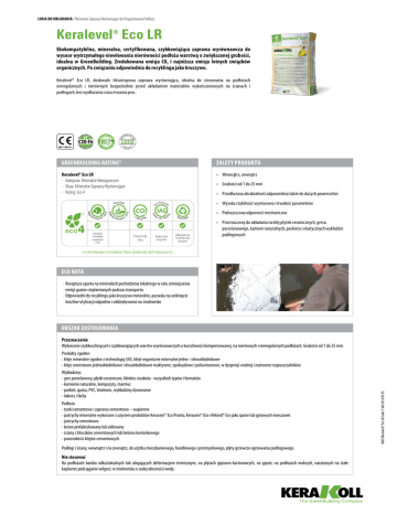 Linia do Układania / Mineralne Zaprawy Wyrównujące do Przygotowania Podłoży Keralevel® Eco LR Ekokompatybilna, mineralna, certyfikowana, szybkowiążąca zaprawa wyrównawcza do wysoce wytrzymałego niwelowania nierówności podłoża warstwą o zwiększonej grubości, idealna w GreenBuilding. Zredukowana emisja CO2 i najniższa emisja lotnych związków organicznych. Po związaniu odpowiednia do recyklingu jako kruszywo. CO CT C20-F6 RM EN 13813 RO PEA N N O EU EN 13813 NT R I BUTES TO LIANT W I MP TH CO Keralevel® Eco LR, doskonale tiksotropowa zaprawa wyrównująca, idealna do stosowania na podłożach nieregularnych i nierównych bezpośrednio przed układaniem materiałów wykończeniowych na ścianach i podłogach, bez wydłużania czasu trwania prac. PO INTS GreenBuilding Rating® Zalety Produktu Keralevel® Eco LR -- Kategoria: Mineralne Nieorganiczne -- Klasa: Mineralne Zaprawy Wyrównujące -- Rating: Eco 4 • Wewnątrz, zewnątrz • Grubości od 1 do 25 mm • Przedłużona obrabialność odpowiednia także do dużych powierzchni Zawartość minerałów naturalnych 61% 25 0 g/ kg Emisja CO2/kg 208 g oo IAQ • Podwyższona odporność mechaniczna VOC y ≤ • Wysoka stabilność wymiarowa i trwałość parametrów Emissio lit % 30 % 60 l M i n e r al ≥ Ind na io l M i n e r al ≥ Reg 4 na io Reg ® ow n L Recyc led r Air Qua Bardzo niska emisja VOC Re cyclable Odpowiedni do recyklingu jako kruszywo • Przeznaczony do układania na klej płytek ceramicznych, gresu porcelanowego, kamieni naturalnych, parkietu i elastycznych wykładzin podłogowych SYSTEM POMIARU ATESTOWANY PRZEZ JEDNOSTKĘ CERTYFIKUJĄCĄ SGS ECO NOTA -- Receptura oparta na minerałach pochodzenia lokalnego w celu zmniejszenia emisji gazów cieplarnianych podczas transportu -- Odpowiedni do recyklingu jako kruszywo mineralne, pozwala na uniknięcie kosztów utylizacji odpadów i oddziaływania na środowisko Obszar zastosowania Przeznaczenie Wykonanie szybkoschnących i szybkowiążących warstw wyrównawczych o kurczliwości kompensowanej, na nierównych i nieregularnych podłożach. Grubości od 1 do 25 mm. Wykładziny: - gres porcelanowy, płytki ceramiczne, klinkier, terakota - wszystkich typów i formatów - kamienie naturalne, kompozyty, marmur - parkiet, guma, PVC, linoleum, wykładziny dywanowe - lakiery i farby Podłoża: - tynki cementowe i zaprawy cementowo – wapienne - jastrychy mineralne wykonane z użyciem produktów Keracem® Eco Pronto, Keracem® Eco i Rekord® Eco jako spoiw lub gotowych mieszanek - jastrychy cementowe - beton prefabrykowany lub odlewany - ściany z bloczków cementowych lub betonu komórkowego - pozostałości klejów cementowych Podłogi i ściany, wewnątrz i na zewnątrz, do użytku mieszkaniowego, handlowego i przemysłowego, płyty grzewcze ogrzewania podłogowego. Nie stosować Na podłożach bardzo odkształcalnych lub ulegających deformacjom termicznym, na płytach gipsowo-kartonowych, na gipsie; na podłożach mokrych, narażonych na stałe kapilarne podciąganie wilgoci; w środowisku o stałej obecności wody. 00073Keralevel® Eco LR Code: F106 2013/05-PL Produkty zgodne: - kleje mineralne zgodne z technologią SAS, kleje organiczne mineralne jedno- i dwuskładnikowe - kleje cementowe jednoskładnikowe i dwuskładnikowe reaktywne, epoksydowe i poliuretanowe, w dyspersji wodnej i roztworze rozpuszczalników Technologia użycia Przygotowanie podłoży Podłoża muszą być oczyszczone z pyłów, olejów i tłuszczów, nie mogą być narażone na kapilarne podciąganie wilgoci, pozbawione kruchych, niedostatecznie spójnych oraz źle przywartych fragmentów, takich jak pozostałości cementu, wapna, lakierów i klejów, które muszą być całkowicie usunięte. Podłoże musi być stabilne wymiarowo, dojrzałe i bez pęknięć. Podłoża mało nasiąkliwe: podłoża gładkie, mało nasiąkliwe lub całkowicie nienasiąkliwe jak ceramika, piaskowce, farby epoksydowe i do malowania murów, pozostałości klejów, gładkie, zwarte i spójne powierzchnie cementowe, należy przygotować poprzez obróbkę mechaniczną lub zastosowanie poprawiającego przyczepność, ekokompatybilnego środka na bazie wodnej Keragrip Eco, dokładnie według wskazówek zastosowania oraz po odpowiednim oczyszczeniu powierzchni. Ewentualne pozostałości produktów do pokrywania powierzchni, takie jak woski i środki ułatwiające oddzielanie szalunków, muszą być usunięte mechanicznie lub przy użyciu odpowiednich produktów chemicznych. Podłoża bardzo nasiąkliwe: zwarte lecz bardzo nasiąkliwe jastrychy oraz tynki należy zapobiegawczo pokryć ekokompatybilnym gruntem na bazie wody Primer A Eco celem obniżenia i uregulowania poziomu nasiąkliwości. W przypadku nasiąkliwych i mało spójnych podłoży należy zastosować Keradur Eco, ekokompatybilny środek na bazie wodnej, wzmacniający strukturę podłoża. Zachować czas oczekiwania zalecany przed przeprowadzeniem naprawy zaprawą wyrównującą. Sposób użycia Keralevel® Eco LR przygotowuje się w czystym naczyniu wlewając początkowo ¾ potrzebnej ilości wody. Stopniowo wsypywać Keralevel® Eco LR do naczynia, mieszając za pomocą wolnoobrotowego (≈ 400/min) mieszadła śrubowego. Dodawać resztę wody do momentu otrzymania jednorodnej, wolnej od grudek mieszaniny o żądanej konsystencji. W celu uzyskania optymalnego wymieszania i dużej ilość masy wyrównującej zaleca się używania wolnoobrotowego mieszalnika elektrycznego z pionowym mieszadłem. Specjalne polimery o podwyższonej zdolności dyspergowania gwarantują niezwłoczną gotowość zaprawy Keralevel® Eco LR do użytku. Ilość wody wskazana na opakowaniu jest wielkością orientacyjną. Możliwe jest uzyskiwanie mieszaniny bardziej lub mniej tiksotropowej w zależności od zastosowania. Dodanie nadmiernej ilości wody nie polepsza obrabialności zaprawy, może powodować skurcz w fazie plastycznej schnięcia i zmniejszyć parametry finalne,