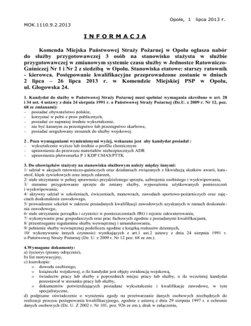 Opole, 1 lipca 2013 r. MOK.1110.9.2.2013 INFORMACJA Komenda Miejska Państwowej Straży Pożarnej w Opolu ogłasza nabór do służby przygotowawczej 3 osób na stanowisko stażysta w służbie przygotowawczej w zmianowym systemie czasu służby w Jednostce RatowniczoGaśniczej Nr 1 i Nr 2 z siedzibą w Opolu. Stanowiska etatowe: starszy ratownik - kierowca. Postępowanie kwalifikacyjne przeprowadzone zostanie w dniach 2 lipca – 26 lipca 2013 r. w Komendzie Miejskiej PSP w Opolu, ul. Głogowska 24. 1. Kandydat do służby w Państwowej Straży Pożarnej musi spełniać wymagania określone w art. 28 i 34 ust. 4 ustawy z dnia 24 sierpnia 1991 r. o Państwowej Straży Pożarnej (Dz.U. z 2009 r. Nr 12, poz. 68 ze zmianami): − posiadać obywatelstwo polskie, − korzystać w pełni z praw publicznych, − posiadać co najmniej średnie wykształcenie, − nie być karanym za przestępstwo lub przestępstwo skarbowe, − posiadać uregulowany stosunek do służby wojskowej. 2 . Poza wymaganiami wymienionymi wyżej, wskazane jest aby kandydat posiadał : − wykształcenie wyższe lub średnie o profilu chemicznym − uprawnienia do przewozu materiałów niebezpiecznych ADR − uprawnienia płetwonurka P 1 KDP CMAS/PTTK 3. Do obowiązków stażysty na stanowisku służbowym należy między innymi: 1/ udział w akcjach ratowniczo-gaśniczych oraz działaniach związanych z likwidacją skutków awarii, kata strof, klęsk żywiołowych oraz innych zdarzeń, 2/ stałe utrzymanie w pełnej sprawności przydzielonego sprzętu, uzbrojenia osobistego i wyekwipowania, 3/ staranne przygotowanie sprzętu do zmiany służby, wyposażenia użytkowanych pomieszczeń i wyekwipowania, 4/ aktywny udział w szkoleniach, ćwiczeniach, manewrach, zawodach sportowo-pożarniczych oraz zaję ciach doskonalenia zawodowego, 5/ prowadzenie szkoleń w zakresie posiadanych kwalifikacji zawodowych uzyskanych w ramach doskonale nia zawodowego, 6/ stałe utrzymanie porządku i czystości w pomieszczeniach JRG i rejonie zakwaterowania, 7/ wykonywanie prac gospodarczych oraz prac fachowych zgodnie z posiadanymi kwalifikacjami, 8/ przestrzeganie regulaminu służby wewnętrznej i umundurowania, 9/ pełnienie służby wewnętrznej podoficera zgodnie z książką rozkazów dziennych, 10/ wykonywanie innych czynności wynikających z art.1 ust.2 ustawy z dnia 24 sierpnia 1991 r. o Państwowej Straży Pożarnej (Dz. U. z 2009 r. Nr 12 poz. 68 ze zm.). 4.Wymagane dokumenty: a) życiorys (pisany odręcznie), b) list motywacyjny, c) kserokopie: • dowodu osobistego, • książeczki wojskowej, o ile kandydat jest objęty ewidencją wojskową, • świadectw pracy lub służby z poprzednich miejsc pracy lub służby, o ile wcześniej kandydat pozostawał w stosunku pracy lub służby, • dokumentów potwierdzających posiadane wykształcenie i kwalifikacje zawodowe, w tym specjalistyczne, d) podpisane oświadczenie o wyrażeniu zgody na przetwarzanie danych osobowych niezbędnych do realizacji procesu postępowania kwalifikacyjnego, zgodnie z ustawą z dnia 29 sierpnia 1997 r. o ochronie danych osobowych (Dz. U. Z 2002 r. Nr 101, poz. 926 ze zm.), druk w załączeniu, e) podpisane oświadczenia o zgodzie na publikację wyników poszczególnych etapów postępowania na stronie internetowej KM PSP w Opolu oraz w siedzibie KM PSP w Opolu, druk w załączeniu, f) podpisane oświadczenie o korzystaniu z pełni praw publicznych, druk w załączeniu, g) podpisane oświadczenie o niekaralności za przestępstwo lub przestępstwo skarbowe, druk w załączeniu, h) aktualne zaświadczenie lekarskie dopuszczające kandydata do udziału w próbie wydolnościowej, teście sprawności fizycznej oraz sprawdzianie z pływania wystawione nie wcześniej niż 30 dni przed dniem przystąpienia do testu, druk w załączeniu. Dokumenty aplikacyjne przyjmowane będą w Sekcji Organizacyjno-Kadrowej Komendy Miejskiej PSP w Opolu, ul. Głogowska 24 do dnia 12 lipca 2013 r. Za datę przyjęcia aplikacji liczy się data wpływu do jednostki, oferty składane po terminie nie będą brane pod uwagę. Dokumenty aplikacyjne kandydatów, którzy nie zakwalifikowali się do kolejnych etapów postępowania kwalifikacyjnego można odebrać w Komendzie Miejskiej PSP w Opolu do 7 dni od daty zakończenia postępowania kwalifikacyjnego a po tym terminie zostaną komisyjnie zniszczone. 5. Postępowanie kwalifikacyjne składać się będzie z czterech etapów: I etap: a) Przegląd i sprawdzenie kompletności dokumentów złożonych przez kandydatów oraz dokonanie w oparciu o nie wstępnej oceny spełniania przez kandydatów wymagań określonych w ustawie. b) Ocena dokumentów dotyczących posiadanego wykształcenia i kwalifikacji oraz określenie związanej z tym liczby punktów za poszczególne uprawnienia oraz sumy punktów. Pierwszy etap postępowania odbędzie się w dniu 15 lipca 2013 r. ( max liczba punktów 60). W przypadku niespełnienia wymagań podstawowych określonych w pkt.1 niniejszej informacji kandydat nie zostaje dopuszczony do kolejnych etapów postępowania kwalifikacyjnego. II etap: Ocena sprawności fizycznej kandydata do służby obejmuje: próbę wydolnościową oraz test sprawności fizycznej. Etap ten odbywa się w sposób i na zasadach określonych w rozporządzeniu Ministra Spraw Wewnętrznych i Administracji z dnia 27 października 2005 r. w sprawie zakresu, trybu i częstotliwości przeprowadzania okresowych profilaktycznych badań lekarskich oraz okresowej oceny sprawności fizycznej strażaka PSP (Dz. U. Nr 261, poz. 2191) z zastrzeżeniem, że przyjmuje się dla wszystkich kandydatów test sprawności fizycznej przewidziany jako próba dla mężczyzn. Warunkiem zaliczenia próby wydolnościowej i testu sprawności fizycznej jest uzyskanie oceny minimalnej DOBRY bez punktów preferencyjnych. Test sprawności fizycznej obejmuje również: - próbę wysokościową, tj. wejście asekurowane na drabinę na wysokość 20 m ustawioną pod ką