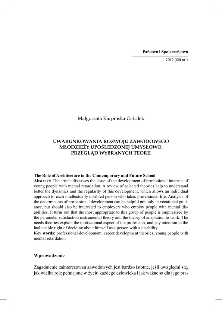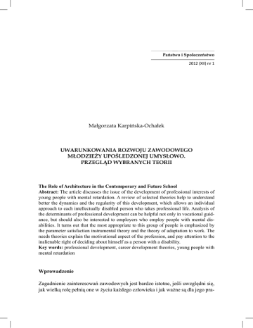 Państwo i Społeczeństwo 2012 (XII) nr 1 Małgorzata Karpińska-Ochałek UWARUNKOWANIA ROZWOJU ZAWODOWEGO MŁODZIEŻY UPOŚLEDZONEJ UMYSŁOWO. PRZEGLĄD WYBRANYCH TEORII The Role of Architecture in the Contemporary and Future School Abstract: The article discusses the issue of the development of professional interests of young people with mental retardation. A review of selected theories help to understand better the dynamics and the regularity of this development, which allows an individual approach to each intellectually disabled person who takes professional life. Analysis of the determinants of professional development can be helpful not only in vocational guidance, but should also be interested to employers who employ people with mental disabilities. It turns out that the most appropriate to this group of people is emphasized by the parameter satisfaction instrumental theory and the theory of adaptation to work. The needs theories explain the motivational aspect of the profession, and pay attention to the inalienable right of deciding about himself as a person with a disability. Key words: professional development, career development theories, young people with mental retardation Wprowadzenie Zagadnienie zainteresowań zawodowych jest bardzo istotne, jeśli uwzględni się, jak wielką rolę pełnią one w życiu każdego człowieka i jak ważne są dla jego pra- 194 MAŁGORZATA KARPIŃSKA-OCHAŁEK widłowego rozwoju i skuteczności działania (Słoniewska 1959; Gurycka 1978). Jak podaje J. Nazar (1975: 14), należą one do „tych składników osobowości, które wpływają na decyzje o przyszłej pracy zawodowej”. Czasem zastanowienie budzi fakt, że ludzie wybierają dany zawód chociaż nie mają zdolności czy nawet predyspozycji potrzebnych do osiągnięcia jakiegokolwiek powodzenia w określonej dziedzinie. Jednak mogą one sprawdzić swoje umiejętności i mają swobodę w decydowaniu o sobie. Każdy człowiek powinien bowiem mieć możliwość wyuczenia się takiego zawodu, jaki sobie wybrał (Ruciński 1972b). Niestety, ludzie z upośledzeniem umysłowym dość często pozbawiani są takiej szansy. Stanowiąc specyficzną (wśród innych kategorii niepełnosprawności) grupę, spotykają się z jednej strony z obojętnością i niezrozumieniem przeżywanych problemów, z drugiej natomiast – z nadmierną troskliwością, prowadzącą do wyręczania ich w aktywności własnej niemal we wszystkich aspektach życia. Skoro już sama etiologia niedorozwoju umysłowego ukazuje złożoność przyczyn i wynikających z nich ograniczeń w codziennym funkcjonowaniu, wydaje się z pozoru, że ta wiedza usprawiedliwia prawo organizowania wszystkiego, co dotyczy każdej takiej osoby. W ten sposób odbiera się jej jednak nie tylko możliwość dokonania wyboru, ale zwracając uwagę jedynie na obniżone predyspozycje (Ostrowska, Sikorska 1996) zapomina się o tym, co stanowi indywidualne zdolności i odrębność danego człowieka. Zatem etykietując odrzuca się wewnętrzny świat marzeń, planów i zainteresowań. Tymczasem tacy ludzie mają nieraz wyraźne preferencje w stosunku do różnych dziedzin swojego życia, stąd mają również sprecyzowane zamiłowania zawodowe. W tym kontekście psychologiczne spojrzenie na problematykę rozwoju zawodowego, poznanie jego elementów i poszczególnych stadiów, może być pomocne nie tylko w zrozumieniu prawidłowości i dynamiki samego życia zawodowego. Mając świadomość, w jaki sposób kształtują się zainteresowania zawodowe człowieka niepełnosprawnego, można przecież ułatwić stymulację tego procesu na każdym jego, nawet najwcześniejszym, etapie. Wówczas realne stanie się indywidualne podejście do danej osoby, przy jednoczesnym zachowaniu jej niezbywalnego prawa do stanowienia o sobie. Przegląd wybranych teorii w odniesieniu do zagadnienia rozwoju zawodowego Jak podaje literatura, „zainteresowania zawodowe mają charakter rozwojowy” (Wołejszo 1990: 43). Stwierdzenie to może oznaczać jednocześnie, że zainteresowania powstają na skutek rozwoju danego człowieka, ale również rozwój ten warunkują (Słoniewska 1959). UWARUNKOWANIA ROZWOJU ZAWODOWEGO MŁODZIEŻY... 195 Już we wczesnym okresie rozwojowym pojawiają się pierwsze odruchy badawcze, które kierują uwagę dziecka na przedmioty bądź zjawiska wyróżniające się pod jakimś względem. Rodzące się zaciekawienie zostaje zaspokojone w momencie zbliżania, zdobycia czy manipulowania obiektem zainteresowania, po czym szybko wygasa. Kolejne etapy rozwojowe przynoszą wzrastającą zdolność do koncentracji i różnicowania cech określonego przedmiotu. Postępujące w czasie procesy poznawcze wzbogacają zamiłowania dzięki rozpoznawaniu zmysłami oraz myśleniu – początkowo konkretnemu, potem zaś abstrakcyjnemu. Dążenie do zdobycia wiedzy pobudza dziecko do szukania nowych informacji. Rozwojowy charakter zainteresowań można zatem opisać jako „przechodzenie od prostego do złożonego, od konkretu do abstrakcji, od ogółu do specjalizacji” (Wołejszo 1990: 43). Claparede (Gurycka 1989: 121) dodaje do tego jeszcze inne prawa rządzące następstwem zamiłowań i wyróżnia przechodzenie „od biernej odbiorczości do samorzutności, od podmiotowości do przedmiotowości, od bezpośredniości do pośredniości, od rozproszenia na szczegóły do scalania”. Autor ten formułując ogólne prawo rozwoju zainteresowań był przekonany, że „kolejność występowania różnych typów zamiłowań zdeterminowana jest wrodzona tendencją rozwojową” (Graczyk 1982a: 191), gdzie porządek kształtowania poszczególnych zainteresowań pozostaje stały i obejmuje: 1 – zainteresowania spostrzeżeniowe (1 r.ż.), 2 – zainteresowania mową (2 r.ż.), 3 – zainteresowania ogólne (3–7 r.ż.), 4 – zainteresowania specjalne i przedmiotowe (7–12 r.ż.), 5 – zainteresowania etyczne i społeczne (12–18 r.ż.) (Szewczuk 1975: 271). U