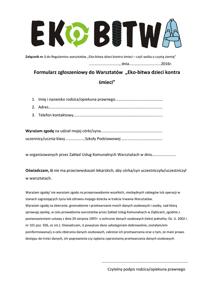 Załącznik nr 1 do Regulaminu warsztatów „Eko-bitwa dzieci kontra śmieci – czyli walka o czystą ziemię” ............................, dnia.............................2016r. Formularz zgłoszeniowy do Warsztatów „Eko-bitwa dzieci kontra śmieci” 1. Imię i nazwisko rodzica/opiekuna prawnego………………………………………… 2. Adres………………………………………………………………………………….................... 3. Telefon kontaktowy……………………………………………………………………........... Wyrażam zgodę na udział mojej córki/syna…………………………………………………….. uczennicy/ucznia klasy ……………….Szkoły Podstawowej ………………………………….. w organizowanych przez Zakład Usług Komunalnych Warsztatach w dniu…………………… Oświadczam, iż nie ma przeciwwskazań lekarskich, aby córka/syn uczestniczyła/uczestniczył w warsztatach. Wyrażam zgodę/ nie wyrażam zgody na przeprowadzenie wszelkich, niezbędnych zabiegów lub operacji w stanach zagrażających życiu lub zdrowiu mojego dziecka w trakcie trwania Warsztatów. Wyrażam zgodę na zbieranie, gromadzenie i przetwarzanie moich danych osobowych i osoby, nad którą sprawuję opiekę, w celu prowadzenia warsztatów przez Zakład Usług Komunalnych w Ziębicach, zgodnie z postanowieniami ustawy z dnia 29 sierpnia 1997r. o ochronie danych osobowych (tekst jednolity: Dz. U. 2002 r. nr 101 poz. 926, ze zm.). Oświadczam, iż powyższe dane udostępniam dobrowolnie, zostałam/em poinformowana/y o celu zbierania danych osobowych, zakresie ich przetwarzania oraz o tym, że mam prawo dostępu do treści danych, ich poprawiania czy żądania zaprzestania przetwarzania danych osobowych. ............................................................................... Czytelny podpis rodzica/opiekuna prawnego