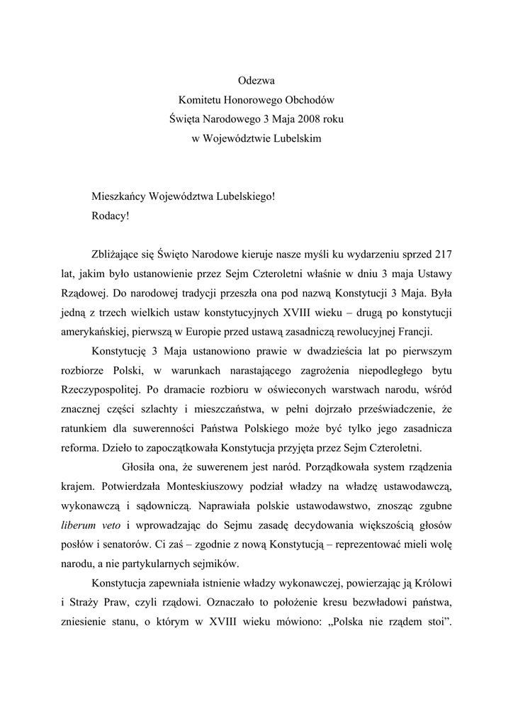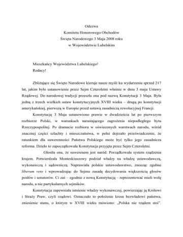Odezwa Komitetu Honorowego Obchodów Święta Narodowego 3 Maja 2008 roku w Województwie Lubelskim Mieszkańcy Województwa Lubelskiego! Rodacy! Zbliżające się Święto Narodowe kieruje nasze myśli ku wydarzeniu sprzed 217 lat, jakim było ustanowienie przez Sejm Czteroletni właśnie w dniu 3 maja Ustawy Rządowej. Do narodowej tradycji przeszła ona pod nazwą Konstytucji 3 Maja. Była jedną z trzech wielkich ustaw konstytucyjnych XVIII wieku – drugą po konstytucji amerykańskiej, pierwszą w Europie przed ustawą zasadniczą rewolucyjnej Francji. Konstytucję 3 Maja ustanowiono prawie w dwadzieścia lat po pierwszym rozbiorze Polski, w warunkach narastającego zagrożenia niepodległego bytu Rzeczypospolitej. Po dramacie rozbioru w oświeconych warstwach narodu, wśród znacznej części szlachty i mieszczaństwa, w pełni dojrzało przeświadczenie, że ratunkiem dla suwerenności Państwa Polskiego może być tylko jego zasadnicza reforma. Dzieło to zapoczątkowała Konstytucja przyjęta przez Sejm Czteroletni. Głosiła ona, że suwerenem jest naród. Porządkowała system rządzenia krajem. Potwierdzała Monteskiuszowy podział władzy na władzę ustawodawczą, wykonawczą i sądowniczą. Naprawiała polskie ustawodawstwo, znosząc zgubne liberum veto i wprowadzając do Sejmu zasadę decydowania większością głosów posłów i senatorów. Ci zaś – zgodnie z nową Konstytucją – reprezentować mieli wolę narodu, a nie partykularnych sejmików. Konstytucja zapewniała istnienie władzy wykonawczej, powierzając ją Królowi i Straży Praw, czyli rządowi. Oznaczało to położenie kresu bezwładowi państwa, zniesienie stanu, o którym w XVIII wieku mówiono: „Polska nie rządem stoi”. Konstytucja reformowała również sądownictwo, uniezależniając je od pozostałych władz. Istotnymi zmianami było zniesienie instytucji wolnej elekcji i wprowadzenie dziedziczności tronu. Miało to chronić Polskę przed niebezpieczeństwami okresów bezkrólewia i intrygami obcych mocarstw zainteresowanych sukcesją polskiego tronu. Konstytucja gwarantowała narodowi szlacheckiemu wolność polityczną, osobistą i ochronę własności. Nadawała prawa miastom i szereg uprawnień mieszczanom, stwarzając miastom i mieszczanom możliwości rozwoju – przede wszystkim ekonomicznego, ale, z pewnymi ograniczeniami, również politycznego. Ustawa Rządowa brała pod opiekę prawną włościan, choć pańszczyzny i poddaństwa nie zniosła. Zapewniała tolerancję wyznaniową (przy ustanowieniu katolicyzmu jako religii panującej). Konstytucja rozwiązała również sprawę obronności kraju. Według jej postanowienia tworzono wojsko, będące częścią potencjału Rzeczypospolitej, przeznaczoną do obrony integralności państwa i suwerenności narodu. Nowoczesne sformułowanie zasady i celu istnienia siły zbrojnej stało się podstawą tradycji Wojska Polskiego, żywej po dzień dzisiejszy. Ogromna większość szlachty i mieszczaństwa z entuzjazmem przyjęła ustanowienie Konstytucji 3 Maja. Miano bowiem wtedy świadomość wielkich zmian, które ona wprowadzała. Słusznie odbierano ją jako zasadniczy zwrot w dziejach polskiej państwowości, jako sygnał odradzania się Rzeczypospolitej pod względem politycznym i moralnym; jako zwycięstwo sił patriotycznych, propaństwowych, nad siłami egoizmu, prywaty i anarchii. Była więc Ustawa Rządowa wyraźnym sygnałem zmian na lepsze, prawdziwą jutrzenką nadziei. Jako akt suwerennej woli narodu stanowiła dowód politycznej mądrości i powód do uzasadnionej dumy. Reformy Konstytucji 3 Maja nie przetrwały, nie uratowały suwerenności Polski. Zniszczone zostały rosyjskimi wojskami carycy Katarzyny II i, niestety, zdradą Polaków skupionych wokół Targowicy. Pozostała jednak pamięć i tradycja Konstytucji 3 Maja, odczytywane jako wielkie dokonanie polskiej myśli prawniczej i politycznej. Konstytucja stała się wartością kulturową, swoistym katechizmem narodowym Polaków. Okazała się też trwałym składnikiem europejskiej tradycji konstytucyjnej. Do dzieła Konstytucji, do patriotyzmu jej twórców nawiązywały pokolenia Polaków, zarówno te, które walczyły o wolność w XVIII, XIX i początkach XX stulecia, jak i te, które budowały II Rzeczypospolitą. Właśnie w dwudziestoleciu międzywojennym dzień 3 maja, rocznica ustanowienia Konstytucji, ogłoszony został świętem narodowym i religijnym. Tradycja Konstytucji 3 Maja żywa była na Lubelszczyźnie. W 125. rocznicę ustanowienia wzniesiono w Lublinie pomnik jej poświęcony. Celowo pomijany w okresie PRL-u, przywrócony został miastu w dobie „Solidarności”. Towarzyszyła temu aktowi wielka manifestacja patriotyczna. Pod ten pomnik społeczeństwo Lublina i województwa przychodziło w czasie stanu wojennego, by – mimo represji – świadczyć o swym pragnieniu wolności i suwerenności, których symbolem było wtedy dzieło Sejmu Czteroletniego. Dziś obchodzimy 217. rocznicę ustanowienia Konstytucji 3 Maja jako święto narodowe, znak widoczny naszej tożsamości. Dla nas, podobnie jak dla pokoleń, które poprzedziły nas w dziejach, pamięć o dziele Konstytucji stanowi istotny element polskiego dziedzictwa, wyrażający stale wielkie społeczne pragnienie, by żyć w państwie dobrze rządzonym, mądrym, sprawiedliwym i suwerennym. Przeżywając od 1989 roku proces transformacji ustrojowej, wiemy, jak trudne bywa reformowanie struktur państwa. Dlatego z tym większym uznaniem patrzymy na pokolenie Sejmu Czteroletniego, które w niesprzyjających warunkach zagrożenia niepodległości Polski podjęło ten trud z odwagą i wyobraźnią. Czujemy się dziś i jesteśmy spadkobiercami ich dzieła. Dlatego chronimy pamięć o nim i apelujemy o kultywowanie tej pamięci. Służy temu Święto Narodowe 3 Maja. Jako Komitet Honorowy Obchodów Święta 3 Maja apelujemy o liczny udział w uroczystościach, które będą się odbywać w tym
