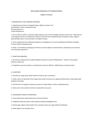 REGULAMIN KONKURSU FOTOGRAFICZNEGO „Zdjęcie miesiąca” I. ORGANIZATOR I CZAS TRWANIA KONKURSU 1. Organizatorem konkursu fotograficznego „Zdjęcie miesiąca” jest Urząd Miasta i Gminy w Niepołomicach, Plac Zwycięstwa 13, 32-005 Niepołomice. 2. Jest to konkurs cykliczny, zbieranie zdjęć odbywa się do 15 dnia każdego miesiąca w 2015 roku. Każdorazowo rozstrzygnięcie konkursu publikowane będzie na łamach Gazety Niepołomickiej na kolejny miesiąc. Zdjęcia z poprzedniego etapu, nie przechodzą na następny miesiąc. 3. Oceny nadesłanych prac dokonywać będzie jury składające się z trzech przedstawicieli Referatu Strategii i Promocji UMiG w Niepołomicach. 4. Każdy z uczestników przystępując do konkursu wyraża zgodę na postanowienia i zobowiązuje się stosować do niniejszego regulaminu. II. TEMATYKA KONKURSU 1. Do konkursu dopuszczone są tylko fotografie wykonane w gminie Niepołomice – ciekawe, interesujące, zabawne, piękne itp. 2. Fotografie muszą być wysłane w rozdzielczości minimum 300 dpi, 1280 pikseli po mniejszym boku. III. UCZESTNICY 1. W konkursie mogą wziąć udział zarówno amatorzy jak i zawodowcy. 2. Osoby, które nie ukończyły 18 lat mogą wziąć udział w konkursie za zgodą przedstawiciela ustawowego bądź opiekuna prawnego. 3. W konkursie nie mogą brać udziału pracownicy Urzędu Miasta i Gminy w Niepołomicach. 4. Jeden autor może wysłać na konkurs maksymalnie trzy prace. IV. ZGŁOSZENIE UDZIAŁU W KONKURSIE 1. Prace konkursowe należy dostarczać w formie cyfrowej. 2. Fotografie należy przysyłać na adres [email protected] 3. Dostarczając zdjęcia należy podać imię i nazwisko autora oraz jego telefon kontaktowy. 4. Każde zdjęcie musi posiadać tytuł. 5. W tytule e-maila należy wpisać „Zdjęcie miesiąca”. 6. Fotografie zgłaszane na konkurs nie mogą naruszać prawa, w tym w szczególności dóbr osobistych osób trzecich, a także ogólnie przyjętych norm obyczajowych. 7. Autorzy, którzy nadsyłają swoje prace oświadczają tym samym, iż są właścicielami wszystkich praw autorskich do nadesłanych prac. 8. Organizator zastrzega sobie prawo do niepublikowania niektórych nadesłanych na konkurs zdjęć oraz zmiany tytułów prac. 9. Uczestnicy wyrażają zgodę na nieodpłatne przetwarzanie i publikację nadesłanych prac w konkursie oraz w celach marketingowych i informacyjnych. 10. Fotografie mogą być poprawiane w programach graficznych tylko w zakresie przycinania, palety barw, nasycenia, kontrastu itp. Nie dopuszczalne jest używanie klonowania oraz jakiekolwiek poprawki zmieniające kształt przedstawionych obiektów lub osób. V. NAGRODY 1. Nagrodą w każdym etapie konkursu będzie bon na sprzęt elektroniczny wart 200 złotych. VI. OGŁOSZENIE WYNIKÓW 1. Wyniki konkursu będą ogłoszone w Gazecie Niepołomickiej oraz na stronie internetowej www.niepolomice.eu. 2. Zwycięzca zostanie poinformowany o wygranej. 3. Zwycięskie zdjęcia zostaną opublikowane w Gazecie Niepołomickiej oraz na stronie www.niepolomice.eu. 4. Organizator zastrzega sobie prawo do nie rozstrzygania konkursu, jeśli nie zostaną nadesłane żadne prace lub przesłane prace nie będą spełniały oczekiwań organizatora. 5. W kwestiach nieuregulowanych oraz ewentualnych konfliktach, ostateczne zdanie ma Organizator. VII. Każdy e-mail ze zgłoszeniem na konkurs musi zawierać następujące informacje: Imię i nazwisko. Telefon kontaktowy . Tytuł zdjęcia. Oświadczenie: Zapoznałem się z Regulaminem konkursu fotograficznego i zgadzam się z wszystkimi jego postanowieniami