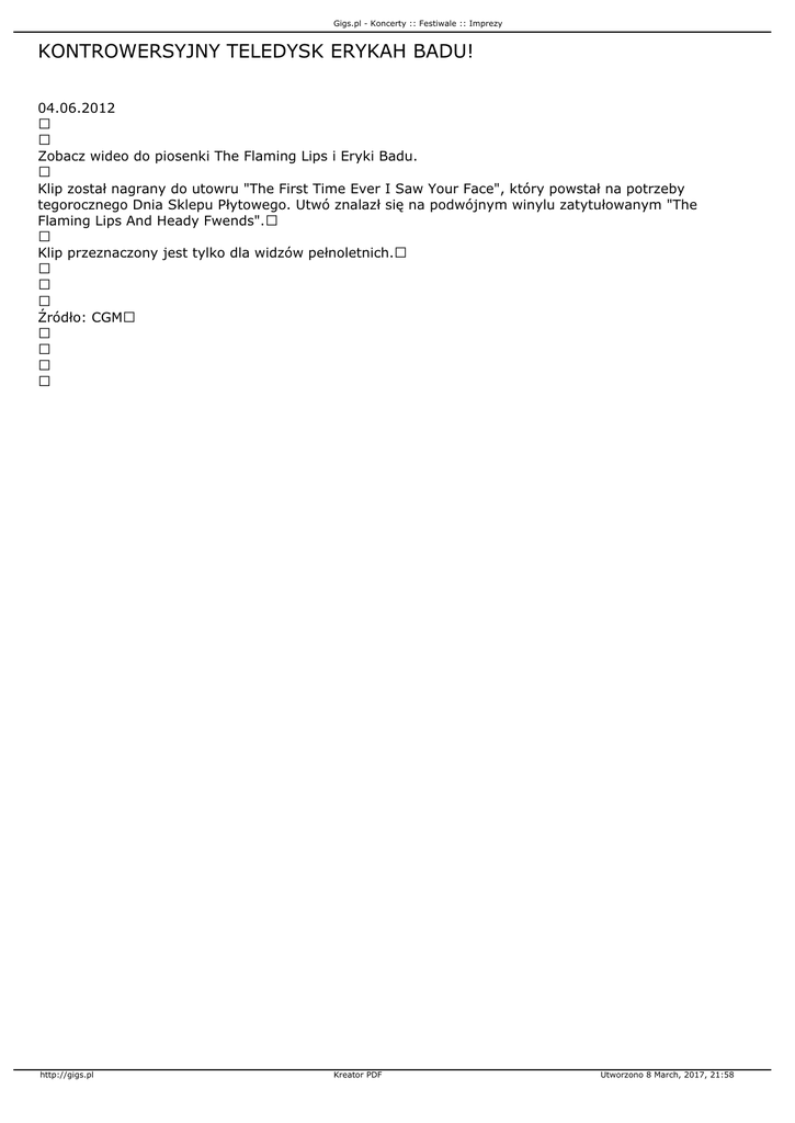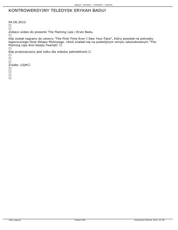 Gigs.pl - Koncerty :: Festiwale :: Imprezy KONTROWERSYJNY TELEDYSK ERYKAH BADU! 04.06.2012 Zobacz wideo do piosenki The Flaming Lips i Eryki Badu. Klip został nagrany do utowru "The First Time Ever I Saw Your Face", który powstał na potrzeby tegorocznego Dnia Sklepu Płytowego. Utwó znalazł się na podwójnym winylu zatytułowanym "The Flaming Lips And Heady Fwends". Klip przeznaczony jest tylko dla widzów pełnoletnich. Źródło: CGM http://gigs.pl Kreator PDF Utworzono 8 March, 2017, 21:58