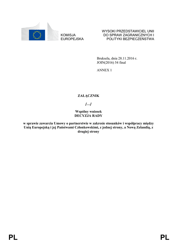 WYSOKI PRZEDSTAWICIEL UNII DO SPRAW ZAGRANICZNYCH I POLITYKI BEZPIECZEŃSTWA KOMISJA EUROPEJSKA Bruksela, dnia 28.11.2016 r. JOIN(2016) 54 final ANNEX 1 ZAŁĄCZNIK […] Wspólny wniosek DECYZJA RADY w sprawie zawarcia Umowy o partnerstwie w zakresie stosunków i współpracy między Unią Europejską i jej Państwami Członkowskimi, z jednej strony, a Nową Zelandią, z drugiej strony PL PL UMOWA O PARTNERSTWIE W ZAKRESIE STOSUNKÓW I WSPÓŁPRACY MIĘDZY UNIĄ EUROPEJSKĄ I JEJ PAŃSTWAMI CZŁONKOWSKIMI, Z JEDNEJ STRONY, A NOWĄ ZELANDIĄ, Z DRUGIEJ STRONY EU/NZ/pl 1 UNIA EUROPEJSKA, zwana dalej „Unią”, oraz KRÓLESTWO BELGII, REPUBLIKA BUŁGARII, REPUBLIKA CZESKA, KRÓLESTWO DANII, REPUBLIKA FEDERALNA NIEMIEC, REPUBLIKA ESTOŃSKA, IRLANDIA, REPUBLIKA GRECKA, KRÓLESTWO HISZPANII, REPUBLIKA FRANCUSKA, REPUBLIKA CHORWACJI, REPUBLIKA WŁOSKA, EU/NZ/pl 2 REPUBLIKA CYPRYJSKA, REPUBLIKA ŁOTEWSKA, REPUBLIKA LITEWSKA, WIELKIE KSIĘSTWO LUKSEMBURGA, WĘGRY, REPUBLIKA MALTY, KRÓLESTWO NIDERLANDÓW, REPUBLIKA AUSTRII, RZECZPOSPOLITA POLSKA, REPUBLIKA PORTUGALSKA, RUMUNIA, REPUBLIKA SŁOWENII, REPUBLIKA SŁOWACKA, EU/NZ/pl 3 REPUBLIKA FINLANDII, KRÓLESTWO SZWECJI, ZJEDNOCZONE KRÓLESTWO WIELKIEJ BRYTANII I IRLANDII PÓŁNOCNEJ, państwa członkowskie Unii Europejskiej, zwane dalej „państwami członkowskimi”, z jednej strony, oraz NOWA ZELANDIA, z drugiej strony, zwane dalej „Stronami”, EU/NZ/pl 4 UWZGLĘDNIAJĄC łączące je wartości i bliskie więzy historyczne, polityczne, gospodarcze i kulturowe, Z ZADOWOLENIEM PRZYJMUJĄC postępy osiągnięte w rozwijaniu wzajemnie korzystnych stosunków od czasu przyjęcia wspólnej deklaracji w sprawie stosunków i współpracy między Unią Europejską a Nową Zelandią w dniu 21 września 2007 r., POTWIERDZAJĄC zobowiązanie do realizacji celów i zasad wyrażonych w Karcie Narodów Zjednoczonych („Karta ONZ”) oraz do wzmocnienia roli Organizacji Narodów Zjednoczonych („ONZ”), POTWIERDZAJĄC zobowiązanie do przestrzegania zasad demokracji i praw człowieka, ustanowionych w Powszechnej deklaracji praw człowieka i innych istotnych międzynarodowych aktach prawnych dotyczących praw człowieka, jak również zasad praworządności i dobrych rządów, UZNAJĄC szczególne zobowiązanie rządu Nowej Zelandii do przestrzegania zasad Traktatu z Waitangi, PODKREŚLAJĄC wszechstronny charakter swoich stosunków i znaczenie zapewnienia spójnych ram wspierających rozwój tych stosunków, WYRAŻAJĄC wspólną chęć do przeniesienia stosunków na poziom zacieśnionego partnerstwa, POTWIERDZAJĄC dążenie do zacieśnienia i rozwoju dialogu politycznego i współpracy, DĄŻĄC do umocnienia, pogłębienia i zróżnicowania współpracy w dziedzinach będących przedmiotem wspólnego zainteresowania na szczeblu dwustronnym, regionalnym i globalnym dla obopólnej korzyści, EU/NZ/pl 5 UZNAJĄC potrzebę zacieśnienia współpracy w dziedzinach sprawiedliwości, wolności i bezpieczeństwa, UZNAJĄC pragnienie wspierania zrównoważonego rozwoju w aspekcie gospodarczym, społecznym i środowiskowym; UZNAJĄC TAKŻE, że w ich wspólnym interesie leży propagowanie wzajemnego zrozumienia i silnych więzi międzyludzkich, m.in. dzięki turystyce, wzajemnym uzgodnieniom, które umożliwiają młodym ludziom wyjazd do innego kraju i podjęcie pracy i nauki oraz odbywanie innych krótkich wizyt, POTWIERDZAJĄC zdecydowane zobowiązanie do wspierania wzrostu gospodarczego, światowego ładu gospodarczego, stabilności finansowej oraz skutecznego multilateralizmu, POTWIERDZAJĄC zobowiązanie do współpracy na rzecz międzynarodowego pokoju i bezpieczeństwa, OPIERAJĄC SIĘ NA umowach zawartych między Unią a Nową Zelandią, przede wszystkim dotyczących zarządzania kryzysowego, nauki i technologii, usług lotniczych, procedur oceny zgodności oraz środków sanitarnych, EU/NZ/pl 6 STWIERDZAJĄC, że w przypadku gdy Strony postanowią zawrzeć, w ramach niniejszej Umowy, umowy szczegółowe dotyczące przestrzeni wolności, bezpieczeństwa i sprawiedliwości, które mają zostać zawarte przez Unię na mocy części trzeciej tytuł V Traktatu o funkcjonowaniu Unii Europejskiej, postanowienia takich przyszłych umów nie będą wiążące dla Zjednoczonego Królestwa ani Irlandii, chyba że Unia wraz ze Zjednoczonym Królestwem lub Irlandią, odnośnie do ich poprzednich stosunków dwustronnych, zawiadomi Nową Zelandię, że Zjednoczone Królestwo lub Irlandia mają zostać związane taką umową jako część Unii zgodnie z protokołem nr 21 w sprawie stanowiska Zjednoczonego Królestwa i Irlandii w odniesieniu do przestrzeni wolności, bezpieczeństwa i sprawiedliwości, załączonego do Traktatu o Unii Europejskiej i Traktatu o funkcjonowaniu Unii Europejskiej. Podobnie wszelkie późniejsze środki wewnętrzne Unii, które miałyby zostać przyjęte zgodnie z wyżej wymienionym tytułem V w celu wykonania niniejszej umowy, nie byłyby wiążące dla Zjednoczonego Królestwa ani Irlandii, chyba że zgłosiłyby one chęć uczestnictwa w takich środkach lub ich przyjęcia zgodnie z protokołem nr 21. Odnotowując również, że takie przyszłe umowy lub takie późniejsze środki wewnętrzne Unii wchodziłyby w zakres protokołu nr 22 w sprawie stanowiska Danii załączonego do wspomnianych Traktatów, POSTANAWIAJĄ, CO NASTĘPUJE: EU/NZ/pl 7 TYTUŁ I POSTANOWIENIA OGÓLNE ARTYKUŁ 1 Cel Umowy Celem niniejszej Umowy jest ustanowienie zacieśnionego partnerstwa między Stronami oraz pogłębienie i usprawnienie współpracy w kwestiach będących przedmiotem wspólnego zainteresowania, odzwierciedlających wspólne wartości i zasady, między innymi przez nasilenie dialogu na wysokim szczeblu. ARTYKUŁ 2 Podstawa współpracy 1. Strony potwierdzają zobowiązanie do przestrzegania zasad demokracji, praw człowieka i podstawowych wolności oraz praworządności i dobrej administracji. Poszanowanie zasad demokracji i praw człowieka or