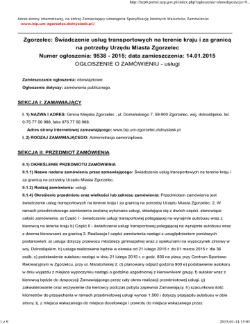 1z9 http://bzp0.portal.uzp.gov.pl/index.php?ogloszenie=show&pozycja=9... Adres strony internetowej, na której Zamawiający udostępnia Specyfikację Istotnych Warunków Zamówienia: www.bip.um-zgorzelec.dolnyslask.pl/ Zgorzelec: Świadczenie usług transportowych na terenie kraju i za granicą na potrzeby Urzędu Miasta Zgorzelec Numer ogłoszenia: 9538 - 2015; data zamieszczenia: 14.01.2015 OGŁOSZENIE O ZAMÓWIENIU - usługi Zamieszczanie ogłoszenia: obowiązkowe. Ogłoszenie dotyczy: zamówienia publicznego. SEKCJA I: ZAMAWIAJĄCY I. 1) NAZWA I ADRES: Gmina Miejska Zgorzelec , ul. Domańskiego 7, 59-900 Zgorzelec, woj. dolnośląskie, tel. 0-75 77 56 988, faks 075 77 56 988. Adres strony internetowej zamawiającego: www.bip.um-zgorzelec.dolnyslask.pl I. 2) RODZAJ ZAMAWIAJĄCEGO: Administracja samorządowa. SEKCJA II: PRZEDMIOT ZAMÓWIENIA II.1) OKREŚLENIE PRZEDMIOTU ZAMÓWIENIA II.1.1) Nazwa nadana zamówieniu przez zamawiającego: Świadczenie usług transportowych na terenie kraju i za granicą na potrzeby Urzędu Miasta Zgorzelec. II.1.2) Rodzaj zamówienia: usługi. II.1.4) Określenie przedmiotu oraz wielkości lub zakresu zamówienia: Przedmiotem zamówienia jest świadczenie usług transportowych na terenie kraju i za granicą na potrzeby Urzędu Miasta Zgorzelec. 2. W ramach przedmiotowego zamówienia zostaną wykonane usługi, składające się z dwóch części, stanowiące całość zamówienia: a) Część I - świadczenie usługi transportowej polegającej na wynajmie autobusu wraz z kierowcą na terenie kraju b) Część II - świadczenie usługi transportowej polegającej na wynajmie autobusu wraz z dwoma kierowcami za granicą 3. Realizacja I części zamówienia nastąpi z uwzględnieniem poniższych postanowień: a) usługa dotyczy przewozu młodzieży gimnazjalnej wraz z opiekunami na wypoczynek zimowy w woj. Dolnośląskim. b) usługa realizowana będzie w okresie od 21 lutego 2015 r. do 01 marca 2015 r. dla 36 osób. c) podstawienie autokaru nastąpi w dniu 21 lutego 2015 r. o godz. 830 na placu przy Centrum Sportowo Rekreacyjnym w Zgorzelcu, przy ul. Maratońskiej 2. d) planowany odjazd godzina 900 e) podstawienie autokaru w dniu wyjazdu z miejsca wypoczynku nastąpi o godzinie uzgodnionej z kierownikiem grupy. f) autokar wraz z kierowcą będzie do dyspozycji Zamawiającego przez cały okres realizacji przedmiotowej usługi. g) zakwaterowanie oraz wyżywienie dla kierowcy podczas pobytu zapewnia Zamawiający. h) szacunkowa ilość kilometrów do przejechania w ramach przedmiotowej usługi wynosi 1.500 i dotyczy przejazdu autobusu w obie strony, tj. z miejsca wskazanego do miejsca docelowego i powrotu do miejsca wskazanego przez 2015-01-14 15:03 2z9 http://bzp0.portal.uzp.gov.pl/index.php?ogloszenie=show&pozycja=9... Zamawiającego, z zastrzeżeniem pkt. 3 ppkt. 3 lit. i SIWZ. i) podczas pobytu Zamawiający planuje wycieczki z wykorzystaniem autokaru, w ramach podanej szacunkowej ilości kilometrów, tj. 1.500. j) opłaty za parkingi w trakcie wycieczek oraz na miejscu pobytu ponosi Zamawiający k) autokar musi posiadać co najmniej 40 miejsc siedzących oraz miejsca na bagaże. 4. Realizacja II części zamówienia nastąpi z uwzględnieniem poniższych postanowień: a) usługa dotyczy przewozu młodzieży gimnazjalnej wraz z opiekunami na wypoczynek letni do Francji. Zamawiający wymaga realizacji usługi przez 2 kierowców b) usługa realizowana będzie w okresie od 05 lipca 2015 r. do 17 lipca 2015 r. dla 46 osób c) podstawienie autokaru nastąpi w dniu 05 lipca 2015 r. o godz. 1930 na placu przy Centrum Sportowo Rekreacyjnym w Zgorzelcu, przy ul. Maratońskiej 2. d) planowany odjazd godzina 2000 e) podstawienie autokaru w dniu wyjazdu z miejsca wypoczynku nastąpi o godzinie uzgodnionej z kierownikiem grupy. f) autokar wraz z 2 kierowcami będzie do dyspozycji Zamawiającego przez cały okres realizacji przedmiotowej usługi. g) zakwaterowanie oraz wyżywienie dla dwóch kierowców podczas pobytu zapewnia Zamawiający. h) szacunkowa ilość kilometrów do przejechania w ramach przedmiotowej usługi wynosi 4.000 i dotyczy przejazdu autobusu w obie strony, tj. z miejsca wskazanego do miejsca docelowego i powrotu do miejsca wskazanego przez Zamawiającego, z zastrzeżeniem pkt. 3 ppkt. 4 lit. i SIWZ. i) podczas pobytu Zamawiający planuje wycieczki z wykorzystaniem autokaru, w ramach podanej szacunkowej ilości kilometrów, tj. 4.000. j) opłaty za parkingi w trakcie wycieczek oraz na miejscu pobytu ponosi Zamawiający k) autokar musi posiadać co najmniej 50 miejsc siedzących oraz miejsca na bagaże. 5. Zamawiający poinformuje Wykonawcę pisemnie o dokładnym miejscu wypoczynku na co najmniej 3 dni przed realizacją danej części zamówienia. 6. Przedmiot zamówienia w zakresie I oraz II części zamówienia będzie realizowany zgodnie z poniższymi zapisami: 1) Przewóz osób będzie realizowany środkami transportu dopuszczonymi do ruchu zgodnie z ustawą z dnia 20.06.1997 r. Prawo o ruchu drogowym.(t.j. Dz. U. z 2012 r., poz. 1137 ze zm.). 2) Usługi muszą być świadczone sprawnymi technicznie, zarejestrowanymi środkami transportu posiadającymi ważne badania techniczne oraz ubezpieczenie OC, AC i NNW. Niedopuszczalne jest świadczenie usługi środkiem transportu uszkodzonym, wycofanym z ruchu lub wyrejestrowanym. Zabronione jest przewożenie większej niż dopuszczalna liczby osób określonej w dowodzie rejestracyjnym. 3) Środki transportu muszą być wyposażone w sprawną klimatyzację, ogrzewanie, indywidualne nawiewy powietrza i oświetlenie, komfortowe rozkładane fotele, pasy bezpieczeństwa, zagłówki, oparcie dla stóp przy każdym siedzeniu, sprawną i czysta toaletę zaopatrzoną w niezbędne środki higieniczne, TV, DVD, ABS, ASR. Ponadto pojazdy muszą być wyposażone w sprawne przyrządy kontrolne, w tym tachometry oraz posiadać sprawną nawigację GPS co najmniej o zasięgu europejskim.. Rok produkcji środków transportu nie