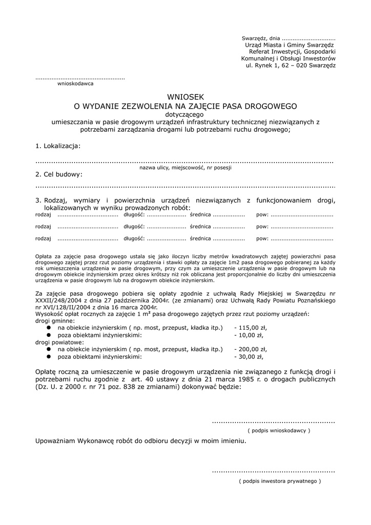 Swarzędz, dnia .............................. Urząd Miasta i Gminy Swarzędz Referat Inwestycji, Gospodarki Komunalnej i Obsługi Inwestorów ul. Rynek 1, 62 – 020 Swarzędz .................................................. wnioskodawca WNIOSEK O WYDANIE ZEZWOLENIA NA ZAJĘCIE PASA DROGOWEGO dotyczącego umieszczania w pasie drogowym urządzeń infrastruktury technicznej niezwiązanych z potrzebami zarządzania drogami lub potrzebami ruchu drogowego; 1. Lokalizacja: ..................................................................................................................................... 2. Cel budowy: nazwa ulicy, miejscowość, nr posesji ...................................................................................................................................... 3. Rodzaj, wymiary i powierzchnia urządzeń niezwiązanych z funkcjonowaniem drogi, lokalizowanych w wyniku prowadzonych robót: rodzaj .................................. długość: ...................... średnica .................. pow: ................................... rodzaj .................................. długość: ...................... średnica .................. pow: ................................... rodzaj .................................. długość: ...................... średnica .................. pow: ................................... Opłata za zajęcie pasa drogowego ustala się jako iloczyn liczby metrów kwadratowych zajętej powierzchni pasa drogowego zajętej przez rzut poziomy urządzenia i stawki opłaty za zajęcie 1m2 pasa drogowego pobieranej za każdy rok umieszczenia urządzenia w pasie drogowym, przy czym za umieszczenie urządzenia w pasie drogowym lub na drogowym obiekcie inżynierskim przez okres krótszy niż rok obliczana jest proporcjonalnie do liczby dni umieszczenia urządzenia w pasie drogowym lub na drogowym obiekcie inżynierskim. Za zajęcie pasa drogowego pobiera się opłaty zgodnie z uchwałą Rady Miejskiej w Swarzędzu nr XXXII/248/2004 z dnia 27 października 2004r. (ze zmianami) oraz Uchwałą Rady Powiatu Poznańskiego nr XVI/128/II/2004 z dnia 16 marca 2004r. Wysokość opłat rocznych za zajęcie 1 m2 pasa drogowego zajętych przez rzut poziomy urządzeń: drogi gminne: ● na obiekcie inżynierskim ( np. most, przepust, kładka itp.) - 115,00 zł, ● poza obiektami inżynierskimi: - 10,00 zł, drogi powiatowe: ● na obiekcie inżynierskim ( np. most, przepust, kładka itp.) - 200,00 zł, ● poza obiektami inżynierskimi: - 30,00 zł, Opłatę roczną za umieszczenie w pasie drogowym urządzenia nie związanego z funkcją drogi i potrzebami ruchu zgodnie z art. 40 ustawy z dnia 21 marca 1985 r. o drogach publicznych (Dz. U. z 2000 r. nr 71 poz. 838 ze zmianami) dokonywać będzie: ....................................................... ( podpis wnioskodawcy ) Upoważniam Wykonawcę robót do odbioru decyzji w moim imieniu. ....................................................... ( podpis inwestora prywatnego )