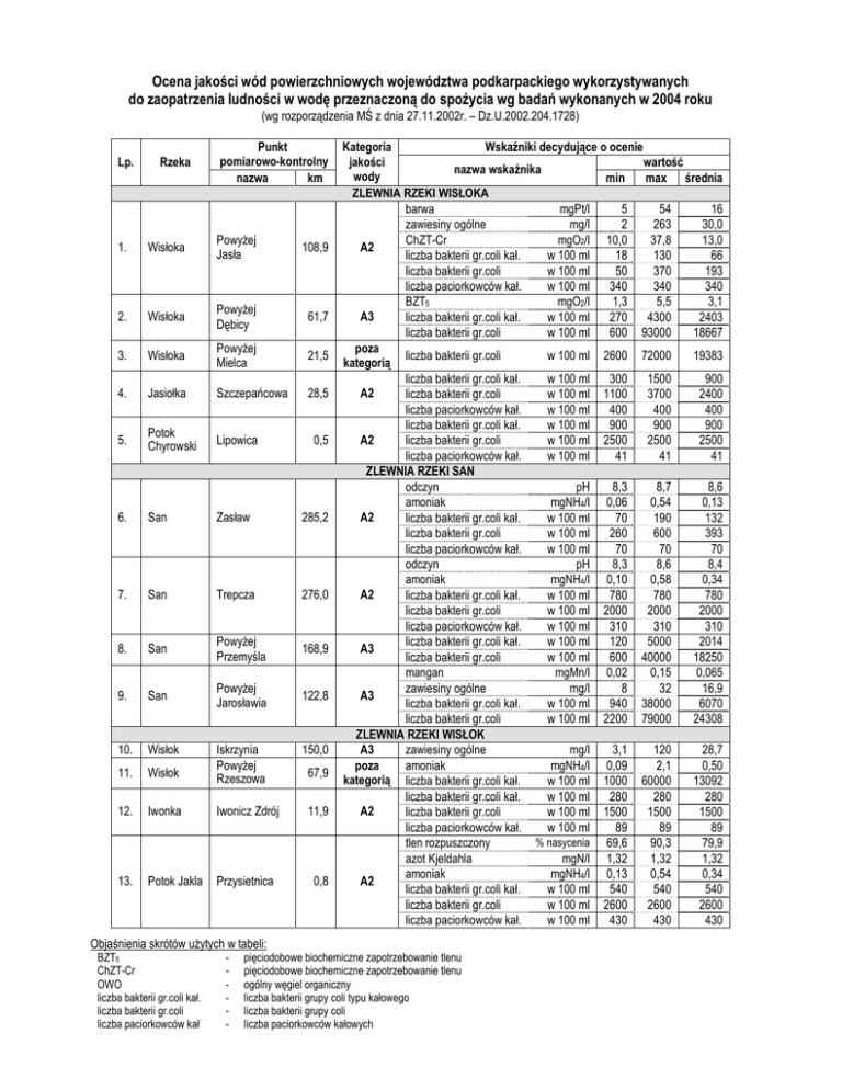 Ocena jakości wód powierzchniowych województwa podkarpackiego wykorzystywanych do zaopatrzenia ludności w wodę przeznaczoną do spożycia wg badań wykonanych w 2004 roku (wg rozporządzenia MŚ z dnia 27.11.2002r. – Dz.U.2002.204.1728) Lp. Rzeka Punkt pomiarowo-kontrolny nazwa km 1. Wisłoka Powyżej Jasła 108,9 2. Wisłoka Powyżej Dębicy 61,7 3. Wisłoka Powyżej Mielca 21,5 4. Jasiołka Szczepańcowa 28,5 5. Potok Chyrowski Lipowica 6. San Zasław 285,2 7. San Trepcza 276,0 8. San Powyżej Przemyśla 168,9 9. San Powyżej Jarosławia 122,8 10. Wisłok 11. Wisłok Iskrzynia Powyżej Rzeszowa 12. Iwonka Iwonicz Zdrój 11,9 13. Potok Jakla Przysietnica 0,8 0,5 150,0 67,9 Wskaźniki decydujące o ocenie Kategoria jakości wartość nazwa wskaźnika wody min max średnia ZLEWNIA RZEKI WISŁOKA barwa mgPt/l 5 54 16 zawiesiny ogólne mg/l 2 263 30,0 ChZT-Cr mgO2/l 10,0 37,8 13,0 A2 liczba bakterii gr.coli kał. w 100 ml 18 130 66 liczba bakterii gr.coli w 100 ml 50 370 193 liczba paciorkowców kał. w 100 ml 340 340 340 BZT5 mgO2/l 1,3 5,5 3,1 A3 liczba bakterii gr.coli kał. w 100 ml 270 4300 2403 liczba bakterii gr.coli w 100 ml 600 93000 18667 poza liczba bakterii gr.coli w 100 ml 2600 72000 19383 kategorią liczba bakterii gr.coli kał. w 100 ml 300 1500 900 A2 liczba bakterii gr.coli w 100 ml 1100 3700 2400 liczba paciorkowców kał. w 100 ml 400 400 400 liczba bakterii gr.coli kał. w 100 ml 900 900 900 A2 liczba bakterii gr.coli w 100 ml 2500 2500 2500 liczba paciorkowców kał. w 100 ml 41 41 41 ZLEWNIA RZEKI SAN odczyn pH 8,3 8,7 8,6 amoniak mgNH4/l 0,06 0,54 0,13 A2 liczba bakterii gr.coli kał. w 100 ml 70 190 132 liczba bakterii gr.coli w 100 ml 260 600 393 liczba paciorkowców kał. w 100 ml 70 70 70 odczyn pH 8,3 8,6 8,4 amoniak mgNH4/l 0,10 0,58 0,34 A2 liczba bakterii gr.coli kał. w 100 ml 780 780 780 liczba bakterii gr.coli w 100 ml 2000 2000 2000 liczba paciorkowców kał. w 100 ml 310 310 310 liczba bakterii gr.coli kał. w 100 ml 120 5000 2014 A3 liczba bakterii gr.coli w 100 ml 600 40000 18250 mangan mgMn/l 0,02 0,15 0,065 zawiesiny ogólne mg/l 8 32 16,9 A3 liczba bakterii gr.coli kał. w 100 ml 940 38000 6070 liczba bakterii gr.coli w 100 ml 2200 79000 24308 ZLEWNIA RZEKI WISŁOK A3 zawiesiny ogólne mg/l 3,1 120 28,7 poza amoniak mgNH4/l 0,09 2,1 0,50 kategorią liczba bakterii gr.coli kał. w 100 ml 1000 60000 13092 liczba bakterii gr.coli kał. w 100 ml 280 280 280 A2 liczba bakterii gr.coli w 100 ml 1500 1500 1500 liczba paciorkowców kał. w 100 ml 89 89 89 % nasycenia 69,6 tlen rozpuszczony 90,3 79,9 azot Kjeldahla mgN/l 1,32 1,32 1,32 amoniak mgNH4/l 0,13 0,54 0,34 A2 liczba bakterii gr.coli kał. w 100 ml 540 540 540 liczba bakterii gr.coli w 100 ml 2600 2600 2600 liczba paciorkowców kał. w 100 ml 430 430 430 Objaśnienia skrótów użytych w tabeli: BZT5 ChZT-Cr OWO liczba bakterii gr.coli kał. liczba bakterii gr.coli liczba paciorkowców kał - pięciodobowe biochemiczne zapotrzebowanie tlenu pięciodobowe biochemiczne zapotrzebowanie tlenu ogólny węgiel organiczny liczba bakterii grupy coli typu kałowego liczba bakterii grupy coli liczba paciorkowców kałowych
