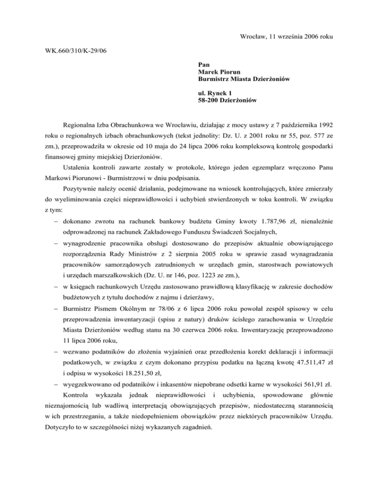 Wrocław, 11 września 2006 roku WK.660/310/K-29/06 Pan Marek Piorun Burmistrz Miasta Dzierżoniów ul. Rynek 1 58-200 Dzierżoniów Regionalna Izba Obrachunkowa we Wrocławiu, działając z mocy ustawy z 7 października 1992 roku o regionalnych izbach obrachunkowych (tekst jednolity: Dz. U. z 2001 roku nr 55, poz. 577 ze zm.), przeprowadziła w okresie od 10 maja do 24 lipca 2006 roku kompleksową kontrolę gospodarki finansowej gminy miejskiej Dzierżoniów. Ustalenia kontroli zawarte zostały w protokole, którego jeden egzemplarz wręczono Panu Markowi Piorunowi - Burmistrzowi w dniu podpisania. Pozytywnie należy ocenić działania, podejmowane na wniosek kontrolujących, które zmierzały do wyeliminowania części nieprawidłowości i uchybień stwierdzonych w toku kontroli. W związku z tym: − dokonano zwrotu na rachunek bankowy budżetu Gminy kwoty 1.787,96 zł, nienależnie odprowadzonej na rachunek Zakładowego Funduszu Świadczeń Socjalnych, − wynagrodzenie pracownika obsługi dostosowano do przepisów aktualnie obowiązującego rozporządzenia Rady Ministrów z 2 sierpnia 2005 roku w sprawie zasad wynagradzania pracowników samorządowych zatrudnionych w urzędach gmin, starostwach powiatowych i urzędach marszałkowskich (Dz. U. nr 146, poz. 1223 ze zm.), − w księgach rachunkowych Urzędu zastosowano prawidłową klasyfikację w zakresie dochodów budżetowych z tytułu dochodów z najmu i dzierżawy, − Burmistrz Pismem Okólnym nr 78/06 z 6 lipca 2006 roku powołał zespół spisowy w celu przeprowadzenia inwentaryzacji (spisu z natury) druków ścisłego zarachowania w Urzędzie Miasta Dzierżoniów według stanu na 30 czerwca 2006 roku. Inwentaryzację przeprowadzono 11 lipca 2006 roku, − wezwano podatników do złożenia wyjaśnień oraz przedłożenia korekt deklaracji i informacji podatkowych, w związku z czym dokonano przypisu podatku na łączną kwotę 47.511,47 zł i odpisu w wysokości 18.251,50 zł, − wyegzekwowano od podatników i inkasentów niepobrane odsetki karne w wysokości 561,91 zł. Kontrola wykazała jednak nieprawidłowości i uchybienia, spowodowane głównie nieznajomością lub wadliwą interpretacją obowiązujących przepisów, niedostateczną starannością w ich przestrzeganiu, a także niedopełnieniem obowiązków przez niektórych pracowników Urzędu. Dotyczyło to w szczególności niżej wykazanych zagadnień. 2 W zakresie spraw organizacyjnych oraz prowadzenia ksiąg rachunkowych W aktualnie obowiązującym Regulaminie Organizacyjnym Urzędu zapisano, że do zadań Sekretarza należy również zatwierdzenie poleceń wyjazdów służbowych oraz karty urlopowej dla Burmistrza. Powyższe narusza art. 4 ust. 1 ustawy z 22 marca 1990 roku o pracownikach samorządowych (tekst jednolity: Dz. U. z 2001 roku nr 142, poz. 1593 ze zm.), zgodnie z którym czynności z zakresu prawa pracy wobec burmistrza dokonuje organ stanowiący jednostki samorządu terytorialnego lub w zakresie ustalonym przez ten organ w odrębnej uchwale jego przewodniczący. Burmistrz wbrew postanowieniom zawartym w art. 35a ust. 3 ustawy z 26 listopada 1998 roku o finansach publicznych (tekst jednolity: Dz. U. z 2003 roku nr 15, poz. 148 ze zm.) - obecnie: art. 47 ust. 3 ustawy z 30 czerwca 2005 roku o finansach publicznych (Dz. U. nr 249, poz. 2104 ze zm.), nie ustalił w formie pisemnej, biorąc pod uwagę standardy określone przez Ministra Finansów w Zarządzeniu nr 1/KF/2003 z 30 stycznia 2003 roku (Dz. Urz. z 2003 roku nr 3, poz. 13), procedur kontroli finansowej dotyczącej procesów związanych z gromadzeniem i rozdysponowaniem środków publicznych oraz gospodarowaniem mieniem. Ponadto, Burmistrz nie wywiązał się z obowiązku wynikającego z przepisu art. 127 ust. 2 i 3 ustawy z 26 listopada 1998 roku o finansach publicznych dotyczącego przeprowadzenia za 2003 i 2004 rok kontroli przestrzegania przez podległe i nadzorowane jednostki organizacyjne Gminy realizacji procedur kontroli ustalonych przez kierowników wspomnianych jednostek, którą to kontrolą należało objąć co najmniej 5% wydatków podległych i nadzorowanych jednostek organizacyjnych. W przyjętych zasadach (polityce) rachunkowości postanowiono, że środki trwałe o wartości nie przekraczającej 210 zł muszą być jednorazowo umarzane i księgowane na koncie 013 „Pozostałe środki trwałe”. Tymczasem faktycznie przedmiotowe środki trwałe były objęte wyłącznie ewidencją ilościową. W myśl art. 10 ust. 2 ustawy z 29 września 1994 roku o rachunkowości (tekst jednolity: Dz. U. z 2002 roku nr 76, poz. 694 ze zm.) kierownik jednostki ustala w formie pisemnej i aktualizuje dokumentację opisującą w języku polskim przyjęte przez nią zasady (politykę) rachunkowości. Wbrew postanowieniom zawartym w art. 17 ust. 1 pkt. 1 ustawy o rachunkowości nie prowadzono kont ksiąg pomocniczych dla gruntów rolnych i dróg. W dziennikach wydatków i dochodów dokonywano zapisów o treści „brak zapisu” i wartości 0,01 zł, pomimo braku dowodów (danych) księgowych (źródłowych) będących podstawą do dokonania takich zapisów, a następnie operacje te wyksięgowywano poprzez techniczny zapis ujemny (storno czerwone). Powyższe naruszało art. 20 ust. 2, 3, 4, 5 ustawy o rachunkowości z którego wynika, że podstawą zapisów w księgach rachunkowych są dowody (dane) księgowe (zewnętrzne, wewnętrzne, zbiorcze, korygujące, zastępcze, rozliczeniowe) stwierdzające dokonanie operacji gospodarczej. Wydatki związane z realizacją inwestycji „Budowa trybun w Szkole Podstawowej nr 9 w Dzierżoniowie ujęto w ewidencji księgowej po stronie Wn konta 080 „Inwestycje” (środki trwałe w budowie) na podstawie kserokopii faktur VAT. Oryginały faktur otrzymane od kontrahentów zostały podłączone do dokumentacji inwestycji bez dokonania na nich oznaczenia numeru identyfikacyjnego dowodu księgowego. Powyższe naruszało art. 20 ust. 2 pkt 1 ustawy 3 o rachunkowo
