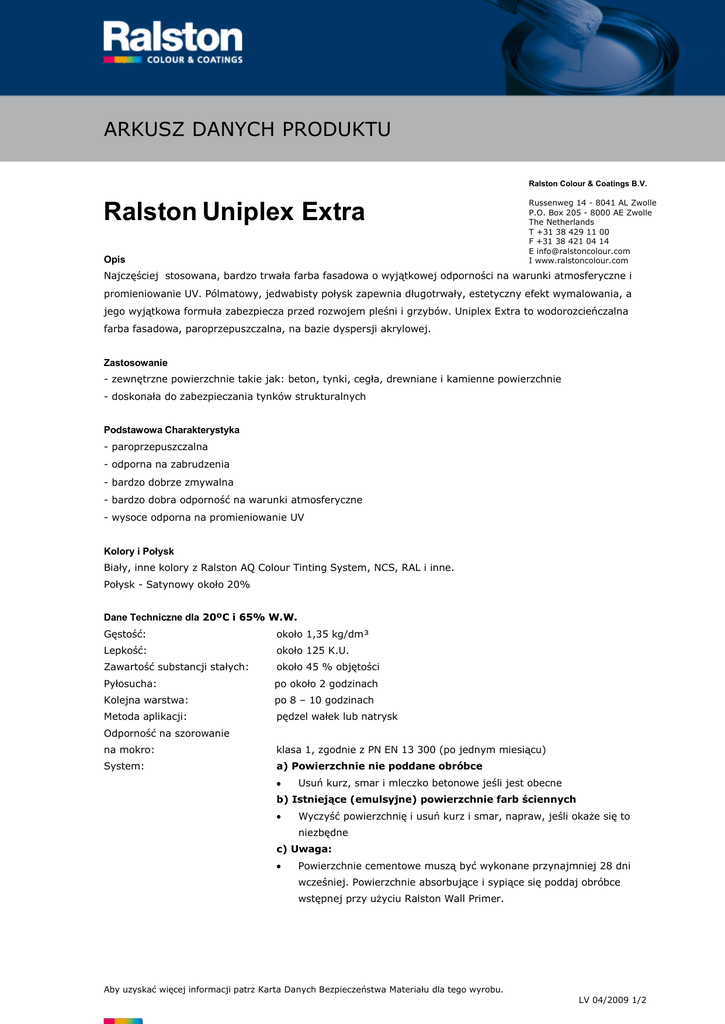 ARKUSZ DANYCH PRODUKTU Ralston Colour & Coatings B.V. Ralston Uniplex Extra Opis Russenweg 14 - 8041 AL Zwolle P.O. Box 205 - 8000 AE Zwolle The Netherlands T +31 38 429 11 00 F +31 38 421 04 14 E [email protected] I www.ralstoncolour.com Najczęściej stosowana, bardzo trwała farba fasadowa o wyjątkowej odporności na warunki atmosferyczne i promieniowanie UV. Pólmatowy, jedwabisty połysk zapewnia długotrwały, estetyczny efekt wymalowania, a jego wyjątkowa formuła zabezpiecza przed rozwojem pleśni i grzybów. Uniplex Extra to wodorozcieńczalna farba fasadowa, paroprzepuszczalna, na bazie dyspersji akrylowej. Zastosowanie - zewnętrzne powierzchnie takie jak: beton, tynki, cegła, drewniane i kamienne powierzchnie - doskonała do zabezpieczania tynków strukturalnych Podstawowa Charakterystyka - paroprzepuszczalna - odporna na zabrudzenia - bardzo dobrze zmywalna - bardzo dobra odporność na warunki atmosferyczne - wysoce odporna na promieniowanie UV Kolory i Połysk Biały, inne kolory z Ralston AQ Colour Tinting System, NCS, RAL i inne. Połysk - Satynowy około 20% Dane Techniczne dla 20ºC i 65% W.W. Gęstość: około 1,35 kg/dm³ Lepkość: około 125 K.U. Zawartość substancji stałych: około 45 % objętości Pyłosucha: po około 2 godzinach Kolejna warstwa: po 8 – 10 godzinach Metoda aplikacji: pędzel wałek lub natrysk Odporność na szorowanie na mokro: klasa 1, zgodnie z PN EN 13 300 (po jednym miesiącu) System: a) Powierzchnie nie poddane obróbce Usuń kurz, smar i mleczko betonowe jeśli jest obecne b) Istniejące (emulsyjne) powierzchnie farb ściennych Wyczyść powierzchnię i usuń kurz i smar, napraw, jeśli okaże się to niezbędne c) Uwaga: Powierzchnie cementowe muszą być wykonane przynajmniej 28 dni wcześniej. Powierzchnie absorbujące i sypiące się poddaj obróbce wstępnej przy użyciu Ralston Wall Primer. Aby uzyskać więcej informacji patrz Karta Danych Bezpieczeństwa Materiału dla tego wyrobu. LV 04/2009 1/2 ARKUSZ DANYCH PRODUKTU Informacje o natrysku: malowanie wspomagane powietrzem / malowanie hydrodynamiczne ciśnienie: 0,2-0,4 MPa (3-4 barów) 10-13 MPa (110-130 barów) dysza: 1,8-2,2 mm 0,018-0,021 cala (0,46-0,53 mm) Rozpuszczalnik : około 10% wody około 5% wody Wydajność Praktyczna wydajność Około 6-8 m²/l dwukrotnego malowania. Zależy od chłonności, porowatości podłoża, metody aplikacji i zastosowanych narzędzi malarskich około 60-85% teoretycznej wydajności rozprowadzenia. Podłoże: Podłoże powinno być stabilne, suche, czyste, wolne od zanieczyszczeń Gruntowanie: Ralston Wall Primer Warunki przetwarzania - temperatura otoczenia minimum 8ºC - maksymalna wilgotność względna 85% Instrukcja użycia - dobrze wymieszać przed użyciem - rozcieńczalnik: gotowa do użycia - narzędzia oczyścić wodą Opakowanie 1l, 2,5l, 5l i 10l – kolory 2,5l, 5 l i 10 l - biały Składowanie Przechowywać w zamkniętym oryginalnym opakowaniu w chłodnym i suchym miejscu. Chronić przed mrozem. Środowisko i zdrowie Temperatura zapłonu – niepalny Uregulowania prawne – zgodny z międzynarodowymi przepisami w zakresie ochrony zdrowia oraz ochrony środowiska. Szczegółowe informacje znajdują się w Karcie Danych Bezpieczeństwa Materiału. Aby uzyskać więcej informacji patrz Karta Danych Bezpieczeństwa Materiału dla tego wyrobu. LV 04/2009 2/2