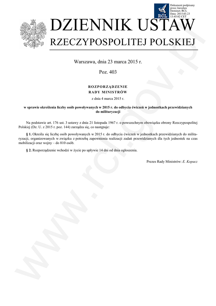 Dokument podpisany przez Jarosław Deminet; RCL Data: 2015.03.23 13:45:02 CET rcl .go v.p l DZIENNIK USTAW RZECZYPOSPOLITEJ POLSKIEJ Warszawa, dnia 23 marca 2015 r. Poz. 403 RO ZP O R ZĄ D ZE N I E RA DY M I NI S TR Ó W z dnia 4 marca 2015 r. w sprawie określenia liczby osób powoływanych w 2015 r. do odbycia ćwiczeń w jednostkach przewidzianych do militaryzacji Na podstawie art. 176 ust. 3 ustawy z dnia 21 listopada 1967 r. o powszechnym obowiązku obrony Rzeczypospolitej Polskiej (Dz. U. z 2015 r. poz. 144) zarządza się, co następuje: § 1. Określa się liczbę osób powoływanych w 2015 r. do odbycia ćwiczeń w jednostkach przewidzianych do militaryzacji, organizowanych w związku z potrzebą zapewnienia realizacji zadań przewidzianych dla tych jednostek na czas mobilizacji oraz wojny – do 810 osób. ww w. § 2. Rozporządzenie wchodzi w życie po upływie 14 dni od dnia ogłoszenia. Prezes Rady Ministrów: E. Kopacz