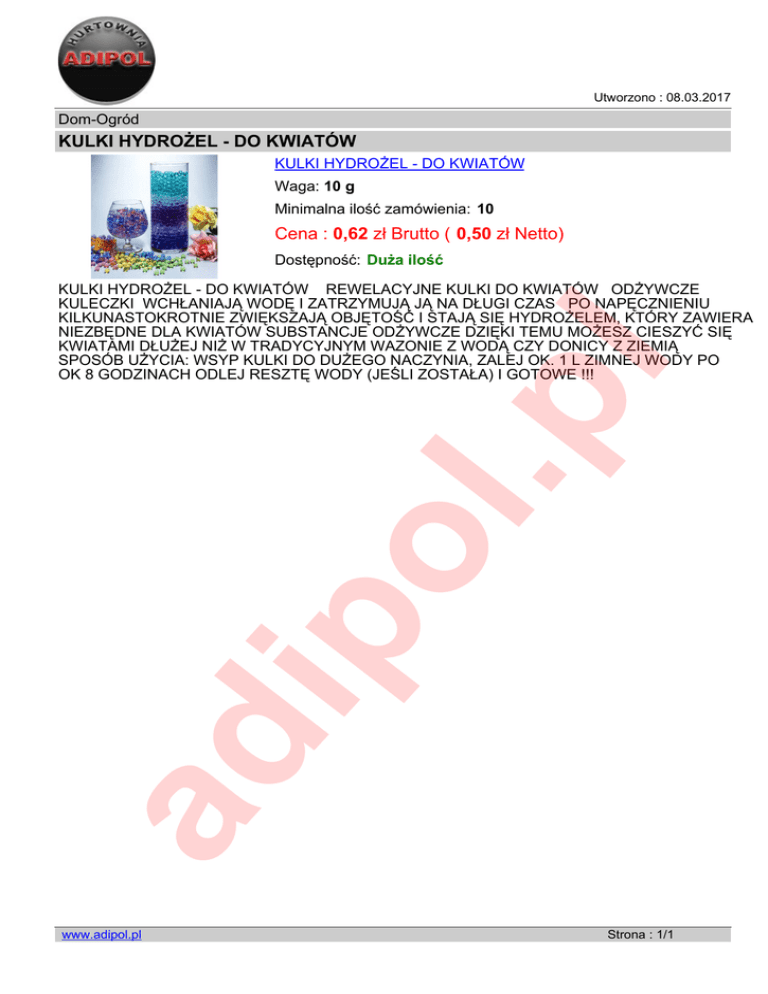 Utworzono : 08.03.2017 Dom-Ogród KULKI HYDROŻEL - DO KWIATÓW KULKI HYDROŻEL - DO KWIATÓW Waga: 10 g Minimalna ilość zamówienia: 10 Cena : 0,62 zł Brutto ( 0,50 zł Netto) Dostępność: Duża ilość ad ip ol .p l KULKI HYDROŻEL - DO KWIATÓW REWELACYJNE KULKI DO KWIATÓW ODŻYWCZE KULECZKI WCHŁANIAJĄ WODĘ I ZATRZYMUJĄ JĄ NA DŁUGI CZAS PO NAPĘCZNIENIU KILKUNASTOKROTNIE ZWIĘKSZAJĄ OBJĘTOŚĆ I STAJĄ SIĘ HYDROŻELEM, KTÓRY ZAWIERA NIEZBĘDNE DLA KWIATÓW SUBSTANCJE ODŻYWCZE DZIĘKI TEMU MOŻESZ CIESZYĆ SIĘ KWIATAMI DŁUŻEJ NIŻ W TRADYCYJNYM WAZONIE Z WODĄ CZY DONICY Z ZIEMIĄ SPOSÓB UŻYCIA: WSYP KULKI DO DUŻEGO NACZYNIA, ZALEJ OK. 1 L ZIMNEJ WODY PO OK 8 GODZINACH ODLEJ RESZTĘ WODY (JEŚLI ZOSTAŁA) I GOTOWE !!! www.adipol.pl Powered by TCPDF (www.tcpdf.org) Strona : 1/1
