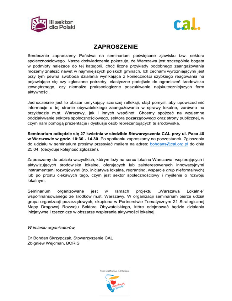 ZAPROSZENIE Serdecznie zapraszamy Państwa na seminarium poświęcone zjawisku tzw. sektora społecznościowego. Nasze doświadczenie pokazuje, że Warszawa jest szczególnie bogata w podmioty należące do tej kategorii, choć liczne przykłady podobnego zaangażowania możemy znaleźć nawet w najmniejszych polskich gminach. Ich cechami wyróżniającymi jest przy tym pewna swoboda działania wynikająca z konieczności szybkiego reagowania na pojawiające się czy zgłaszane potrzeby, elastyczne podejście do ograniczeń środowiska zewnętrznego, czy niemalże prakseologiczne poszukiwanie najskuteczniejszych form aktywności. Jednocześnie jest to obszar umykający szerszej refleksji, stąd pomysł, aby upowszechnić informacje o tej stronie obywatelskiego zaangażowania w sprawy lokalne, zarówno na przykładzie m.st. Warszawy, jak i innych wspólnot. Chcemy spojrzeć na wzajemne oddziaływanie sektora społecznościowego, sektora pozarządowego oraz strony publicznej, w czym nam pomogą prezentacje i dyskusje osób reprezentujących te środowiska. Seminarium odbędzie się 27 kwietnia w siedzibie Stowarzyszenia CAL przy ul. Paca 40 w Warszawie w godz. 10:30 - 14.30. Po spotkaniu zapraszamy na poczęstunek. Zgłoszenia do udziału w seminarium prosimy przesyłać mailem na adres: [email protected] do dnia 25.04. (decyduje kolejność zgłoszeń). Zapraszamy do udziału wszystkich, którym leży na sercu lokalna Warszawa: wspierających i aktywizujących środowiska lokalne, oferujących lub zainteresowanych innowacyjnymi instrumentami rozwojowymi (np. inicjatywa lokalna, regranting, wsparcie grup nieformalnych) lub po prostu ciekawych tego, czym jest sektor społecznościowy i myślenie o rozwoju lokalnym. Seminarium organizowane jest w ramach projektu „Warszawa Lokalnie” współfinansowanego ze środków m.st. Warszawy. W organizacji seminarium bierze udział grupa organizacji pozarządowych, skupiona w Partnerstwie Tematycznym 21 Strategicznej Mapy Drogowej Rozwoju Sektora Obywatelskiego, które odejmować będzie działania inicjatywne i rzecznicze w obszarze wspierania aktywności lokalnej. W imieniu organizatorów, Dr Bohdan Skrzypczak, Stowarzyszenie CAL Zbigniew Wejcman, BORIS PROGRAM SEMINARIUM 27 kwietnia 2016, ul. Paca 40 10.30 – 10.50 Powitanie. Wprowadzenie do projektu Warszawa Lokalnie oraz idei seminarium. 10.50 – 11.15 Różnorodność, zmiany, wyzwania sektora obywatelskiego – dr Magdalena Dudkiewicz 11.15 – 12.00 Sektor znany, nieodkryty. Badania nad sektorem społecznościowym - dr Bohdan Skrzypczak 12.00 – 12.25 Przerwa kawowa 12.25 – 13.15 Sektor społecznościowy – jak działamy? Prezentacja kilku przykładów, w tym gminy Koszajec, gminy Długosiodło, Osiedle Jazdów w Warszawie 13.15 – 14.00 Sektor społecznościowy - jak wspieramy? Dyskusja z udziałem m.in. Barbary Pędzich-Ciach (OWES BORIS) i Daniela Prędkopowicza (Fundusz Współpracy) oraz przedstawiciela Centrum Komunikacji Społecznej Urzędu m.st. Warszawy 14.00 – 14.30 Dyskusja dot. przyszłości sektora społecznościowego. Podsumowanie i zakończenie spotkania. Poczęstunek