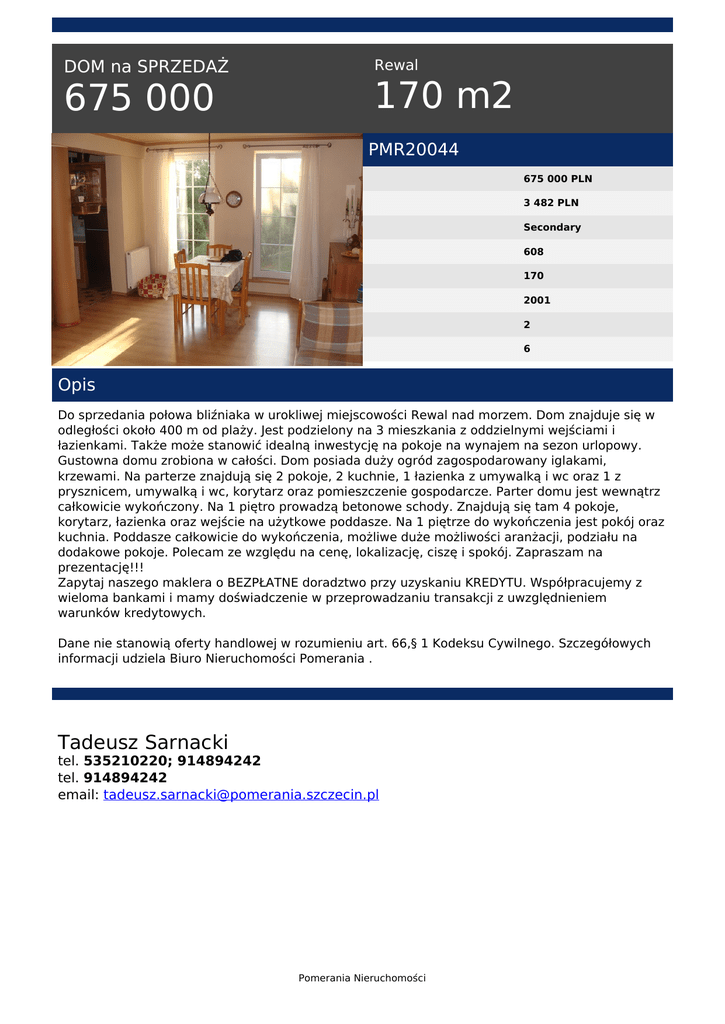 DOM na SPRZEDAŻ 675 000 Rewal 170 m2 PMR20044 675 000 PLN 3 482 PLN Secondary 608 170 2001 2 6 Opis Do sprzedania połowa bliźniaka w urokliwej miejscowości Rewal nad morzem. Dom znajduje się w odległości około 400 m od plaży. Jest podzielony na 3 mieszkania z oddzielnymi wejściami i łazienkami. Także może stanowić idealną inwestycję na pokoje na wynajem na sezon urlopowy. Gustowna domu zrobiona w całości. Dom posiada duży ogród zagospodarowany iglakami, krzewami. Na parterze znajdują się 2 pokoje, 2 kuchnie, 1 łazienka z umywalką i wc oraz 1 z prysznicem, umywalką i wc, korytarz oraz pomieszczenie gospodarcze. Parter domu jest wewnątrz całkowicie wykończony. Na 1 piętro prowadzą betonowe schody. Znajdują się tam 4 pokoje, korytarz, łazienka oraz wejście na użytkowe poddasze. Na 1 piętrze do wykończenia jest pokój oraz kuchnia. Poddasze całkowicie do wykończenia, możliwe duże możliwości aranżacji, podziału na dodakowe pokoje. Polecam ze względu na cenę, lokalizację, ciszę i spokój. Zapraszam na prezentację!!! Zapytaj naszego maklera o BEZPŁATNE doradztwo przy uzyskaniu KREDYTU. Współpracujemy z wieloma bankami i mamy doświadczenie w przeprowadzaniu transakcji z uwzględnieniem warunków kredytowych. Dane nie stanowią oferty handlowej w rozumieniu art. 66,§ 1 Kodeksu Cywilnego. Szczegółowych informacji udziela Biuro Nieruchomości Pomerania . Tadeusz Sarnacki tel. 535210220; 914894242 tel. 914894242 email: [email protected] Pomerania Nieruchomości Powered by TCPDF (www.tcpdf.org)