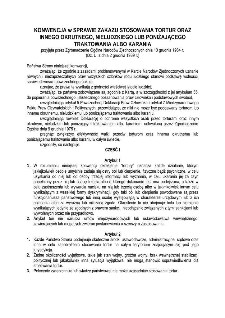 KONWENCJA w SPRAWIE ZAKAZU STOSOWANIA TORTUR ORAZ INNEGO OKRUTNEGO, NIELUDZKIEGO LUB PONIŻAJĄCEGO TRAKTOWANIA ALBO KARANIA przyjęta przez Zgromadzenie Ogólne Narodów Zjednoczonych dnia 10 grudnia 1984 r. (Dz. U. z dnia 2 grudnia 1989 r.) Państwa Strony niniejszej konwencji, zważając, że zgodnie z zasadami proklamowanymi w Karcie Narodów Zjednoczonych uznanie równych i niezaprzeczalnych praw wszystkich członków rodu ludzkiego stanowi podstawę wolności, sprawiedliwości i powszechnego pokoju, uznając, że prawa te wynikają z godności właściwej istocie ludzkiej, zważając, że państwa zobowiązane są, zgodnie z Kartą, a w szczególności z jej artykułem 55, do popierania powszechnego i skutecznego poszanowania praw człowieka i podstawowych swobód, uwzględniając artykuł 5 Powszechnej Deklaracji Praw Człowieka i artykuł 7 Międzynarodowego Paktu Praw Obywatelskich i Politycznych, przewidujące, że nikt nie może być poddawany torturom lub innemu okrutnemu, nieludzkiemu lub poniżającemu traktowaniu albo karaniu, uwzględniając również Deklarację o ochronie wszystkich osób przed torturami oraz innym okrutnym, nieludzkim lub poniżającym traktowaniem albo karaniem, uchwaloną przez Zgromadzenie Ogólne dnia 9 grudnia 1975 r., pragnąc zwiększyć efektywność walki przeciw torturom oraz innemu okrutnemu lub poniżającemu traktowaniu albo karaniu w całym świecie, uzgodniły, co następuje: CZĘŚĆ I Artykuł 1 1. W rozumieniu niniejszej konwencji określenie "tortury" oznacza każde działanie, którym jakiejkolwiek osobie umyślnie zadaje się ostry ból lub cierpienie, fizyczne bądź psychiczne, w celu uzyskania od niej lub od osoby trzeciej informacji lub wyznania, w celu ukarania jej za czyn popełniony przez nią lub osobę trzecią albo o którego dokonanie jest ona podejrzana, a także w celu zastraszenia lub wywarcia nacisku na nią lub trzecią osobę albo w jakimkolwiek innym celu wynikającym z wszelkiej formy dyskryminacji, gdy taki ból lub cierpienie powodowane są przez funkcjonariusza państwowego lub inną osobę występującą w charakterze urzędowym lub z ich polecenia albo za wyraźną lub milczącą zgodą. Określenie to nie obejmuje bólu lub cierpienia wynikających jedynie ze zgodnych z prawem sankcji, nieodłącznie związanych z tymi sankcjami lub wywołanych przez nie przypadkowo. 2. Artykuł ten nie narusza umów międzynarodowych lub ustawodawstwa wewnętrznego, zawierających lub mogących zwierać postanowienia o szerszym zastosowaniu. Artykuł 2 1. Każde Państwo Strona podejmuje skuteczne środki ustawodawcze, administracyjne, sądowe oraz inne w celu zapobieżenia stosowaniu tortur na całym terytorium znajdującym się pod jego jurysdykcją. 2. Żadne okoliczności wyjątkowe, takie jak stan wojny, groźba wojny, brak wewnętrznej stabilizacji politycznej lub jakakolwiek inna sytuacja wyjątkowa, nie mogą stanowić usprawiedliwienia dla stosowania tortur. 3. Polecenie zwierzchnika lub władzy państwowej nie może uzasadniać stosowania tortur. Artykuł 3 1. Żadne Państwo Strona nie może wydalać, zwracać lub wydawać innemu państwu danej osoby, jeżeli istnieją poważne podstawy, by sądzić, że może jej tam grozić stosowanie tortur. 2. Dla ustalenia istnienia takich podstaw właściwe władze uwzględniają wszelkie stosowne okoliczności, w tym, w odpowiednich wypadkach, istnienie w danym państwie stałej praktyki poważnych, jawnych i masowych naruszeń praw człowieka. Artykuł 4 1. Każde Państwo Strona zapewnia, aby wszelkie akty tortur stanowiły przestępstwa w rozumieniu jego prawa karnego. Powyższe odnosi się również do usiłowania użycia tortur i do czynów jakiejkolwiek osoby, stanowiących współudział lub udział w stosowaniu tortur. 2. Każde Państwo Strona przewiduje odpowiednie kary za te przestępstwa przy uwzględnieniu ich poważnego charakteru. Artykuł 5 1. Każde Państwo Strona podejmuje środki niezbędne dla ustanowienia swojej właściwości w odniesieniu do przestępstw wymienionych w artykule 4 w następujących wypadkach: a) gdy przestępstwa zostały popełnione na terytorium podlegającym jego jurysdykcji lub na pokładzie statku powietrznego bądź morskiego, zarejestrowanego w tym państwie, b) gdy domniemany sprawca przestępstwa jest obywatelem tego państwa, c) gdy ofiara jest obywatelem tego państwa, a państwo to uzna to za celowe. 2. Każde Państwo Strona podejmuje również środki niezbędne dla ustanowienia swojej właściwości w odniesieniu do tych przestępstw w wypadkach, gdy domniemany ich sprawca znajduje się na dowolnym terytorium pozostającym pod jego jurysdykcją, a państwo to nie wydaje go, zgodnie z art. 8, jednemu z państw wymienionych w ustępie 1 niniejszego artykułu. 3. Niniejsza konwencja nie wyłącza jurysdykcji w sprawach karnych, wykonywanej zgodnie z ustawodawstwem wewnętrznym. Artykuł 6 1. Upewniwszy się, po rozpatrzeniu będących w jego dyspozycji informacji, że okoliczności tego wymagają, każde Państwo Strona, na którego terytorium znajduje się osoba podejrzana o popełnienie przestępstwa określonego w artykule 4, dokonuje jej zatrzymania lub podejmuje inne środki prawne zabezpieczające jej obecność. Zatrzymanie oraz inne środki prawne realizowane są zgodnie z ustawodawstwem tego Państwa i mogą być utrzymane tylko na okres niezbędny dla podjęcia ścigania lub dokonania wydania osoby. 2. Wyżej wymienione Państwo przeprowadza niezwłocznie wstępne badanie sprawy. 3. Każdej osobie zatrzymanej na podstawie ustępu 1 niniejszego artykułu zapewnia się możliwość niezwłocznego porozumienia się z najbliższym odpowiednim przedstawicielem państwa, którego jest obywatelem, lub w razie gdy chodzi o bezpaństwowca, z przedstawicielem państwa, w którym zwykle zamieszkuje. 4. Jeżeli dane Państwo zgodnie z niniejszym artykułem dokonało zatrzymania osoby, zawiadamia o tym niezwłocznie państw