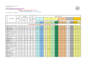 UNIWERSYTET MIKOŁAJA KOPERNIKA W TORUNIU WYDZIAŁ SZTUK PIĘKNYCH KIERUNEK: KONSERWACJA I RESTAURACJA DZIEŁ SZTUKI SPECJALNOŚĆ WEDŁUG UZYSKANYCH KWALIFIKACJI: Konserwacja i restauracja malarstwa i rzeźby polichromowanej Konserwacja i restauracja papieru i skóry Konserwacja i restauracja rzeźby kamiennej i detalu architektonicznego godziny zajęć w semestrze Egzamin Seminaria Punktacja ECTS Ćwiczenia Nazwa przedmiotu Wykłady Lp Razem godziny zajęć Zaliczenie na ocenę po sem. STUDIA STACJONARNE: JEDNOLITE MAGISTERSKIE I ROK II ROK IV ROK III ROK 2 pkt godz. 3 pkt godz. 4 pkt godz. 5 pkt godz. 7 6 pkt godz. pkt Treści podstawowe i przedmioty kierunkowe (przedmioty obowiązkowe) 1 Historia filozofii z elementami estetyki 3 30 30 1 30 3 2 Historia sztuki starożytnej 3 30 30 1 30 3 3 Wstęp do historii sztuki 4 60 30 30 1 60 4 4 6 75 30 45 2 15 2 5 Chemia w konserwacji zabytków Technologia i techniki sztuk plastycznych 3 30 30 6 Propedeutyka konserwacji dzieł sztuki 2 15 15 Pigmenty, spoiwa i podłoża malarskie 3 30 30 1 30 3 8 Technologie i metody datowania drewna 2 15 15 1 15 2 9 Pracownia anatomii plastycznej 7 90 90 1,2 45 Pracownia rysunku 13 300 300 1,2,3,4,5,6 45 11 Pracownia malarstwa Pracownia technik malarskich i 12 pozłotniczych 13 Pracownia rzeźby Historia sztuki średniowiecznej 14 powszechnej Podstawy informatyki (cyfrowe metody 15 dokumentacji zabytków) 8 270 270 1,2,3,4 75 3 60 60 2 60 60 3 30 1 30 Historia sztuki średniowiecznej polskiej 3 30 30 Historia sztuki nowożytnej powszechnej 30 7 10 16 60 4 30 3 15 2 4 45 3 2 45 2 60 2 60 2 2 75 2 60 2 60 2 2 60 3 2 60 2 2 30 3 30 1 2 30 3 30 2 15 1 2 2 30 30 45 2 5 30 2 5 60 3 30 2 3 2 30 Żywice sztuczne w konserwacji 18 zabytków 1 15 19 Ornamentyka 2 30 30 4 30 2 2 30 30 4 30 2 2 30 30 3 60 30 2 30 30 2 30 15 17 20 Historia sztuki nowożytnej polskiej Historia sztuki nowoczesnej 21 powszechnej Ochrona zabytków przed 22 zniszczeniami biologicznymi 23 Historia sztuki nowoczesnej polskiej Współczesne metody badań 24 instrumentalnych 3 15 3 30 6 15 5 VI ROK SEMESTR 1 godz. 1 V ROK 5 45 3 30 2 godz. 8 pkt godz. 9 pkt godz. 10 pkt godz. 11 pkt godz. 12 pkt godz. pkt 25 Metodyka badań humanistycznych 1 15 15 5 26 Lektorat z języka zachodniego1 27 Wychowanie fizyczne2 5 120 120 4,5 60 2 60 3 2 60 60 3,4 30 1 30 1 Zajęcia ogólnouniwersyteckie, kursowe i monograficzne na innych kierunkach 28 studiów3 5 8 5 75 30 Pojektowanie konserwatorskie4 2 15 Praktyczne aspekty projektowania 31 konserwatorskiego; konwersatorium 2 30 2 30 29 Badania budowy technicznej zabytków Historia i teoria ochrony i 32 konserwacji zabytków Seminarium dyplomowe z badań 33 budowy technicznej zabytków 34 Seminarium dyplomowe z historii sztuki5 Seminarium dyplomowe 35 konserwatorskie6 Seminarium dyplomowe 36 teoretyczno-badawcze7 37 Podstawy prawa gospodarczego RAZEM PRZEDMIOTY KSZTAŁCENIA ARTYSTYCZNEGO 15 75 1 3 8,9 15 45 7 30 15 4 30 30 1 2 8 30 2 30 2 2 30 30 8,10, 15 1 4 30 30 8,9 15 1 15 3 5 45 45 8,9,10,11 15 1 15 1 32 45 45 10,11,12 1 15 151 1920 33 15 780 10 345 165 30 450 8 285 30 12 285 120 11 4 300 120 14 4 180 45 10 2 75 45 5 15 2 120 7 60 5 15 1 15 3 15 1 15 1 60 6 15 1 15 30 15 1 15 30 3 Na IV i V roku wszystkich specjalizacji KIR student ma dodatkową możliwość uczestniczenia w fakultatywnym przedmiocie: rysunek wieczorowy. Ponadto studenta obowiązuje: - 4-tygodniowy plener malarski po II semestrze 3 pkt ECTS - Szkolenie BHP 1. Studenta obowiązuje zaliczenie 120 godz. lektoratów z języka zachodniego i zdanie egzaminu po ukończeniu 4 semestru lektoratu. Lektoraty do wyboru z oferty Studium Praktycznej Nauki Języków Obcych UMK. Za każdy semestr (60 godz.) 2 pkt. ECTS, za złożenie egzaminu 1 ECTS razem 4+1 pkt. ECTS 2. Studenta obowiązuje zaliczenie 60 godz. zajęć wychowania fizycznego do wyboru z oferty Studium Wychowania Fizycznego i Sportu 3 Preferowane zajęcia dla wszystkich specjalności: ikonografia (ODK). Dla specjalności Konserwacja i restauracja rzeźby kamiennej i detalu architektonicznego preferowany przedmiot Historia technik budowlanych (ODK). 4. Do wyboru z zakresu konserwacji rzeźby kamiennej i detalu architektonicznego, malarstwa i rzeźby polichromowanej, papieru i skóry, sztuki nowoczesnej i współczesnej 5. Do wyboru seminarium z historii sztuki średniowiecznej, nowożytnej, nowoczesnej i współczesnej lub pozaeuropejskiej. 6. Do wyboru z zakresu konserwacji rzeźby kamiennej i detalu architektonicznego, malarstwa i rzeźby polichromowanej, papieru i skóry, sztuki nowoczesnej i współczesnej 7. Do wyboru z zakresu konserwacji bądź technik i technologii rzeźby kamiennej i detalu architektonicznego, malarstwa i rzeźby polichromowanej, papieru i skóry, sztuki nowoczesnej i współczesnej. Zakończenie semestru jest równoznaczne z przystąpieniem do końcowego egzaminu dyplomowania. WYBÓR SPECJALNOŚCI NASTĘPUJE POD KONIEC II SEMESTRU STUDIÓW KONSERWACJA I RESTAURACJA MALARSTWA I RZEŹBY POLICHROMOWANEJ 2 60 60 4 2 45 45 3 1 15 15 8 1 30 30 4 Wybrane zagadnienia konserwacji malarstwa dawnego i rzeźby polichromowanej 4 15 15 9 Wybrane zagadnienia konserwacji dzieł sztuki nowoczesnej i współczesnej 2 15 15 10 15 2 Wybrane zagadnienia technologii i technik sztuk plastycznych 4 15 15 10 15 4 2 30 3 30 30 3, 4 Konserwacja i restauracja drewnianych podłoży malarskich 1 15 15 4 Zagadnienia konserwacji obrazów na podłożu płóciennym 3 15 15 4 Metodyka konserwacji malarstwa i rzeźby drewnianej polichromowanej 4 120 120 4 2 45 45 5 45 2 8 210 210 5,6 105 4 2 45 45 Reintegracja warstw malarskich – materiały, techniki, metody 2 15 15 Konserwacja i restauracja malarstwa 53 ściennego 2 30 30 37 Pracownia fotografii dokumentalnej Żywice sztuczne w konserwacji 38 malarstwa i rzeźby polichromowanej Praktyczne zagadnienia biologii 39 konserwatorskiej Pracownia dokumentacji 40 konserwatorskiej 41 42 43 Materiałoznawstwo spoiw i 44 podobrazi malarskich Konserwacja i restaura