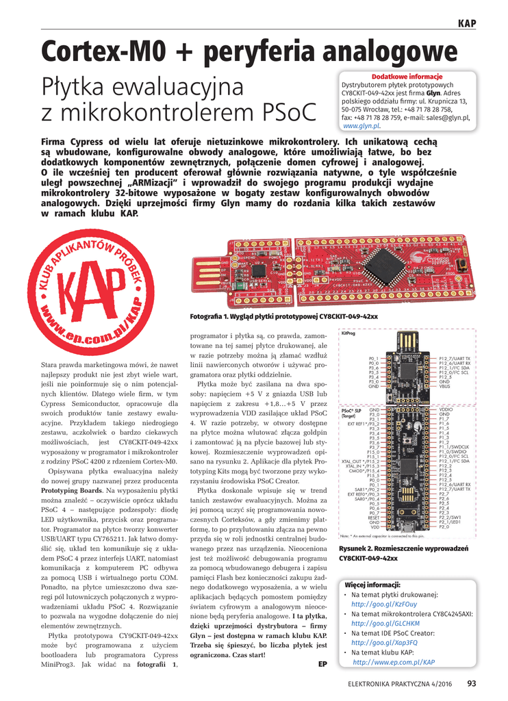 KAP Cortex-M0 + peryferia analogowe Płytka ewaluacyjna z mikrokontrolerem PSoC Dodatkowe informacje Dystrybutorem płytek prototypowych CY8CKIT-049-42xx jest firma Glyn. Adres polskiego oddziału firmy: ul. Krupnicza 13, 50-075 Wrocław, tel.: +48 71 78 28 758, fax: +48 71 78 28 759, e-mail: [email protected], www.glyn.pl. Firma Cypress od wielu lat oferuje nietuzinkowe mikrokontrolery. Ich unikatową cechą są wbudowane, konfigurowalne obwody analogowe, które umożliwiają łatwe, bo bez dodatkowych komponentów zewnętrznych, połączenie domen cyfrowej i analogowej. O ile wcześniej ten producent oferował głównie rozwiązania natywne, o tyle współcześnie uległ powszechnej „ARMizacji” i wprowadził do swojego programu produkcji wydajne mikrokontrolery 32-bitowe wyposażone w bogaty zestaw konfigurowalnych obwodów analogowych. Dzięki uprzejmości firmy Glyn mamy do rozdania kilka takich zestawów w ramach klubu KAP. Fotografia 1. Wygląd płytki prototypowej CY8CKIT-049-42xx Stara prawda marketingowa mówi, że nawet najlepszy produkt nie jest zbyt wiele wart, jeśli nie poinformuje się o nim potencjalnych klientów. Dlatego wiele firm, w tym Cypress Semiconductor, opracowuje dla swoich produktów tanie zestawy ewaluacyjne. Przykładem takiego niedrogiego zestawu, aczkolwiek o bardzo ciekawych możliwościach, jest CY8CKIT-049-42xx wyposażony w programator i mikrokontroler z rodziny PSoC 4200 z rdzeniem Cortex-M0. Opisywana płytka ewaluacyjna należy do nowej grupy nazwanej przez producenta Prototyping Boards. Na wyposażeniu płytki można znaleźć – oczywiście oprócz układu PSoC 4 – następujące podzespoły: diodę LED użytkownika, przycisk oraz programator. Programator na płytce tworzy konwerter USB/UART typu CY765211. Jak łatwo domyślić się, układ ten komunikuje się z układem PSoC 4 przez interfejs UART, natomiast komunikacja z komputerem PC odbywa za pomocą USB i wirtualnego portu COM. Ponadto, na płytce umieszczono dwa szeregi pól lutowniczych połączonych z wyprowadzeniami układu PSoC 4. Rozwiązanie to pozwala na wygodne dołączenie do niej elementów zewnętrznych. Płytka prototypowa CY9CKIT-049-42xx może być programowana z użyciem bootloadera lub programatora Cypress MiniProg3. Jak widać na fotografii 1, programator i płytka są, co prawda, zamontowane na tej samej płytce drukowanej, ale w razie potrzeby można ją złamać wzdłuż linii nawierconych otworów i używać programatora oraz płytki oddzielnie. Płytka może być zasilana na dwa sposoby: napięciem +5 V z gniazda USB lub napięciem z zakresu +1,8…+5 V przez wyprowadzenia VDD zasilające układ PSoC 4. W razie potrzeby, w otwory dostępne na płytce można wlutować złącza goldpin i zamontować ją na płycie bazowej lub stykowej. Rozmieszczenie wyprowadzeń opisano na rysunku 2. Aplikacje dla płytek Prototyping Kits mogą być tworzone przy wykorzystaniu środowiska PSoC Creator. Płytka doskonale wpisuje się w trend tanich zestawów ewaluacyjnych. Można za jej pomocą uczyć się programowania nowoczesnych Corteksów, a gdy zmienimy platformę, to po przylutowaniu złącza na pewno przyda się w roli jednostki centralnej budowanego przez nas urządzenia. Nieoceniona jest też możliwość debugowania programu za pomocą wbudowanego debugera i zapisu pamięci Flash bez konieczności zakupu żadnego dodatkowego wyposażenia, a w wielu aplikacjach będących pomostem pomiędzy światem cyfrowym a analogowym nieocenione będą peryferia analogowe. I ta płytka, dzięki uprzejmości dystrybutora – firmy Glyn – jest dostępna w ramach klubu KAP. Trzeba się śpieszyć, bo liczba płytek jest ograniczona. Czas start! EP Rysunek 2. Rozmieszczenie wyprowadzeń CY8CKIT-049-42xx Więcej informacji: • Na temat płytki drukowanej: http://goo.gl/KzFOuy • Na temat mikrokontrolera CY8C4245AXI: http://goo.gl/GLCHKM • Na temat IDE PSoC Creator: http://goo.gl/Xap3FQ • Na temat klubu KAP: http://www.ep.com.pl/KAP ELEKTRONIKA PRAKTYCZNA 4/2016 93