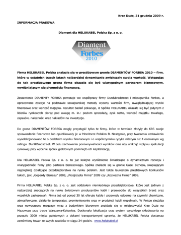 Krze DuŜe, 31 grudnia 2009 r. INFORMACJA PRASOWA Diament dla HELUKABEL Polska Sp. z o. o. Firma HELUKABEL Polska znalazła się w prestiŜowym gronie DIAMENTÓW FORBSA 2010 – firm, które w ostatnich trzech latach najbardziej dynamicznie zwiększały swoją wartość. Wstępując do tak prestiŜowego grona firma okazała się być wiarygodnym partnerem biznesowym, wyróŜniającym się płynnością finansową. Zestawienie DIAMENTY FORBSA powstaje we współpracy firmy Dun&Bradstreet i miesięcznika Forbes, a opracowane zostaje na podstawie szwajcarskiej metody wyceny wartości firm, uwzględniającej wyniki finansowe oraz wartość majątku. Rezultat badań pokazuje, iŜ Spółka HELUKABEL okazała się być jedynym z liderów rynkowych biorąc pod uwagę m. in.: poziom sprzedaŜy, zysk netto, wartość majątku trwałego, zapasów, naleŜności oraz nakładów na inwestycje. Do grona DIAMENTÓW FORBSA mogły przystąpić tylko te firmy, które w terminie złoŜyły do KRS swoje sprawozdanie finansowe lub opublikowały je w Monitorze Polskim B. Następnie, przy tworzeniu zestawienia wyselekcjonowano te o dodatnim wyniku finansowym i o współczynniku ryzyka niŜszym niŜ 4 ocenianym wg ratingu Dun&Bradstreet. W celu zachowania porównywalności wyników oraz aby uniknąć wpływu spekulacji rynkowej przy wycenie spółek giełdowych pominięto ich kapitalizację. Dla HELUKABEL Polska Sp. z o. o. to juŜ kolejne wyróŜnienie świadczące o dynamicznym rozwoju i wiarygodności firmy jako partnera biznesowego. Spółka znalazła się w gronie Gazel Biznesu, skupiającym najpręŜniej działające przedsiębiorstwa na rynku polskim. Jest takŜe laureatem prestiŜowych konkursów takich, jak: „Gepardy Biznesu” 2008, „Przejrzysta Firma” 2009 czy „RozwaŜna Firma” 2009. Firma HELUKABEL Polska Sp. z o. o. jest oddziałem niemieckiego przedsiębiorstwa, które jest jednym z najbardziej znaczących na rynku światowym producentów kabli i przewodów do wszystkich branŜ oraz wszelkich zastosowań. Firma juŜ od ponad 30 lat oferuje kable i przewody odporne na czynniki chemiczne, atmosferyczne, działanie temperatur, promieniowanie oraz w produkcji kabli niepalnych. W Polsce siedziba oraz nowoczesny magazyn wraz z budynkiem biurowym znajduje się w miejscowości Krze DuŜe na Mazowszu przy trasie Warszawa-Katowice. Doskonała lokalizacja oraz system wysokiego składowania na przeszło 3000 miejsc paletowych z dokami transportowymi sprawia, Ŝe HELUKABEL Polska dostarcza zamówiony towar ze swych zasobów w ciągu 24 godzin. www.helukabel.pl