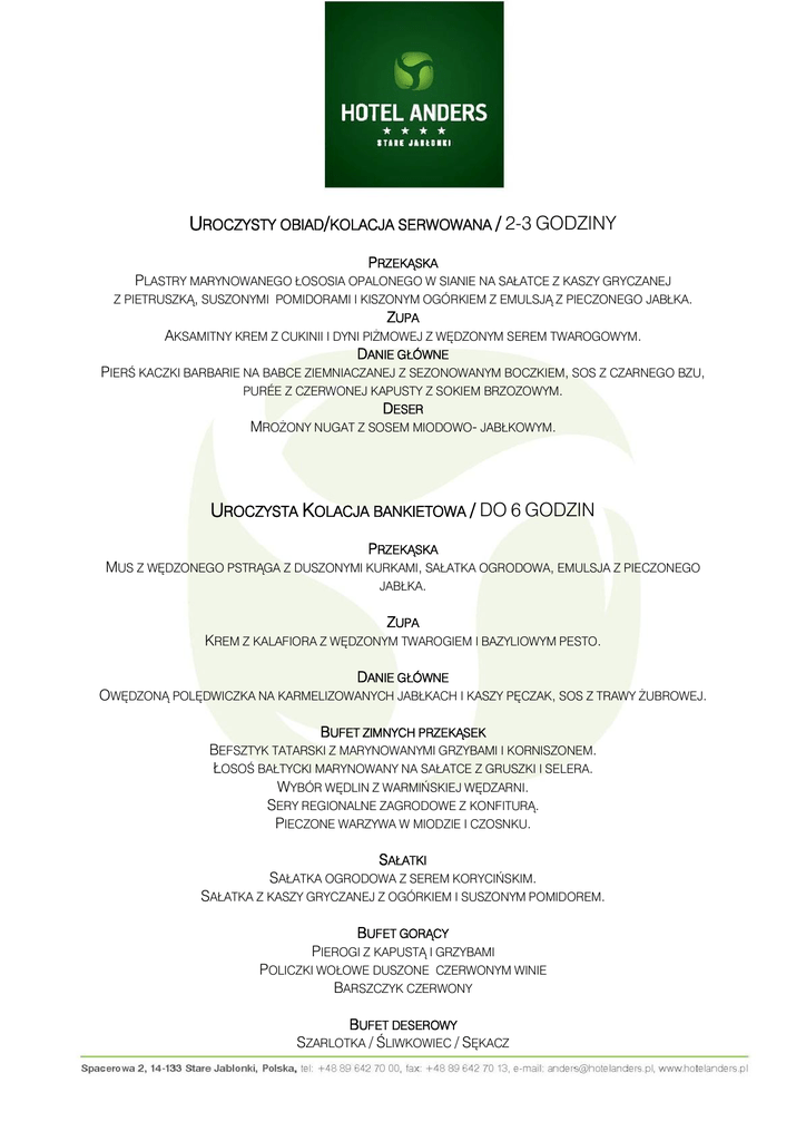 UROCZYSTY OBIAD/KOLACJA SERWOWANA / 2-3 GODZINY PRZEKĄSKA PLASTRY MARYNOWANEGO ŁOSOSIA OPALONEGO W SIANIE NA SAŁATCE Z KASZY GRYCZANEJ Z PIETRUSZKĄ, SUSZONYMI POMIDORAMI I KISZONYM OGÓRKIEM Z EMULSJĄ Z PIECZONEGO JABŁKA. ZUPA AKSAMITNY KREM Z CUKINII I DYNI PIŻMOWEJ Z WĘDZONYM SEREM TWAROGOWYM. DANIE GŁÓWNE PIERŚ KACZKI BARBARIE NA BABCE ZIEMNIACZANEJ Z SEZONOWANYM BOCZKIEM, SOS Z CZARNEGO BZU, PURÉE Z CZERWONEJ KAPUSTY Z SOKIEM BRZOZOWYM. DESER MROŻONY NUGAT Z SOSEM MIODOWO- JABŁKOWYM. UROCZYSTA KOLACJA BANKIETOWA / DO 6 GODZIN PRZEKĄSKA MUS Z WĘDZONEGO PSTRĄGA Z DUSZONYMI KURKAMI, SAŁATKA OGRODOWA, EMULSJA Z PIECZONEGO JABŁKA. ZUPA KREM Z KALAFIORA Z WĘDZONYM TWAROGIEM I BAZYLIOWYM PESTO. DANIE GŁÓWNE OWĘDZONĄ POLĘDWICZKA NA KARMELIZOWANYCH JABŁKACH I KASZY PĘCZAK, SOS Z TRAWY ŻUBROWEJ. BUFET ZIMNYCH PRZEKĄSEK BEFSZTYK TATARSKI Z MARYNOWANYMI GRZYBAMI I KORNISZONEM. ŁOSOŚ BAŁTYCKI MARYNOWANY NA SAŁATCE Z GRUSZKI I SELERA. WYBÓR WĘDLIN Z WARMIŃSKIEJ WĘDZARNI. SERY REGIONALNE ZAGRODOWE Z KONFITURĄ. PIECZONE WARZYWA W MIODZIE I CZOSNKU. SAŁATKI SAŁATKA OGRODOWA Z SEREM KORYCIŃSKIM. SAŁATKA Z KASZY GRYCZANEJ Z OGÓRKIEM I SUSZONYM POMIDOREM. BUFET GORĄCY PIEROGI Z KAPUSTĄ I GRZYBAMI POLICZKI WOŁOWE DUSZONE CZERWONYM WINIE BARSZCZYK CZERWONY BUFET DESEROWY SZARLOTKA / ŚLIWKOWIEC / SĘKACZ