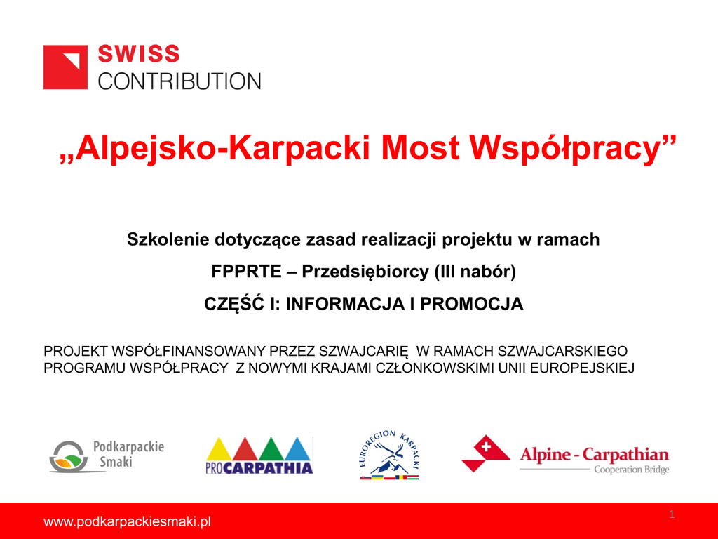„Alpejsko-Karpacki Most Współpracy” Szkolenie dotyczące zasad realizacji projektu w ramach FPPRTE – Przedsiębiorcy (III nabór) CZĘŚĆ I: INFORMACJA I PROMOCJA PROJEKT WSPÓŁFINANSOWANY PRZEZ SZWAJCARIĘ W RAMACH SZWAJCARSKIEGO PROGRAMU WSPÓŁPRACY Z NOWYMI KRAJAMI CZŁONKOWSKIMI UNII EUROPEJSKIEJ www.podkarpackiesmaki.pl 1 Cele działań informacyjnych i promocyjnych w ramach Szwajcarsko-Polskiego Programu Współpracy (SPPW): • informowanie opinii publicznej o SPPW, jego realizacji i wynikach, • informowanie potencjalnych Beneficjentów o Programie i zachęcanie ich do udziału, • motywowanie i wspieranie Beneficjentów w poprawnej i efektywnej realizacji projektów, • promowanie celów SPPW, tj. zmniejszania różnic społeczno-gospodarczych w UE i w Polsce, • promowanie, wspieranie i zachęcanie do dialogu i współpracy pomiędzy przedstawicielami sektora publicznego, prywatnego i pozarządowego, • zapewnienie przejrzystości, w szczególności w zakresie wyboru projektów, kontraktacji i zarządzania finansowego. www.podkarpackiesmaki.pl 2 Zobowiązania beneficjenta Beneficjent zobowiązany jest zadbać aby informacja o projekcie i sposobach jego finansowania dotarła zarówno do: a) otoczenia projektu, tj. społeczności lokalnej, sektora prywatnego, publicznego i pozarządowego, lokalnych mediów itd., b) odbiorców projektu, np. uczestników targów, warsztatów, szkoleń dofinansowanych w ramach projektu. • Działania informacyjne i promocyjne, podejmowane przez Beneficjentów, powinny zostać udokumentowane. W zależności od specyfiki projektu i działań podejmowanych w ramach projektu, dokumentacja taka może np. obejmować fotografie, zapisy audio i / lub video, wycinki prasowe, wydruki z wybranych stron internetowych itp., • Beneficjenci powinni przechowywać dokumentację działań informacyjnych i promocyjnych przez okres 10 lat po zakończeniu projektu. www.podkarpackiesmaki.pl 3 Działania informacyjne i promocyjne można realizować poprzez: • konferencje, imprezy promocyjne, imprezy skierowane do ogółu społeczności (np. targi), • kontakty z mediami, tj.: - konferencje prasowe, wywiady, - materiały prasowe, artykuły itp., - spoty reklamowe, filmy promocyjne, audycje radiowe i telewizyjne, • punkty informacyjne, • publikacje w formie elektronicznej i papierowej (foldery, ulotki, książki itp.), • strony internetowe, • warsztaty, • inne materiały promocyjne, itp. www.podkarpackiesmaki.pl 4 Informacja i promocja Działania informacyjno-promocyjne rozpoczynamy od dn. rozpoczęcia realizacji projektu (okres kwalifikowalności) zgodnie z podpisaną Umową o dofinansowanie projektu i trwają one przez cały okres jej obowiązywania. Zasady oznakowania projektów: I. Stosowanie systemu identyfikacji wizualnej, II. Umieszczanie informacji o współfinansowaniu w ramach Szwajcarsko-Polskiego Programu Współpracy (SPPW). www.podkarpackiesmaki.pl 5 Oznakowanie dokumentów Beneficjent zobowiązany jest do oznakowania dokumentów dotyczących realizacji projektu (system identyfikacji wizualnej oraz umieszczanie informacji o współfinansowaniu SPPW). Obowiązkowi oznakowania podlegają w szczególności następujące dokumenty: • • • • • korespondencja papierowa prowadzona w sprawie projektu, ogłoszenia dotyczące przetargów, dokumentacja przetargowa, umowy zawarte z wykonawcami, certyfikaty, świadectwa, dyplomy itp. Obowiązkowi oznakowania nie podlegają dokumenty finansowe i księgowe – faktury, rachunki (należy je opisać na odwrocie zgodnie z wzorem zamieszczonym na stronie www.podkarpackiesmaki.pl). www.podkarpackiesmaki.pl 6 System identyfikacji wizualnej (I) a) Logo Swiss Contribution Wszystkie materiały informacyjne i promocyjne muszą być opatrzone logotypem Swiss Contribution. Dotyczy: • materiałów drukowanych, • materiałów promocyjnych, • stron internetowych, ogłoszeń, reklam, • filmów promocyjnych, • prezentacji w programie PowerPoint, • tablic i tabliczek informacyjnych i naklejek, • plakatów, banerów, stanowisk wystawienniczych, itp. www.podkarpackiesmaki.pl 7 System identyfikacji wizualnej (II) Przy logotypie Swiss Contribution można umieścić:  logo beneficjenta,  partnera projektu,  symbole regionalne/narodowe itp. Materiały nie mogą jednak zawierać żadnych logotypów wykonawców prywatnych realizujących działania w ramach projektu. Księga identyfikacji wizualnej Szwajcarsko-Polskiego Programu Współpracy (Część 1 - Księga znaku Swiss Contribution) www.programszwajcarski.gov.pl lub www.podkarpackiesmaki.pl www.podkarpackiesmaki.pl 8 System identyfikacji wizualnej (II) b) Logo Bundeslogo Stosować - tylko za zgodą BPRTE Dotyczy tylko obowiązkowych i rekomendowanych wzorów materiałów promocyjnych, m.in.: • naklejek informacyjnych, • określonych typów materiałów promocyjnych (np. roll -up), • tablic i tabliczek informacyjnych. Księga identyfikacji wizualnej Szwajcarsko-Polskiego Programu Współpracy (Część 2 – Obowiązkowe i rekomendowane wzory materiałów promocyjnych) www.programszwajcarski.gov.pl lub www.podkarpackiesmaki.pl www.podkarpackiesmaki.pl 9 System identyfikacji wizualnej (IV) Wszystkie materiały promocyjne muszą zawierać: c) Logo Podkarpackie Smaki d) Logo Stowarzyszenia PRO CARPATHIA e) Logo Alpine-Carpathian www.podkarpackiesmaki.pl 10 System identyfikacji wizualnej (V) www.podkarpackiesmaki.pl 11 Reguły sąsiedztwa logotypów Moja firma/ partner projektu Projekt współfinansowany przez Szwajcarię w ramach szwajcarskiego programu współpracy z nowymi krajami członkowskimi Unii Europejskiej. www.podkarpackiesmaki.pl 12 Informacja o współfinansowaniu (I) Wersja polska: Projekt współfinansowany przez Szwajcarię w ramach szwajcarskiego programu współpracy z nowymi krajami członkowskimi Unii Europejskiej. Wersja angielska: Project supported by a grant from Switzerland through the Swiss Contribution to the enlar