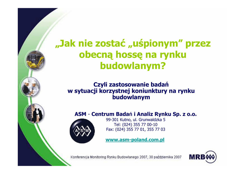 „Jak nie zostać „uśpionym” przez obecną hossę na rynku budowlanym? Czyli zastosowanie badań w sytuacji korzystnej koniunktury na rynku budowlanym ASM - Centrum Badań i Analiz Rynku Sp. z o.o. 99-301 Kutno, ul. Grunwaldzka 5 Tel: (024) 355 77 00-10 Fax: (024) 355 77 01, 355 77 03 www.asm-poland.com.pl PLAN PREZENTACJI 1. Pytanie podstawowe 2. MoŜliwości rysujące się na rynku badań dla budownictwa – dlaczego warto się badać? 3. MoŜliwości rysujące się na rynku badań – dlaczego trzeba się badać? 4. Dynamika badania się firm 5. Jakie korzyści płyną z realizacji badań – praktyczne zastosowania PODSTAWOWE PYTANIE „Jak nie zostać uśpionym przez obecną hossę?” „Dlaczego nie opłaca się być uśpionym przez obecną hossę na rynku materiałów budowlanych?” MOśLIWOŚCI RYSUJĄCE SIĘ NA RYNKU BADAŃ DLA BUDOWNICTWA – DLACZEGO WARTO SIĘ BADAĆ? Badania pobudzają nowe obszary gospodarki Badania pozwalają na rozwój nowych dziedzin W latach 2007 – 2013 dla przedsiębiorców stawiających na innowacyjność przewidziane jest ponad 8 mld Euro dofinansowania ze środków unijnych Dofinansowanie obejmie obszary: rozwoju nowych technologii (szczególnie przyjaznych środowisku) pozyskiwania nowej wiedzy zakup maszyn wpływających na komercjalizację wyników badań MOśLIWOŚCI RYSUJĄCE SIĘ NA RYNKU BADAŃ DLA BUDOWNICTWA – DLACZEGO TRZEBA SIĘ BADAĆ? Aby uzyskać przewagę konkurencyjną wskazane jest eksplorowanie nowych obszarów, kreowane nowych dziedzin Dzięki realizacji i wdraŜaniu wyników badań Zleceniodawca uzyskuje przewagę konkurencyjną na rynku Inwestowanie w obszarze budownictwa zazwyczaj wymaga planowania długoterminowego WdraŜanie i realizacja inwestycji wymaga powstania wcześniejszego (najlepiej) szczegółowego planu Analiza stanowi podstawę dla strategii finansowej przedsiębiorstwa Prognozowanie rynku staje się inwestycją w przyszłość i stabilność firmy Korzystanie z hossy nie równa się wiedzy o rynku DYNAMIKA BADANIA SIĘ FIRM W okresie 2002 – 2006 ile firm z branŜy budowlanej badało się raz i więcej niŜ raz. Źródło – opracowanie własne ASM na przykładzie realizacji badań na przestrzeni lat 2002 – 2006, w % 10 1 3 20 66 zakupiono 1 badanie zakupiono 2 badania zakupiono 4 badania zakupiono 5 badań zakupiono 3 badania DYNAMIKA BADANIA SIĘ FIRM C.D. Struktura finansowania badań w kolejnych latach w okresie 2002 – 2006 wśród firm z branŜy budowlanej, które badały się więcej niŜ raz. Źródło – opracowanie własne ASM na przykładzie realizacji badań na przestrzeni lat 2002 – 2006,w % Odsetek firm, które w kolejnych latach przeznaczyły na badanie większe fundusze, w % 43 57 przeznaczono większe fundusze w kolejnych latach przeznaczono mniejsze bądź równe fundusze w kolejnych latach PRAKTYCZNE ZASTOSOWANIA BADAŃ RYNKU BUDOWLANEGO Badania segmentacyjne Uzyskanie informacji o zwyczajach respondentów w zakresie korzystania z określonych produktów i usług Określenie postaw respondentów Uzyskanie dokładnego profilu respondentów MoŜliwości targetowania komunikatów na określonego w wyniku segmentacji odbiorcę Uzyskanie wskazówek podczas wprowadzania nowych produktów i usług na rynek Badania wizerunku, postrzegania i komunikacji Określenie silnych i słabych stron podmiotu i jego usług oraz produktów Określenie cech podmiotu postrzeganych najmocniej w danych grupach MoŜliwość aktywnego kształtowania i manipulowania wizerunkiem podmiotu MoŜliwość optymalnego dostosowania komunikatu do odbiorcy PRAKTYCZNE ZASTOSOWANIA BADAŃ RYNKU BUDOWLANEGO, C.D. Badania wielkości i struktury rynku Poznanie relacji zachodzących między graczami na rynku MoŜliwość dostosowywanie się do potrzeb rynku (za równo od strony podaŜy jak i popytu) MoŜliwość poszerzania zakresu działań Właściwa alokacja środków firmy Prognozy Perspektywiczna znajomość potrzeb rynku i jego dynamiki Reagowanie z wyprzedzeniem na zmiany na rynku MoŜliwość przygotowania optymalnej reakcji Budowa długofalowych strategii działania DZIĘKUJĘ ZA UWAGĘ Adam Derdzikowski Specjalistą ds. sprzedaŜy tel.: (24) 355 77 29, 0605 208 999 e-mail: [email protected] www.asm-poland.com.pl