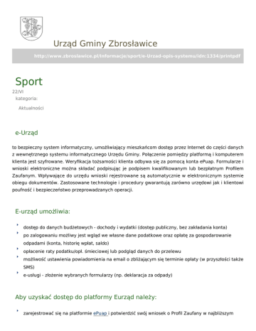 Urząd Gminy Zbrosławice http://www.zbroslawice.pl/Informacje/sport/e-Urzad-opis-systemu/idn:1334/printpdf Sport 22/VI kategoria: Aktualności e-Urząd to bezpieczny system informatyczny, umożliwiający mieszkańcom dostęp przez Internet do części danych z wewnętrznego systemu informatycznego Urzędu Gminy. Połączenie pomiędzy platformą i komputerem klienta jest szyfrowane. Weryfikacja tożsamości klienta odbywa się za pomocą konta ePuap. Formularze i wnioski elektroniczne można składać podpisując je podpisem kwalifikowanym lub bezpłatnym Profilem Zaufanym. Wpływające do urzędu wnioski rejestrowane są automatycznie w elektronicznym systemie obiegu dokumentów. Zastosowane technologie i procedury gwarantują zarówno urzędowi jak i klientowi poufność i bezpieczeństwo przeprowadzanych operacji. E-urząd umożliwia: dostęp do danych budżetowych - dochody i wydatki (dostęp publiczny, bez zakładania konta) po zalogowaniu możliwy jest wgląd we własne dane podatkowe oraz opłatę za gospodarowanie odpadami (konta, historię wpłat, saldo) opłacenie raty podatku/opł. śmieciowej lub podgląd danych do przelewu możliwość ustawienia powiadomienia na email o zbliżającym się terminie opłaty (w przyszłości także SMS) e-usługi - złożenie wybranych formularzy (np. deklaracja za odpady) Aby uzyskać dostęp do platformy Eurząd należy: zarejestrować się na platformie ePuap i potwierdzić swój wniosek o Profil Zaufany w najbliższym punkcie (np. w sekretariacie Urzędu Gminy, pok 6.) złożyć wniosek o dostęp do systemu informatycznego (Katalog usług -> Dostęp do systemu teleinformatycznego) poczekać na weryfikację danych, aktywację konta i zwrotną wiadomość z Urzędu Gminy przejdź do platformy e-Urząd Geneza powstania platformy eurząd: Gmina Zbrosławice, jako partner gmin Wielowieś, Świerklaniec oraz miast Tarnowskie Góry, Sosnowiec i Jaworzno (jako Lidera) przystąpiła do projektu „e-Urzędy – utworzenie zintegrowanego systemu wspomagania zarządzaniem w administracji publicznej wraz z zapewnieniem świadczenia usług drogą elektroniczną". 3 czerwca 2014 r. została podpisana umowa o dofinansowanie z Ministerstwem Administracji i Cyfryzacji, co było ostatnim etapem fazy starań o możliwość realizacji projektu w ramach Programu Operacyjnego Kapitał Ludzki. Projekt ten znacząco unowocześnił posiadane już systemy informatyczne oraz pozwolił na zwiększenie wydajności pracy urzędu, przez automatyzację części procesów, które wcześniej musiały być wykonywane ręcznie. Wdrożenie pozwoliło na uruchomienie e-usług dla mieszkańców: płatności masowe – każdy podatnik będzie posiadał swój, indywidualny numer konta bankowego po stronie urzędu, który będzie służył do rozliczeń. Operacje będą rozliczane automatycznie, podobnie jak realizowane są rozliczenia za energię elektryczną, czy telefony komórkowe. system informacji podatkowej - mieszkańcy, po utworzeniu konta w systemie, będą mogli sprawdzić wysokość podatku, opłat śmieciowych oraz mieć wgląd w historię operacji. system powiadamiania kontrahenta umożliwi elektroniczne informowanie o nadchodzącej racie podatku, opłacie śmieciowej oraz innych istotnych wydarzeniach z życia gminy. punkt potwierdzania Profilu Zaufanego ePuap – pozwoli na bezpłatne i szybkie potwierdzenie tożsamości mieszkańca w lokalnym urzędzie i założenie konta na platformie ePuap, dzięki czemu nie będzie konieczności zakupu płatnego podpisu kwalifikowanego. opracowanie formularzy na platformie ePuap umożliwi realizację wybranych usług bez fizycznej obecności petenta w urzędzie. Wystarczy jednorazowo potwierdzić tożsamość w punkcie potwierdzania profilu zaufanego, by resztę spraw załatwić przez Internet. Planowane jest uruchomienie ponad dwudziestu dedykowanych formularzy. Budżet projektu dla Gminy Zbrosławice wyniósł 189.693,81 zł i finansowany był z Europejskiego Funduszu Społecznego (85%) oraz ze środków Gminy Zbrosławice (15%). Z powyższych środków został zakupiony niezbędny sprzęt informatyczny, licencje na oprogramowanie oraz specjalistyczne szkolenia urzędników, mające na celu podwyższenie kompetencji i umiejętności w tematyce zastosowania e-usług. Projekt zakończono w październiku 2015 r. Maciej Połoński - koordynator projektu e-Urzędy Redagował: