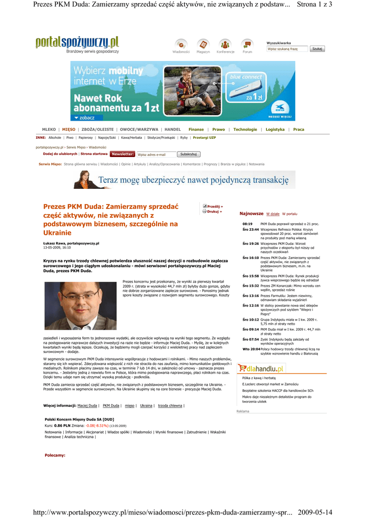 Prezes PKM Duda: Zamierzamy sprzedać część aktywów, nie związanych z podstaw... Strona 1 z 3 Wyszukiwarka Wpisz szukaną frazę MLEKO | MIĘSO | ZBOŻA/OLEISTE | OWOCE/WARZYWA | HANDEL Szukaj Finanse | Prawo | Technologie | Logistyka | Praca INNE: Alkohole | Piwo | Papierosy | Napoje/Soki | Kawa/Herbata | Słodycze/Przekąski | Ryby | Przetargi UZP portalspozywczy.pl › Serwis Mięso › Wiadomości Dodaj do ulubionych | Strona startowa Wpisz adres e-mail Subskrybuj Serwis Mięso: Strona główna serwisu | Wiadomości | Opinie | Artykuły | Analizy/Opracowania | Komentarze | Prognozy | Branża w pigułce | Notowania Prezes PKM Duda: Zamierzamy sprzedać część aktywów, nie związanych z podstawowym biznesem, szczególnie na Ukrainie Prześlij » Drukuj » Łukasz Rawa, portalspozywczy.pl 13-05-2009, 16:10 Najnowsze 08:19 W dziale W portalu PKM Duda poprawił sprzedaż o 21 proc. Śro 23:44 Wiceprezes Refresco Polska: Kryzys spowodował 20 proc. wzrost zamówień na produkty pod marką własną Śro 19:26 Wiceprezes PKM Duda: Wzrost przychodów z eksportu był niższy od naszych oczekiwań Kryzys na rynku trzody chlewnej potwierdza słuszność naszej decyzji o rozbudowie zaplecza surowcowego i jego ciągłym udoskonalaniu - mówi serwisowi portalspozywczy.pl Maciej Duda, prezes PKM Duda. Prezes koncernu jest przekonany, że wyniki za pierwszy kwartał 2009 r. (strata w wysokości 44,7 mln zł) byłyby dużo gorsze, gdyby nie dobrze zorganizowane zaplecze surowcowe. - Ponosimy jednak spore koszty związane z rozwojem segmentu surowcowego. Koszty Śro 16:10 Prezes PKM Duda: Zamierzamy sprzedać część aktywów, nie związanych z podstawowym biznesem, m.in. na Ukrainie Śro 15:58 Wiceprezes PKM Duda: Rynek produkcji żywca wieprzowego będzie się odradzał Śro 15:32 Prezes ZM Konarczak: Mimo wzrostu cen wędlin, sprzedaż rośnie Śro 13:16 Prezes Farmutilu: Jestem niewinny, odmawiam składania wyjaśnień Śro 12:16 W stolicy powstanie nowa sieć sklepów spożywczych pod szyldem "Wieprz i Pieprz" Śro 10:12 Grupa Indykpolu miała w I kw. 2009 r. 5,75 mln zł straty netto Śro 09:14 PKM Duda miał w I kw. 2009 r. 44,7 mln zł straty netto zasiedleń i wyposażenia ferm to jednorazowe wydatki, ale oczywiście wpływają na wyniki tego segmentu. Ze względu na postępowanie naprawcze dalszych inwestycji na razie nie będzie - informuje Maciej Duda. - Myślę, że w kolejnych kwartałach wyniki będą lepsze. Oczekuję, że będziemy mogli czerpać korzyści z wieloletniej pracy nad zapleczem surowcowym - dodaje. W segmencie surowcowym PKM Duda intensywnie współpracuje z hodowcami i rolnikami. - Mimo naszych problemów, staramy się ich wspierać. Zdecydowana większość z nich nie straciła do nas zaufania, mimo komunikatów giełdowych i medialnych. Rolnikom płacimy zawsze na czas, w terminie 7 lub 14 dni, w zależności od umowy - zaznacza prezes koncernu. - Jesteśmy jedną z niewielu firm w Polsce, która mimo postępowania naprawczego, płaci rolnikom na czas. Dzięki temu udaje nam się utrzymać wysoką produkcję - podkreśla. PKM Duda zamierza sprzedać część aktywów, nie związanych z podstawowym biznesem, szczególnie na Ukrainie. Przede wszystkim w segmencie surowcowym. Na Ukrainie skupimy się na core biznesie - precyzuje Maciej Duda. Śro 07:54 Zyski Indykpolu będą zależały od wyników operacyjnych Wto 20:04 Polscy hodowcy trzody chlewnej liczą na szybkie wznowienie handlu z Białorusią Półka z kawą i herbatą E.Leclerc otworzył market w Zamościu Bezpłatne szkolenia HACCP dla handlowców SCh Makro daje niezależnym detalistów program do tworzenia ulotek Więcej informacji: Maciej Duda | PKM Duda | mięso | Ukraina | trzoda chlewna | Reklama Polski Koncern Mięsny Duda SA [DUD] Kurs: 0.86 PLN Zmiana: -0.08(-8.51%) (13:05:2009) Notowania | Informacje | Akcjonariat | Władze spółki | Wiadomości | Wyniki finansowe | Zatrudnienie | Wskaźniki finansowe | Analiza techniczna | Polecamy: http://www.portalspozywczy.pl/mieso/wiadomosci/prezes-pkm-duda-zamierzamy-spr... 2009-05-14 Prezes PKM Duda: Zamierzamy sprzedać część aktywów, nie związanych z podstaw... Strona 2 z 3 Wiceprezes PKM Duda: Rynek produkcji żywca wieprzowego będzie się odradzał Firmy zabezpieczają ryzyko Enterprise Investors finansowe zainwestował w sieć restauracji W Warszawie powstaje sieć sklepów specjalistycznych Wieprz i Pieprz Zobacz także: PKM Duda poprawił sprzedaż o 21 proc. Najpopularniejsze (14-05-2009, 08:19) PKM Duda nie wyklucza udziału zewnętrznego inwestora w restrukturyzacji (13-05-2009, 23:53) Wiceprezes PKM Duda: Rynek produkcji żywca wieprzowego będzie się odradzał PKM Duda miał w I kw. 2009 r. 44,7 mln zł straty netto Zła pogoda obniży zbiory rzepaku na Ukrainie Provimi zamknie zakład produkcyjny w Brzesku i zwolni 130 pracowników (13-05-2009, 15:58) Wiceprezes PKM Duda: Wzrost przychodów z eksportu był niższy od naszych oczekiwań Prezes ZM Konarczak: Mimo wzrostu cen wędlin, sprzedaż rośnie PKM Duda sprzedaje Zakłady Mięsne Paruzel (13-05-2009, 19:26) Drosed blisko przejęcia zakładów Tarczyński (13-05-2009, 15:32) 200 mln zł mogłoby wyprowadzić PKM Duda na prostą (13-05-2009, 09:14) (12-05-2009, 12:38) Nowe przepisy dotyczące przywozu produktów zwierzęcych do UE W dziale W portalu Polomarket kupił od ZMM Mysław wędliny za ok. 17,3 mln zł (11-05-2009, 09:50) ZMM Mysław sprzedały sieci Tesco wędliny za ponad 6,3 mln zł Za granicą spada zainteresowanie wieprzowiną Dodaj komentarz: Pracownik ubojni w łódzkich Galewicach postrzelił kolegę z pistoletu do uboju bydła Treść komentarza: IJHARS: Aż 41 proc. wędlin jest źle oznakowanych Przedstawicielka Provimi: Sektor produkcji paszy nie odczuje skutków kryzysu Pogłowie świń najniższe od 40 lat Co dalej z pogłowiem trzody chlewnej w Polsce? Ostatnio na forum Podpis: Prezes PKM Duda: Zamierzamy sprzedać część aktywów, nie związanych z podstaw
