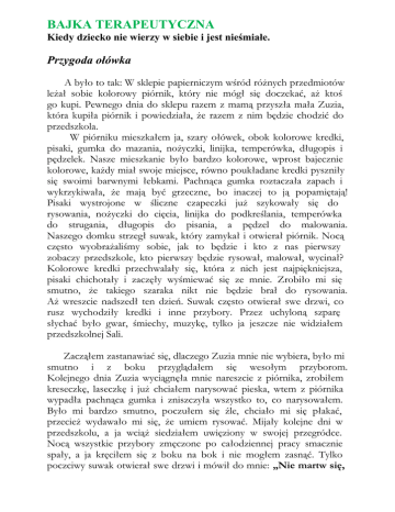 BAJKA TERAPEUTYCZNA Kiedy dziecko nie wierzy w siebie i jest nieśmiałe. Przygoda ołówka A było to tak: W sklepie papierniczym wśród różnych przedmiotów leżał sobie kolorowy piórnik, który nie mógł się doczekać, aż ktoś go kupi. Pewnego dnia do sklepu razem z mamą przyszła mała Zuzia, która kupiła piórnik i powiedziała, że razem z nim będzie chodzić do przedszkola. W piórniku mieszkałem ja, szary ołówek, obok kolorowe kredki, pisaki, gumka do mazania, nożyczki, linijka, temperówka, długopis i pędzelek. Nasze mieszkanie było bardzo kolorowe, wprost bajecznie kolorowe, każdy miał swoje miejsce, równo poukładane kredki pyszniły się swoimi barwnymi łebkami. Pachnąca gumka roztaczała zapach i wykrzykiwała, że mają być grzeczne, bo inaczej to ją popamiętają! Pisaki wystrojone w śliczne czapeczki już szykowały się do rysowania, nożyczki do cięcia, linijka do podkreślania, temperówka do strugania, długopis do pisania, a pędzel do malowania. Naszego domku strzegł suwak, który zamykał i otwierał piórnik. Nocą często wyobrażaliśmy sobie, jak to będzie i kto z nas pierwszy zobaczy przedszkole, kto pierwszy będzie rysował, malował, wycinał? Kolorowe kredki przechwalały się, która z nich jest najpiękniejsza, pisaki chichotały i zaczęły wyśmiewać się ze mnie. Zrobiło mi się smutno, że takiego szaraka nikt nie będzie brał do rysowania. Aż wreszcie nadszedł ten dzień. Suwak często otwierał swe drzwi, co rusz wychodziły kredki i inne przybory. Przez uchyloną szparę słychać było gwar, śmiechy, muzykę, tylko ja jeszcze nie widziałem przedszkolnej Sali. Zacząłem zastanawiać się, dlaczego Zuzia mnie nie wybiera, było mi smutno i z boku przyglądałem się wesołym przyborom. Kolejnego dnia Zuzia wyciągnęła mnie nareszcie z piórnika, zrobiłem kreseczkę, laseczkę i już chciałem narysować pieska, wtem z piórnika wypadła pachnąca gumka i zniszczyła wszystko to, co narysowałem. Było mi bardzo smutno, poczułem się źle, chciało mi się płakać, przecież wydawało mi się, że umiem rysować. Mijały kolejne dni w przedszkolu, a ja wciąż siedziałem uwięziony w swojej przegródce. Nocą wszystkie przybory zmęczone po całodziennej pracy smacznie spały, a ja kręciłem się z boku na bok i nie mogłem zasnąć. Tylko poczciwy suwak otwierał swe drzwi i mówił do mnie: „Nie martw się, będzie dobrze, przyjdzie czas, że będziesz najważniejszy dla Zuzi, na pewno…” I tak się stało. Nazajutrz w przedszkolu pani powiedziała do dzieci: „Dzisiaj potrzebne wam będą tylko ołówki, będziemy rysować szlaczki.” Gdy Zuzia wzięła mnie do ręki, byłem tak roztrzęsiony, że aż się złamałem. Wtedy to suwak szybko się rozsunął i wypchnął temperówkę, która w mig mnie zaostrzyła. I już roztańczyłem się na kartce – kółeczka, kreseczki, laseczki to moja specjalność. I nie tylko, bo odtąd Zuzia nie mogła się obejść bez mojej pomocy. Rysowaliśmy portrety wszystkich członków rodziny Zuzi, szarugi jesiennego deszczu, a nawet kopalnię. Było wspaniale. Teraz już wiem, że jestem ważny, a nawet niezbędny. Jestem po prostu szczęściarzem!