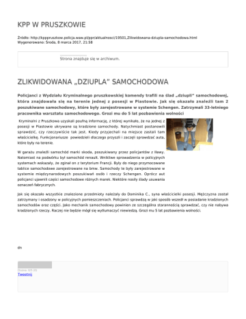 KPP W PRUSZKOWIE Źródło: http://kpppruszkow.policja.waw.pl/ppr/aktualnosci/19501,Zlikwidowana-dziupla-samochodowa.html Wygenerowano: Środa, 8 marca 2017, 21:58 Strona znajduje się w archiwum. ZLIKWIDOWANA „DZIUPLA” SAMOCHODOWA Policjanci z Wydziału Kryminalnego pruszkowskiej komendy trafili na ślad „dziupli” samochodowej, która znajdowała się na terenie jednej z posesji w Piastowie. Jak się okazało znaleźli tam 2 poszukiwane samochodowy, które były zarejestrowane w systemie Schengen. Zatrzymali 33-letniego pracownika warsztatu samochodowego. Grozi mu do 5 lat pozbawienia wolności Kryminalni z Pruszkowa uzyskali poufną informację, z której wynikało, że na jednej z posesji w Piastowie ukrywane są kradzione samochody. Natychmiast postanowili sprawdzić, czy rzeczywiście tak jest. Kiedy przyjechali na miejsce zastali tam właścicielkę. Funkcjonariusze powiedzieli dlaczego przyszli i zaczęli sprawdzać auta, które były na terenie. W garażu znaleźli samochód marki skoda, poszukiwany przez policjantów z Iławy. Natomiast na podwórku był samochód renault. Wnikliwe sprowadzenia w policyjnych systemach wskazały, że zginał on z terytorium Francji. Były do niego przymocowane tablice samochodowe zarejestrowane na bmw. Samochody te były zarejestrowane w systemie międzynarodowych poszukiwań osób i rzeczy Schengen. Oprócz aut policjanci ujawnili części samochodowe różnych marek. Niektóre nosiły ślady usuwania oznaczeń fabrycznych. Jak się okazało wszystkie znalezione przedmioty należały do Dominika C., syna właścicielki posesji. Mężczyzna został zatrzymany i osadzony w policyjnych pomieszczeniach. Policjanci sprawdzą w jaki sposób wszedł w posiadanie kradzionych samochodów oraz części. Jako mechanik samochodowy powinien ze szczególna starannością sprawdzać, czy nie nabywa kradzionych rzeczy. Raczej nie będzie mógł się wytłumaczyć niewiedzą. Grozi mu 5 lat pozbawienia wolności. dn Ocena: 0/5 (0) Tweetnij