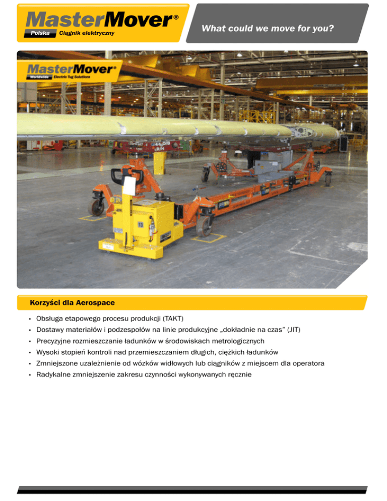 Polska Ciągnik elektryczny What could we move for you? Korzyści dla Aerospace Obsługa etapowego procesu produkcji (TAKT) Dostawy materiałów i podzespołów na linie produkcyjne „dokładnie na czas” (JIT) Precyzyjne rozmieszczanie ładunków w środowiskach metrologicznych Wysoki stopień kontroli nad przemieszczaniem długich, ciężkich ładunków Zmniejszone uzależnienie od wózków widłowych lub ciągników z miejscem dla operatora Radykalne zmniejszenie zakresu czynności wykonywanych ręcznie Industrial Electric Tugs | Aerospace Industry Od ponad 10 lat MasterMover współpracuje z czołowymi producentami z branży lotniczej. Gdy trzeba przewieźć całe skrzydło przez kolejne etapy produkcji lub ustawić kadłub myśliwca w komorze lakierniczej, nasze ciągniki elektryczne zapewniają kontrolę i zwrotność, jakiej wymaga praca w branży lotniczej. Gulfstream GE Caledonian BAE Systems Airbus EADS Astrium Co można przemieścić? Machine: MT5/400 Business Type: Produkcyjno-montażowej Machine: MT20/960 Business Type: Aerospace Machine: SM100+ Business Type: Contact Us To arrange a demonstration, or for further information about our electric tug material handling solutions, please contact us TRANSTECHNIK POLSKA Sprzedaży Telefonicznej: (+48) 516 193 828 ul. Cechowa 51 Faks: (+48) 12 35 05 825 30-614 Kraków Email: [email protected] Web: www.transtechnik.pl Sales and Service area: Poland
