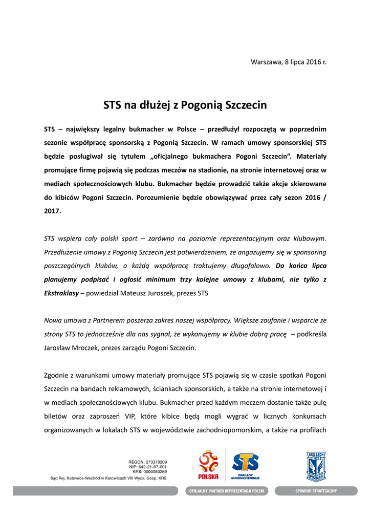Warszawa, 8 lipca 2016 r. STS na dłużej z Pogonią Szczecin STS – największy legalny bukmacher w Polsce – przedłużył rozpoczętą w poprzednim sezonie współpracę sponsorską z Pogonią Szczecin. W ramach umowy sponsorskiej STS będzie posługiwał się tytułem „oficjalnego bukmachera Pogoni Szczecin”. Materiały promujące firmę pojawią się podczas meczów na stadionie, na stronie internetowej oraz w mediach społecznościowych klubu. Bukmacher będzie prowadzić także akcje skierowane do kibiców Pogoni Szczecin. Porozumienie będzie obowiązywać przez cały sezon 2016 / 2017. STS wspiera cały polski sport – zarówno na poziomie reprezentacyjnym oraz klubowym. Przedłużenie umowy z Pogonią Szczecin jest potwierdzeniem, że angażujemy się w sponsoring poszczególnych klubów, a każdą współpracę traktujemy długofalowo. Do końca lipca planujemy podpisać i ogłosić minimum trzy kolejne umowy z klubami, nie tylko z Ekstraklasy – powiedział Mateusz Juroszek, prezes STS Nowa umowa z Partnerem poszerza zakres naszej współpracy. Większe zaufanie i wsparcie ze strony STS to jednocześnie dla nas sygnał, że wykonujemy w klubie dobrą pracę – podkreśla Jarosław Mroczek, prezes zarządu Pogoni Szczecin. Zgodnie z warunkami umowy materiały promujące STS pojawią się w czasie spotkań Pogoni Szczecin na bandach reklamowych, ściankach sponsorskich, a także na stronie internetowej i w mediach społecznościowych klubu. Bukmacher przed każdym meczem dostanie także pulę biletów oraz zaproszeń VIP, które kibice będą mogli wygrać w licznych konkursach organizowanych w lokalach STS w województwie zachodniopomorskim, a także na profilach firmy oraz klubu w mediach społecznościowych. STS przy okazji wybranych meczów w Szczecinie zorganizuje również specjalną strefę kibica wyposażoną w urządzenia zręcznościowe, w tym m.in. bramkę celnościową, piłkarzyki czy konsole do gier. Fani będą mogli wziąć udział w konkursach i zabawach, które przeprowadzi tam bukmacher. Prowadząc aktywacje sponsorskie, zawsze pamiętamy o kibicach, którzy są najważniejszą częścią świata sportu. Nasza współpraca z klubami nie ogranicza się do ekspozycji logotypu na materiałach reklamowych. STS jest zaangażowanym sponsorem - rozdajemy bilety na mecze, organizujemy strefę kibica, prowadzimy konkursy dla fanów – dodaje Juroszek. Więcej informacji: Paweł Rabantek Doradca zarządu ds. PR (+48) 603 870 044 [email protected]