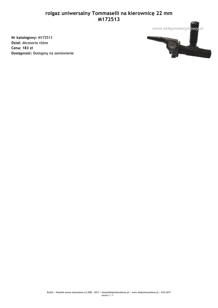rolgaz uniwersalny Tommaselli na kierownicę 22 mm M172513 Nr katalogowy: M172513 Dział: Akcesoria różne Cena: 183 zł Dostępność: Dostępny na zamówienie KLASA :: Wszelkie prawa zastrzeżone (c) 2002 - 2017 :: [email protected] :: www.sklepmotocyklowy.pl :: 8.03.2017 strona 1 / 1