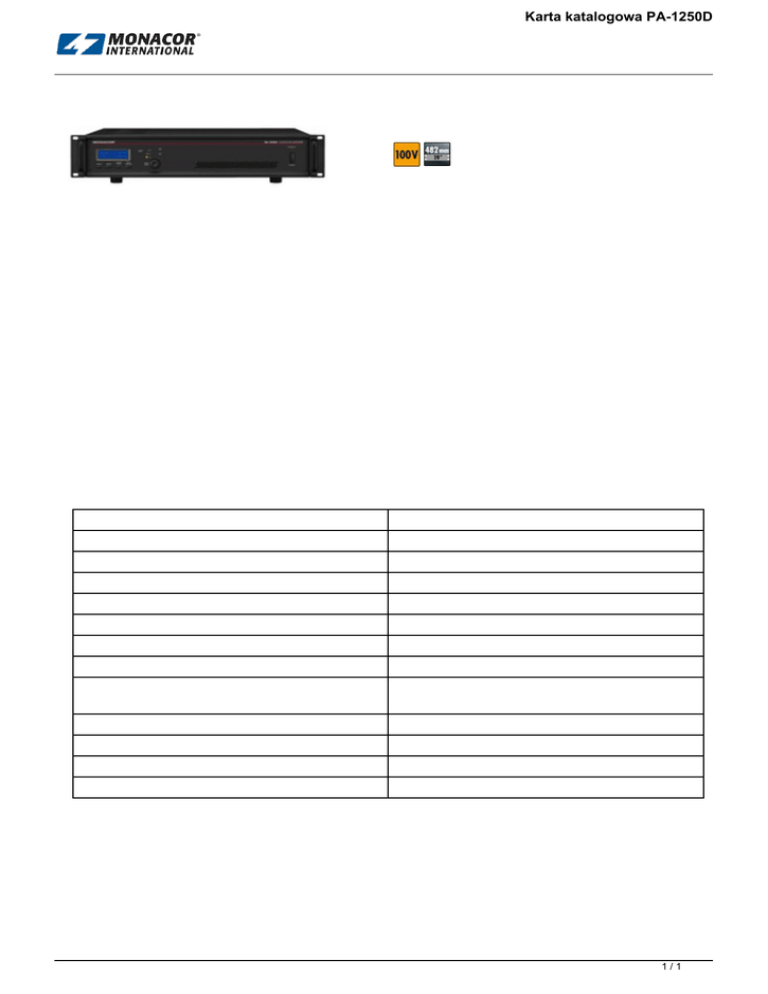 Karta katalogowa PA-1250D PA-1250D, Wzmacniacz cyfrowy PA, mono Opis Cyfrowy wzmacniacz PAWzmacniacz PA-1250D reprezentuje nową generację urządzeń, charakteryzujących się dużymi zdolnościami mocowymi przy niskich kosztach użytkowania oraz dłuższą żywotnością. W porównaniu z analogowymi wzmacniaczami 100V o efektywności na poziomie 70%, osiąga wartość powyżej 90%. Ponadto, dzięki małej emisji ciepła, praktycznie nie wymaga chłodzenia.Wzmacniacz cyfrowy PA, mono, energooszczędny.1 x 250WRMSKlasa D o wysokiej efektywności (redukcja kosztów zasilania o 90%)Funkcja oszczędzania energii: automatyczne przechodzenie w tryb standby w przypadku braku sygnału na wejściu (ponowne włączenie po pojawieniu się sygnału)Wymaga mniejszych pojemności akumulatorów do zasilania awaryjnego niż analogowe wzmacniacze 100VObniżone wymaganie chłodzenia dzięki małej emisji ciepłaCicha praca dzięki chłodzeniu bez wentylatora; idealne rozwiązanie dla biur, sal konferencyjnych, kościołów Specjalne obwody zabezpieczające przed zwarciem, spadkiem napięcia i przegrzaniemRozbudowane menu sterujące, wyświetlacz LCD Port RS-485 do zdalnego sterowaniaWłączany filtr górnoprzepustowy 200Hz, 6dB/okt.Dodatkowe wejście priorytetuZasilanie sieciowe lub awaryjne 24V Parametry techniczne Moc wyjściowa 250WRMS, 350WMAX Czułość wejściowa 1.2V, sym. (linia) Impedancja wyjściowa 100V/40Ω Pasmo przenoszenia 50-18 000Hz, ±3dB Stosunek S/N > 100dB, ważony A THD < 0.5% Filtr górnoprzepustowy 200Hz, 6dB/okt. Dopuszcz. temp. otoczenia 0-40 °C Zasilanie 230V˜/50Hz/350VA,8W (standby),24V prąd stały /20A,280mA (standby) Wymiary 482x88x410mm, 2U Waga 7.5kg Wejście sygnału terminale śrubowe Wyjścia głośnikowe terminale śrubowe 1/1 Powered by TCPDF (www.tcpdf.org)