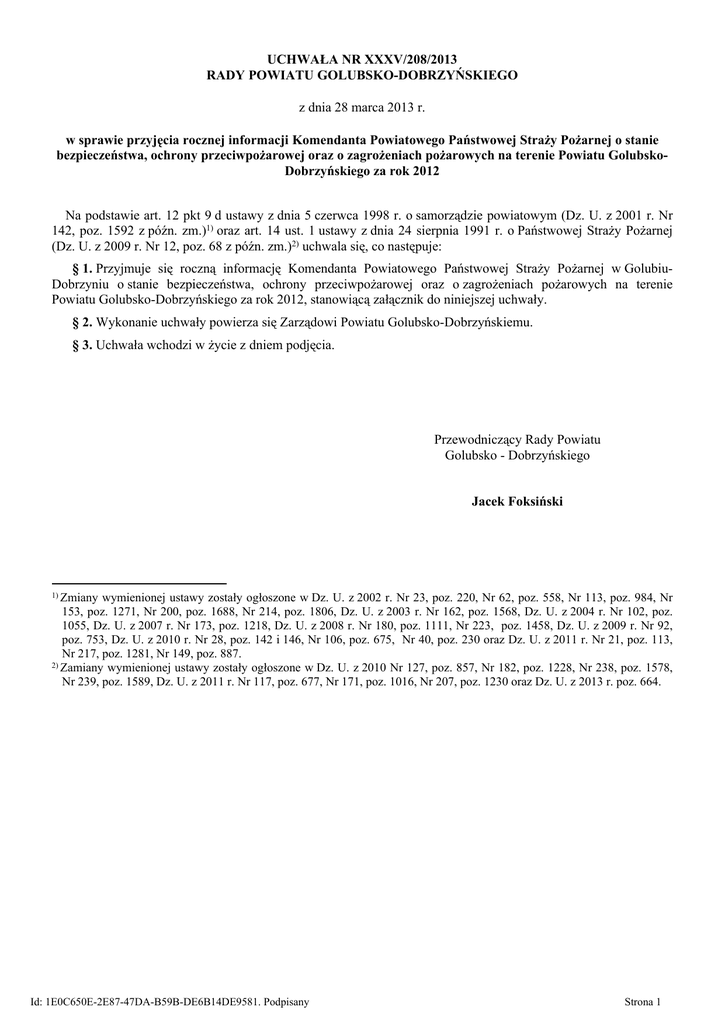 UCHWAŁA NR XXXV/208/2013 RADY POWIATU GOLUBSKO-DOBRZYŃSKIEGO z dnia 28 marca 2013 r. w sprawie przyjęcia rocznej informacji Komendanta Powiatowego Państwowej Straży Pożarnej o stanie bezpieczeństwa, ochrony przeciwpożarowej oraz o zagrożeniach pożarowych na terenie Powiatu GolubskoDobrzyńskiego za rok 2012 Na podstawie art. 12 pkt 9 d ustawy z dnia 5 czerwca 1998 r. o samorządzie powiatowym (Dz. U. z 2001 r. Nr 142, poz. 1592 z późn. zm.)1) oraz art. 14 ust. 1 ustawy z dnia 24 sierpnia 1991 r. o Państwowej Straży Pożarnej (Dz. U. z 2009 r. Nr 12, poz. 68 z późn. zm.)2) uchwala się, co następuje: § 1. Przyjmuje się roczną informację Komendanta Powiatowego Państwowej Straży Pożarnej w GolubiuDobrzyniu o stanie bezpieczeństwa, ochrony przeciwpożarowej oraz o zagrożeniach pożarowych na terenie Powiatu Golubsko-Dobrzyńskiego za rok 2012, stanowiącą załącznik do niniejszej uchwały. § 2. Wykonanie uchwały powierza się Zarządowi Powiatu Golubsko-Dobrzyńskiemu. § 3. Uchwała wchodzi w życie z dniem podjęcia. Przewodniczący Rady Powiatu Golubsko - Dobrzyńskiego Jacek Foksiński 1) Zmiany wymienionej ustawy zostały ogłoszone w Dz. U. z 2002 r. Nr 23, poz. 220, Nr 62, poz. 558, Nr 113, poz. 984, Nr 153, poz. 1271, Nr 200, poz. 1688, Nr 214, poz. 1806, Dz. U. z 2003 r. Nr 162, poz. 1568, Dz. U. z 2004 r. Nr 102, poz. 1055, Dz. U. z 2007 r. Nr 173, poz. 1218, Dz. U. z 2008 r. Nr 180, poz. 1111, Nr 223, poz. 1458, Dz. U. z 2009 r. Nr 92, poz. 753, Dz. U. z 2010 r. Nr 28, poz. 142 i 146, Nr 106, poz. 675, Nr 40, poz. 230 oraz Dz. U. z 2011 r. Nr 21, poz. 113, Nr 217, poz. 1281, Nr 149, poz. 887. 2) Zamiany wymienionej ustawy zostały ogłoszone w Dz. U. z 2010 Nr 127, poz. 857, Nr 182, poz. 1228, Nr 238, poz. 1578, Nr 239, poz. 1589, Dz. U. z 2011 r. Nr 117, poz. 677, Nr 171, poz. 1016, Nr 207, poz. 1230 oraz Dz. U. z 2013 r. poz. 664. Id: 1E0C650E-2E87-47DA-B59B-DE6B14DE9581. Podpisany Strona 1 Załącznik do uchwały Nr XXXV/208/2013 Rady Powiatu Golubsko – Dobrzyńskiego z dnia 28 marca 2013 r. KOMENDA POWIATOWA PAŃSTWOWEJ STRAŻY POŻARNEJ W GOLUBIU – DOBRZYNIU Analiza Sytuacji pożarowej oraz wskaźników operacyjnych prowadzonych działań ratowniczo-gaśniczych w roku 2012 na terenie powiatu golubsko-dobrzyńskiego Golub-Dobrzyń, styczeń 2013 rok Id: 1E0C650E-2E87-47DA-B59B-DE6B14DE9581. Podpisany Strona 2 ANALIZA SYTUACJI POŻAROWEJ ORAZ WSKAŹNIKÓW OPERACYJNYCH PROWADZONYCH DZIAŁAŃ RATOWNICZO-GAŚNICZYCH W 2012 ROKU NA TERENIE POWIATU GOLUBSKO-DOBRZYŃSKIEGO. Na terenie naszego działania posiadamy jedną Jednostkę Ratowniczo-Gaśniczą, która posiada 2 samochody gaśnicze (średni i ciężki), 1 samochód lekki ratownictwa technicznego, samochód specjalny kontenerowy wraz z czterema kontenerami do zwalczania zagrożeń ekologicznych, samochód podnośnik hydrauliczny, 1 samochód rozpoznawczo ratowniczy o napędzie terenowym „Nissan”, 1 samochód kontrolno rozpoznawczy „Kia”, 1 samochód operacyjny „Renault Megane” oraz 1 samochód kwatermistrzowski „VW T4”. Ogólna liczba jednostek Ochotniczych Straży Pożarnych to, 49 z czego 8 jest włączonych do Krajowego Systemu Ratowniczo Gaśniczego, 25 to jednostki typu „S” (wyposażone w pojazdy pożarnicze) i 16 typu „M” (nie posiadające samochodów pożarniczych). Jednostki OSP w KSRG posiadają 1 samochód ciężki gaśniczy, 9 samochodów średnich gaśniczych i 5 lekkich. W pozostałych jednostkach OSP niewłączonych do KSRG jest 1 samochód ciężki gaśniczy, 3 samochody średnie gaśnicze i 21lekkich. Postęp cywilizacyjny przejawiający się dynamicznym rozwojem poszczególnych dziedzin techniki, a głównie komunikacji, energetyki, budownictwa, powoduje pojawienie się i narastanie wraz z jego rozwojem zagrożeń dla ludzi, mienia i środowiska. Grupę wymienionych zagrożeń należy rozszerzyć o zagrożenia wywołane siłami natury, zjawiskami przyrodniczymi takimi jak: długotrwałe opady, nagłe roztopy i wywołane nimi powodzie, zalania, długotrwałe susze i powstające wówczas pożary, huragany, śnieżyce i wyładowania atmosferyczne. Jak realne i rzeczywiste są to zagrożenia obrazują coroczne statystyki z prowadzonych działań przez zastępy Państwowej Straży Pożarnej i Ochotniczej Straży Pożarnej. Id: 1E0C650E-2E87-47DA-B59B-DE6B14DE9581. Podpisany Strona 3 W 2012 roku na terenie powiatu zastępy Straży Pożarnej wyjeżdżały 684 razy do różnego rodzaju zdarzeń, z czego 156 zdarzeń to pożary, 516 to miejscowe zagrożenia i 12 alarmy fałszywe. Ilościowy wskaźnik zdarzeń za 2012 rok w porównaniu z rokiem 2011 i 2010 przedstawia się następująco: 795 900 800 700 719 684 631 580 516 600 500 ogółem zdarzeń 400 300 121 146 200 18 100 miejscowe zagrożenia pożary 156 18 12 alarmy fałszywe 0 2010 2011 2012 Tabela nr 1. Porównanie ilości zdarzeń w rozbiciu na poszczególne gminy w latach 2010, 2011 i 2012 Lp. 1 2 3 4 5 6 Gmina m. Golub Dobrzyń gm.GolubDobrzyń gm. Zbójno gm. Ciechocin gm.Kowalewo Pom. gm. Radomin Razem Ilość zdarzeń ogółem Porównanie roku 2011 do 2012 + wzrost % - spadek -12 -5,28 rok 2010 237 rok 2011 227 rok 2012 215 179 193 170 -23 -11,91 43 82 121 65 82 139 59 37 143 -14 -45 +4 -9,23 -54,87 +2,87 57 719 89 795 60 684 -29 -111 -32,58 -13,96 Dane z tabeli nr 1 pokazują, że mamy do czynienia ze spadkiem ogólnej ilości zdarzeń odnotowanych na terenie powiatu w porównaniu do roku 2011 o 13,96%. Największy spadek interwencji zanotowano na terenie gminy Ciechocin o 54,87%, natomiast wzrost zdarzeń o 2,87% odnotowano na terenie gminy Kowalewo Pomorskie. Id: 1E0C650E-2E87-47DA-B59B-DE6B14DE9581. Podpisany Strona 4 Na wykresie przedstawiono ilość zdarzeń przypadających na poszczególne gminy powiatu w roku 2012: 7% 23% 32% 7% 7% 24% m. Golub-Dobrzyń gm.Golub-Dobrzyń gm. Zbójno gm.Ciechocin gm.Kowaleo.Pom gm.Radomin 1) Ilościowy wskaźnik pożarów za lata 2010, 2011 i 2012 przedstawia 