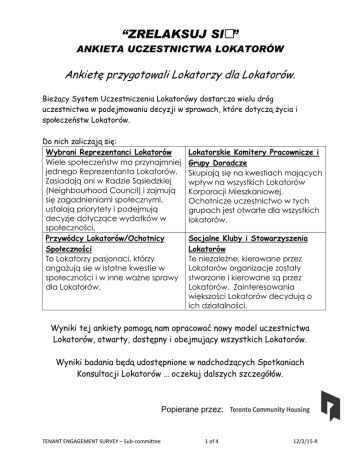 “ZRELAKSUJ SIĘ” ANKIETA UCZESTNICTWA LOKATORÓW Ankietę przygotowali Lokatorzy dla Lokatorów. Bieżący System Uczestniczenia Lokatorówy dostarcza wielu dróg uczestnictwa w podejmowaniu decyzji w sprawach, które dotyczą życia i społeczeństw Lokatorów. Do nich zaliczają się: Wybrani Reprezentanci Lokatorów Wiele społeczeństw ma przynajmniej jednego Reprezentanta Lokatorów. Zasiadają oni w Radzie Sąsiedzkiej (Neighbourhood Council) i zajmują się zagadnieniami społecznymi, ustalają priorytety i podejmują decyzje dotyczące wydatków w społeczności. Przywódcy Lokatorów/Ochotnicy Społeczności To Lokatorzy pasjonaci, którzy angażują się w istotne kwestie w społeczności i w inne ważne sprawy dla Lokatorów. Lokatorskie Komitery Pracownicze i Grupy Doradcze Skupiają się na kwestiach mających wpływ na wszystkich Lokatorów Korporacji Mieszkaniowej. Ochotnicze uczestnictwo w tych grupach jest otwarte dla wszystkich lokatorów. Socjalne Kluby i Stowarzyszenia Lokatorów Te niezależne, kierowane przez Lokatorów organizacje zostały stworzone i kierowane są przez Lokatorów. Zainteresowania większości Lokatorów decydują o ich działalności. Wyniki tej ankiety pomogą nam opracować nowy model uczestnictwa Lokatorów, otwarty, dostępny i obejmujący wszystkich Lokatorów. Wyniki badania będą udostępnione w nadchodzących Spotkaniach Konsultacji Lokatorów … oczekuj dalszych szczegółów. Popierane przez: TENANT ENGAGEMENT SURVEY – Sub-committee 1 of 4 12/2/15-R ANKIETA UCZESTNICTWA LOKATORÓW „ZRELAKSUJ SIĘ” 1. Czy znany ci jest obecny System Uczestnictwa Lokatorów Korporacji Mieszkaniowej Toronto? Tak Nie (zapraszamy do pytania #5) 2. Co twoim zdaniem działa dobrze? 3. Jak można ulepszyć istniejący System Uczestnictwa Lokatorów? 4. Czy bieżesz udział w działalności społeczeństwa? Tak Nie Jeśli odpowiedziałeś ‘nie’, prosimy powiedzieć nam co uniemożliwia ci uczestniczenie w życiu twojej społeczności? (zaznacz tyle, ile chcesz) Bariera Językowa Różnice Kulturowe Brak pomieszczeń dla społeczności Pomieszczenia dla społeczności są zamknięte Brak funduszy Brak wsparcia ze strony pracowników Brak czasu Brak informacji Brak zainteresowania Inne, prosimy wyjaśnić: TENANT ENGAGEMENT SURVEY – Sub-committee 2 of 4 12/2/15-R 5. Czy masz możliwość dzielenia się swoimi pomysłami na temat spraw, które ważne są dla ciebie w twojej społeczności TCHC? Tak 6. Nie (Jeśli “nie”, prosimy o wyjaśnienie) Czy znane ci są jakiekolwiek programy w twojej społeczności TCHC? Tak Nie 7. Jakie programy interesowałyby cię najbardziej? 8. Co twoim zdaniem byłoby najlepsze dla twojej społeczności TCHC? (zaznacz tyle, ile chcesz) Reprentanci Lokatorów (wybieranie Reprezentantów Lokatorów z każdej społeczności i tworzenie Rad Sąsiedzkich by reprezentowały wszystkich lokatorów) Przywódcy Lokatorów/Ochotnicy Społeczności (ogrodnictwo, itp.) Połączenie różnych modeli Stowarzyszenie Lokatorów (tworzenie niezależnego stowarzyszenia Lokatorów aby zaangażować Lokatorów w obrębie miejscowej społeczności/ budynku Klub towarzyski (działalność kierowana przez Lokatorów) Nie wiem Inne, prosimy wyjaśnić: TENANT ENGAGEMENT SURVEY – Sub-committee 3 of 4 12/2/15-R 9. Czy chciałbyś się bardziej zaangażować w twoją społeczność TCHC? Tak I0. Nie (zapraszamy do pytania #11) Jeśli “tak”, prosimy powiedzieć jak chciałbyś bardziej zaangażować się w twoją społeczność TCHC (zaznacz tyle, ile chcesz): Lokalne, kierowane przez Lokatorów, grupy społeczności (przykłady: klub śniadania, klub towarzyski, grupa ogrodnicza, grupa ćwiczących Wieczór gry (przykłady: karty, bingo, szachy, domino, itp. Grupy specjalnego zainteresowania Organizowanie zajęć Wydarzenia w społeczności (przykłady: kolacja typu „cośkolwiek do jedzenia” (pot luck), podwieczorek Branie udziału w wydarzeniach Inne, prosimy wyjaśnić: 11. Dodatkowe komentarze, coś innego, co chciałbyś nam powiedzieć? Cenimy sobie czas, jaki poĘwiĘciłeĘ, aby nam pomóc z naszĘ AnkietĘUczestnictwa Lokatorów „Zrelaksuj siĘ”! Wyniki ankiety wywieszone zostaną we wszystkich społecznościach. Dla Lokatorów, przez Lokatorów TENANT ENGAGEMENT SURVEY – Sub-committee 4 of 4 12/2/15-R