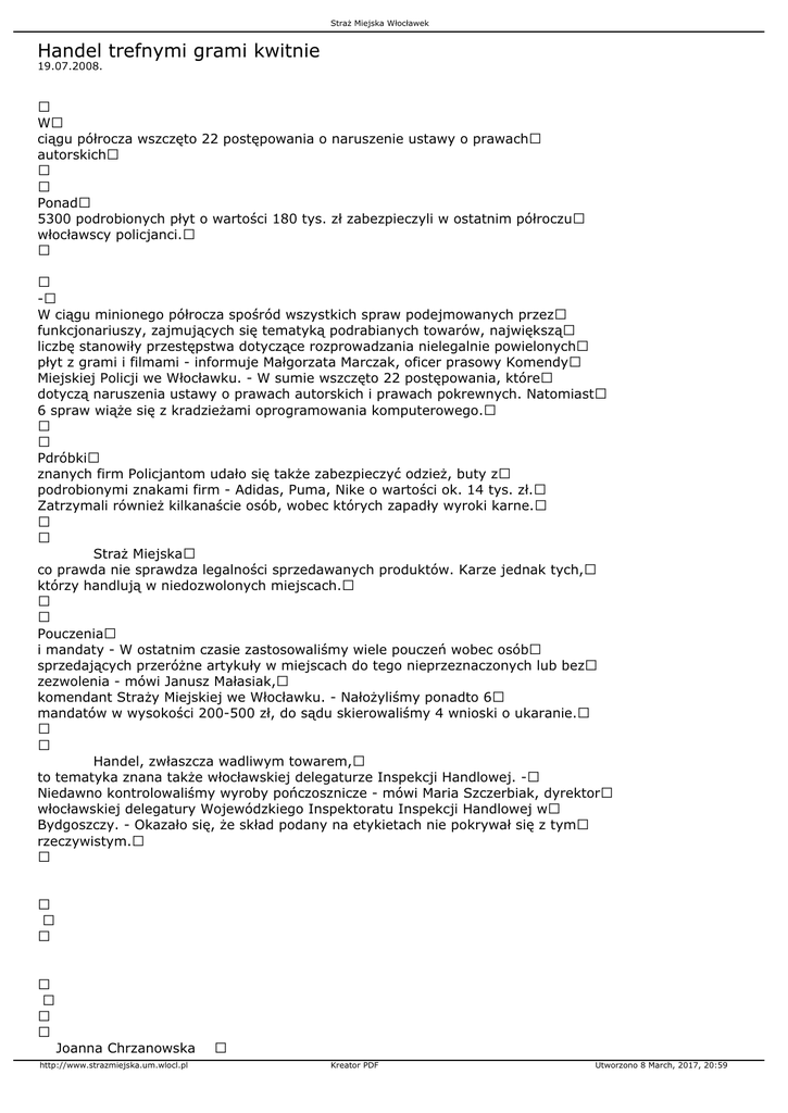 Straż Miejska Włocławek Handel trefnymi grami kwitnie 19.07.2008. W ciągu półrocza wszczęto 22 postępowania o naruszenie ustawy o prawach autorskich Ponad 5300 podrobionych płyt o wartości 180 tys. zł zabezpieczyli w ostatnim półroczu włocławscy policjanci. - W ciągu minionego półrocza spośród wszystkich spraw podejmowanych przez funkcjonariuszy, zajmujących się tematyką podrabianych towarów, największą liczbę stanowiły przestępstwa dotyczące rozprowadzania nielegalnie powielonych płyt z grami i filmami - informuje Małgorzata Marczak, oficer prasowy Komendy Miejskiej Policji we Włocławku. - W sumie wszczęto 22 postępowania, które dotyczą naruszenia ustawy o prawach autorskich i prawach pokrewnych. Natomiast 6 spraw wiąże się z kradzieżami oprogramowania komputerowego. Pdróbki znanych firm Policjantom udało się także zabezpieczyć odzież, buty z podrobionymi znakami firm - Adidas, Puma, Nike o wartości ok. 14 tys. zł. Zatrzymali również kilkanaście osób, wobec których zapadły wyroki karne. Straż Miejska co prawda nie sprawdza legalności sprzedawanych produktów. Karze jednak tych, którzy handlują w niedozwolonych miejscach. Pouczenia i mandaty - W ostatnim czasie zastosowaliśmy wiele pouczeń wobec osób sprzedających przeróżne artykuły w miejscach do tego nieprzeznaczonych lub bez zezwolenia - mówi Janusz Małasiak, komendant Straży Miejskiej we Włocławku. - Nałożyliśmy ponadto 6 mandatów w wysokości 200-500 zł, do sądu skierowaliśmy 4 wnioski o ukaranie. Handel, zwłaszcza wadliwym towarem, to tematyka znana także włocławskiej delegaturze Inspekcji Handlowej. - Niedawno kontrolowaliśmy wyroby pończosznicze - mówi Maria Szczerbiak, dyrektor włocławskiej delegatury Wojewódzkiego Inspektoratu Inspekcji Handlowej w Bydgoszczy. - Okazało się, że skład podany na etykietach nie pokrywał się z tym rzeczywistym. Joanna Chrzanowska http://www.strazmiejska.um.wlocl.pl Kreator PDF Utworzono 8 March, 2017, 20:59 Straż Miejska Włocławek 19.7.2008 Nowości str. 7 Włocławek http://www.strazmiejska.um.wlocl.pl Kreator PDF Utworzono 8 March, 2017, 20:59