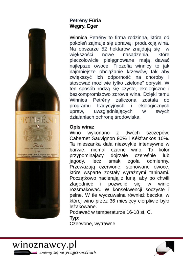 Petrény Fúria Węgry, Eger Winnica Petrény to firma rodzinna, która od pokoleń zajmuje się uprawą i produkcją wina. Na obszarze 52 hektarów znajdują się w większości nowe nasadzenia, które pieczołowicie pielęgnowane mają dawać najlepsze owoce. Filozofia winnicy to jak najmniejsze obciążanie krzewów, tak aby zwiększyć ich odporność na choroby i stosować możliwie tylko „zielone” opryski. W ten sposób rodzą się czyste, ekologiczne i bezkompromisowo zdrowe wina. Dzięki temu Winnica Petrény zaliczona została do programu tradycyjnych i ekologicznych upraw, uwzględniających w swych działaniach ochronę środowiska. Opis wina: Wino wykonano z dwóch szczepów: Cabernet Sauvignon 90% i Kékfrankos 10%. Ta mieszanka dała niezwykle intensywne w barwie, niemal czarne wino. To kolor przypominający dojrzałe czereśnie lub jagody, lecz smak zgoła odmienny. Przeważają czerwone, stonowane owoce, które wsparte zostały wyraźnymi taninami. Początkowo nacierają z furią, aby po chwili złagodnieć i pozwolić się w winie rozsmakować. W konsekwencji soczyste i pełne. W tle wyczuwalna również beczka, w której wino przez 36 miesięcy cierpliwie było leżakowane. Podawać w temperaturze 16-18 st. C. Typ: Czerwone, wytrawne
