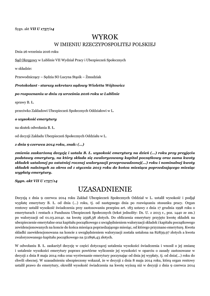 Sygn. akt VII U 1757/14 WYROK W IMIENIU RZECZYPOSPOLITEJ POLSKIEJ Dnia 26 września 2016 roku Sąd Okręgowy w Lublinie VII Wydział Pracy i Ubezpieczeń Społecznych w składzie: Przewodniczący – Sędzia SO Lucyna Stąsik – Żmudziak Protokolant - starszy sekretarz sądowy Wioletta Wójtowicz po rozpoznaniu w dniu 19 września 2016 roku w Lublinie sprawy B. Ł. przeciwko Zakładowi Ubezpieczeń Społecznych Oddziałowi w L. o wysokość emerytury na skutek odwołania B. Ł. od decyzji Zakładu Ubezpieczeń Społecznych Oddziału w L. z dnia 9 czerwca 2014 roku, znak: (...) zmienia zaskarżoną decyzję i ustala B. Ł. wysokość emerytury na dzień (...) roku przy przyjęciu podstawy emerytury, na który składa się zwaloryzowany kapitał początkowy oraz suma kwoty składek ustalonej po ostatniej rocznej waloryzacji przeprowadzonej(...) roku i nominalnej kwoty składek należnych za okres od 1 stycznia 2013 roku do końca miesiąca poprzedzającego miesiąc wypłaty emerytury. Sygn. akt VII U 1757/14 UZASADNIENIE Decyzją z dnia 9 czerwca 2014 roku Zakład Ubezpieczeń Społecznych Oddział w L. ustalił wysokość i podjął wypłatę emerytury B. Ł. od dnia (...) roku, tj. od następnego dnia po rozwiązaniu stosunku pracy. Organ rentowy ustalił wysokość świadczenia przy zastosowaniu przepisu art. 183 ustawy z dnia 17 grudnia 1998 roku o emeryturach i rentach z Funduszu Ubezpieczeń Społecznych (tekst jednolity: Dz. U. z 2013 r., poz. 1440 ze zm.) po waloryzacji od 01.03.2014r. na kwotę 2598,38 złotych. Do obliczenia emerytury przyjęto kwotę składek na ubezpieczenie emerytalne oraz kapitału początkowego z uwzględnieniem waloryzacji składek i kapitału początkowego zewidencjonowanych na koncie do końca miesiąca poprzedzającego miesiąc, od którego przyznano emeryturę. Kwota składki zaewidencjonowana na koncie z uwzględnieniem waloryzacji została ustalona na 82839,97 złotych a kwota zwaloryzowanego kapitału początkowego na 511896,43 złotych. W odwołaniu B. Ł. zaskarżył decyzję w części dotyczącej ustalenia wysokości świadczenia i wnosił o jej zmianę i ustalenie wysokości emerytury poprzez powtórne wyliczenie jej wysokości w oparciu o zasady zastosowane w decyzji z dnia 8 maja 2014 roku oraz wyrównanie emerytury poczynając od dnia jej wypłaty, tj. od dnia(...) roku do chwili obecnej. W uzasadnieniu ubezpieczony wskazał, że w decyzji z dnia 8 maja 2014 roku, którą organ rentowy ustalił prawo do emerytury, określił wysokość świadczenia na kwotę wyższą niż w decyzji z dnia 9 czerwca 2014 roku. Skarżący wskazał, że kwota składek zaewidencjonowanych na jego koncie emerytalnym z uwzględnieniem waloryzacji została przez organ określona na poziomie 89008,14 złotych, zaś kwota zwaloryzowanego kapitału początkowego na poziomie 569943,91 złotych. Natomiast w decyzji z dnia 9 czerwca 2014 roku odpowiednio na poziomie 82839,97 złotych oraz 511896,43 złotych, co w jego ocenie skutkowało zaniżeniem świadczenia o około 200 złotych. Przyjęty przez organ rentowy w zaskarżonej decyzji sposób ustalenia wysokości emerytury ubezpieczony uznał za niesprawiedliwy podnosząc jednocześnie, że organ powinien określić wysokość świadczenia w oparciu o zasady przyjęte w decyzji z dnia 8 maja 2014 roku, mając na względzie należytą waloryzację kapitału początkowego i waloryzację (odwołanie – k. 2 – 3 akt sądowych). W odpowiedzi na odwołanie organ rentowy wnosił o jego oddalenie, jednocześnie podnosząc, że różnica w wysokości kwot zwaloryzowanych składek zaewidencjonowanych na indywidualnym koncie emerytalnym ubezpieczonego oraz kapitału początkowego w decyzji z dnia 9 czerwca 2014 roku i z dnia 8 maja 2014 roku wynika z faktu, iż w decyzji z dnia 8 maja 2014 roku, przyznającej prawo do emerytury od dnia (...) dokonano waloryzacji kwartalnej w oparciu o przepis art. 25a ust. 1 ustawy FUS, a w zaskarżonej decyzji z dnia 9 czerwca 2014 roku Zakład przeprowadził waloryzację roczną w myśl przepisu art. 25 ust. 3 ustawy FUS (odpowiedź na odwołanie – k. 4 – 5v. a.s.). Sąd Okręgowy ustalił, co następuje: Decyzją z dnia 18 sierpnia 2008 roku Zakład (...) Oddział w L. ustalił wartość kapitału początkowego ubezpieczonego na dzień 1 stycznia 1999 roku na kwotę 167477,97 złotych. Do ustalenia wartości kapitału organ rentowy przyjął podstawę wymiaru kapitału początkowego w kwocie 1467,63 złotych, okresy składkowe w łącznym wymiarze 28 lat, 10 miesięcy i 8 dni, tj. 346 miesięcy oraz okresy nieskładkowe w łącznym wymiarze 2 miesięcy i 16 dni, tj. 2 miesięcy, współczynnik proporcjonalny do osiągniętego do dnia 31 grudnia 1998 roku oraz okresów składkowych i nieskładkowych w wysokości 85,15 % oraz średnie dalsze trwanie życia w wymiarze 209 miesięcy (decyzja – k. 71 akt dotyczących ustalenia kapitału początkowego). Kolejną decyzją z dnia 29 kwietnia 2014 roku ZUS wobec nabycia przez skarżącego prawa do emerytury na podstawie art. 184 ustawy FUS ponownie ustalił wartość kapitału początkowego na dzień 1 stycznia 1999 roku, dodając do udowodnionych okresów składkowych okres różnicy pomiędzy wiekiem emerytalnym wynoszącym (...)a faktycznym wiekiem przejścia na emeryturę przez skarżącego, wynoszącym (...) Dodany okres składkowy wyrażonych w pełnych miesiącach wynosił 67 miesięcy. Wartość kapitału początkowego na dzień 1 stycznia 1999 roku w wyniku dokonanego przez organ dodania do udowodnionych okresów składkowych okresu będącego wypadkową różnicy wyżej wskazanych wartości wynosiła 189801,26 złotych (decyzja – k. 81 akt dotyczących ustalenia kapitału początkowego). W kolejnej decyzji z dnia 28 maja 2014 roku Zakład ponownie ustalił wartość kapitału początkowego na dzień 1 stycznia 1999 roku. Organ rentowy dodał do udowodnionych okresów składkowych okres różnicy pomiędzy wiekiem emerytalnym wynosz